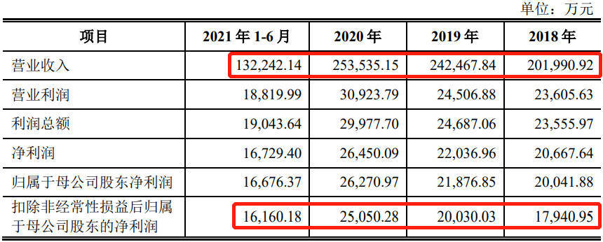 报告期内,发行人的营业收入为20.20亿元、24.25亿元、25.35亿元、13.22亿元,2019年、2020年增幅为20.05%、4.54%;扣非归母净利润为1.79亿元、2.00亿元、2.51亿元、1.62亿元,2019年、2020年增幅为11.73%、25.50%。