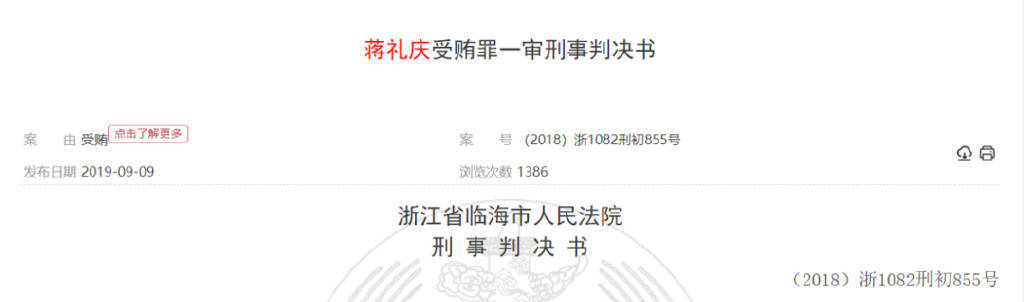 据浙江省临海市人民法院刑事判决书(2018)浙1082刑初855号文件显示,2015年下半年至2018年6月,被告人蒋礼庆在担任临海市玉岘卫生院负责人期间,利用职务便利,在药品引进和药品维护方面给多名医药公司业务员提供帮助,并收受医药公司业务员所送财物共计人民币(币种下同)约6.5万元。