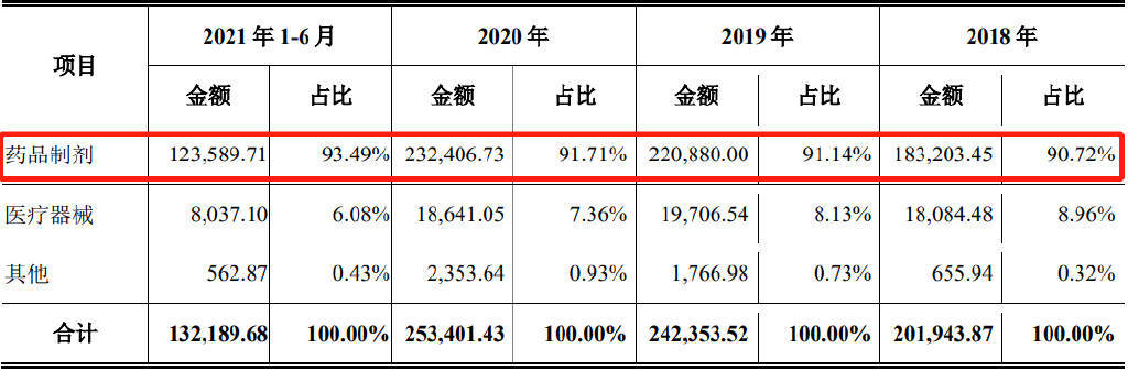 报告期内,发行人的主营业务突出,主营业务收入占比在99.95%以上,公司主营业务收入主要来源于药品制剂收入,药品制剂收入占主营业务收入比例分别为90.72%、91.14%、91.71%、93.49%。