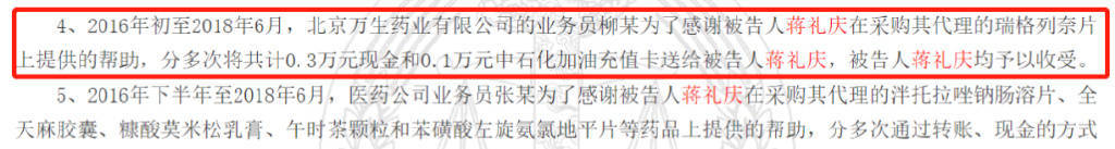 其中,2016年初至2018年6月,北京万生药业有限公司(发行人前身)的业务员柳某为了感谢被告人蒋礼庆在采购其代理的瑞格列奈片上提供的帮助,分多次将共计0.3万元现金和0.1万元中石化加油充值卡送给被告人蒋礼庆,被告人蒋礼庆均予以收受。