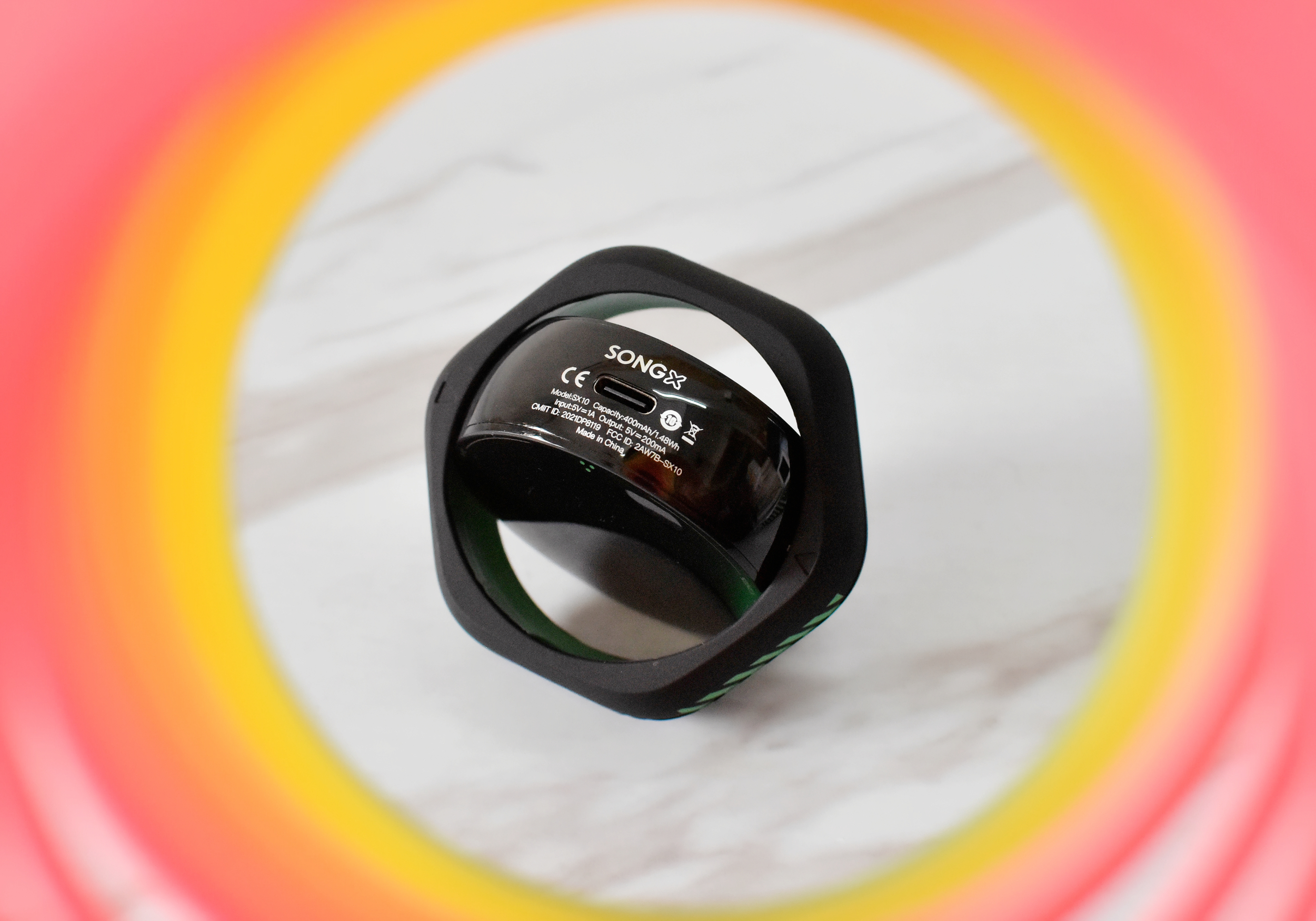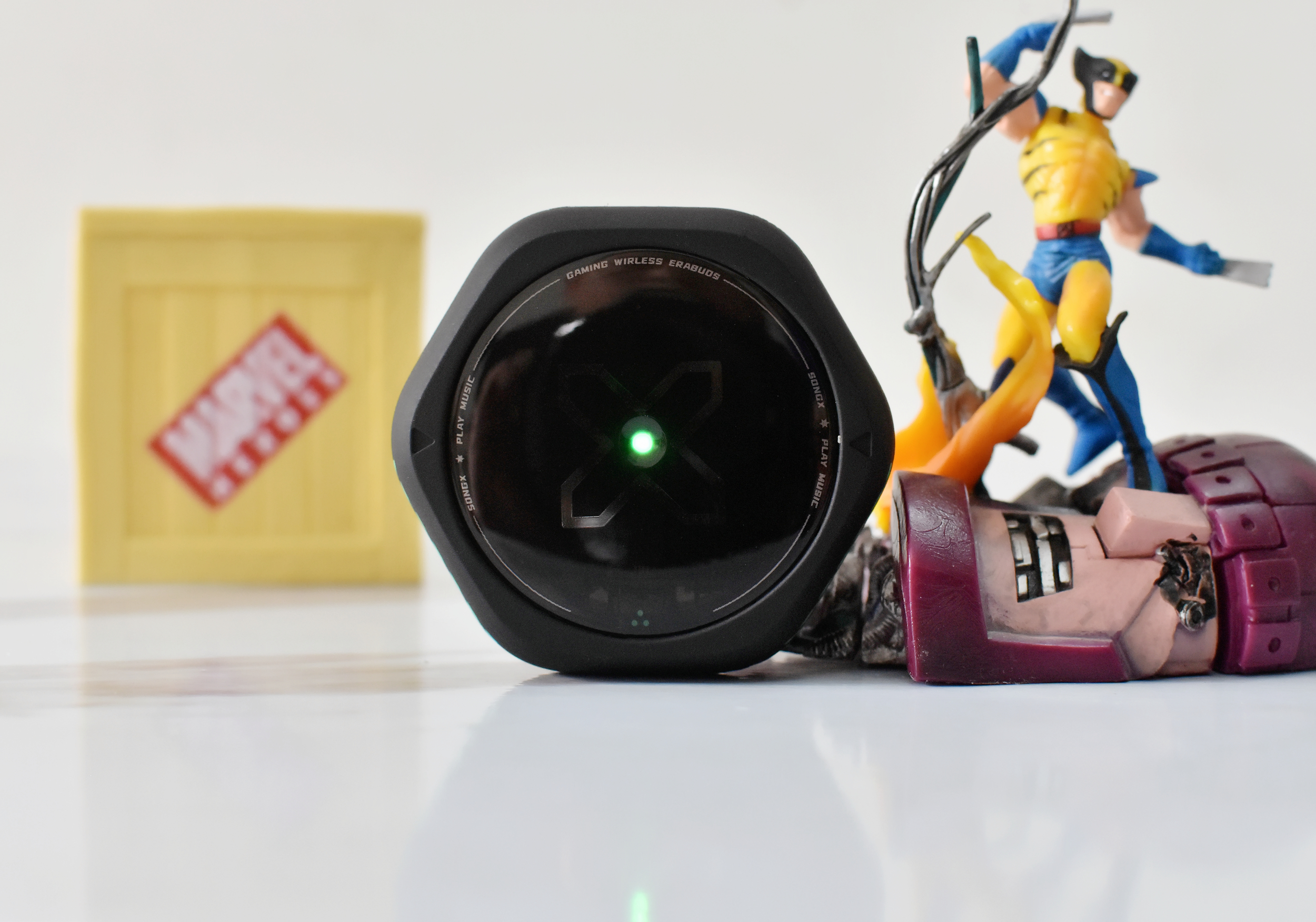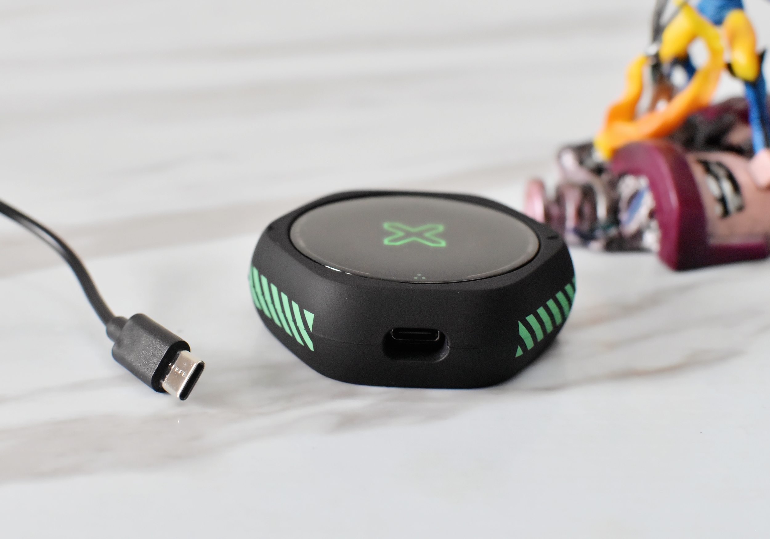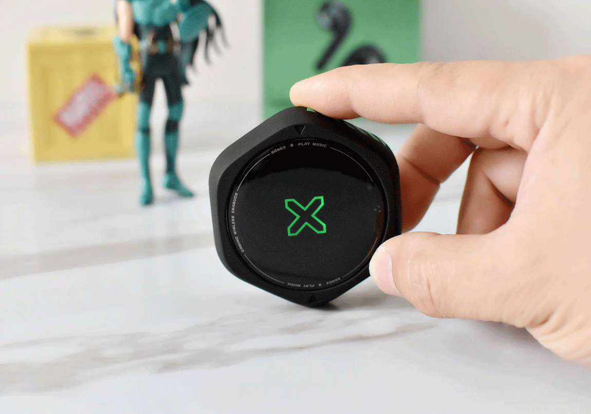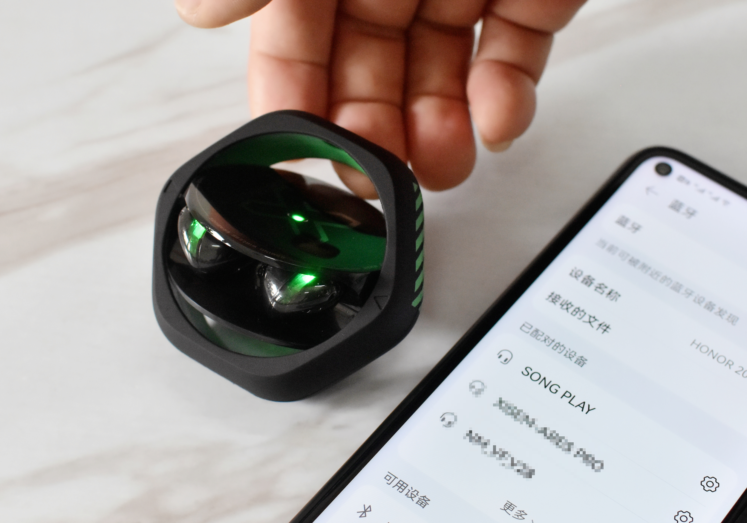 SONG PLAY的充电仓为六边形设计,外观赛博风十足,边框防滑耐磨,握在手中的触感非常舒适。中间采用圆形亮光表面处理,中间的位置是指示灯和专属的X符号,旋转开盖的时候伴随专属的呼吸灯效,非常炫酷,同时还能通过绿灯、蓝+绿、红灯显示不同电量水平。