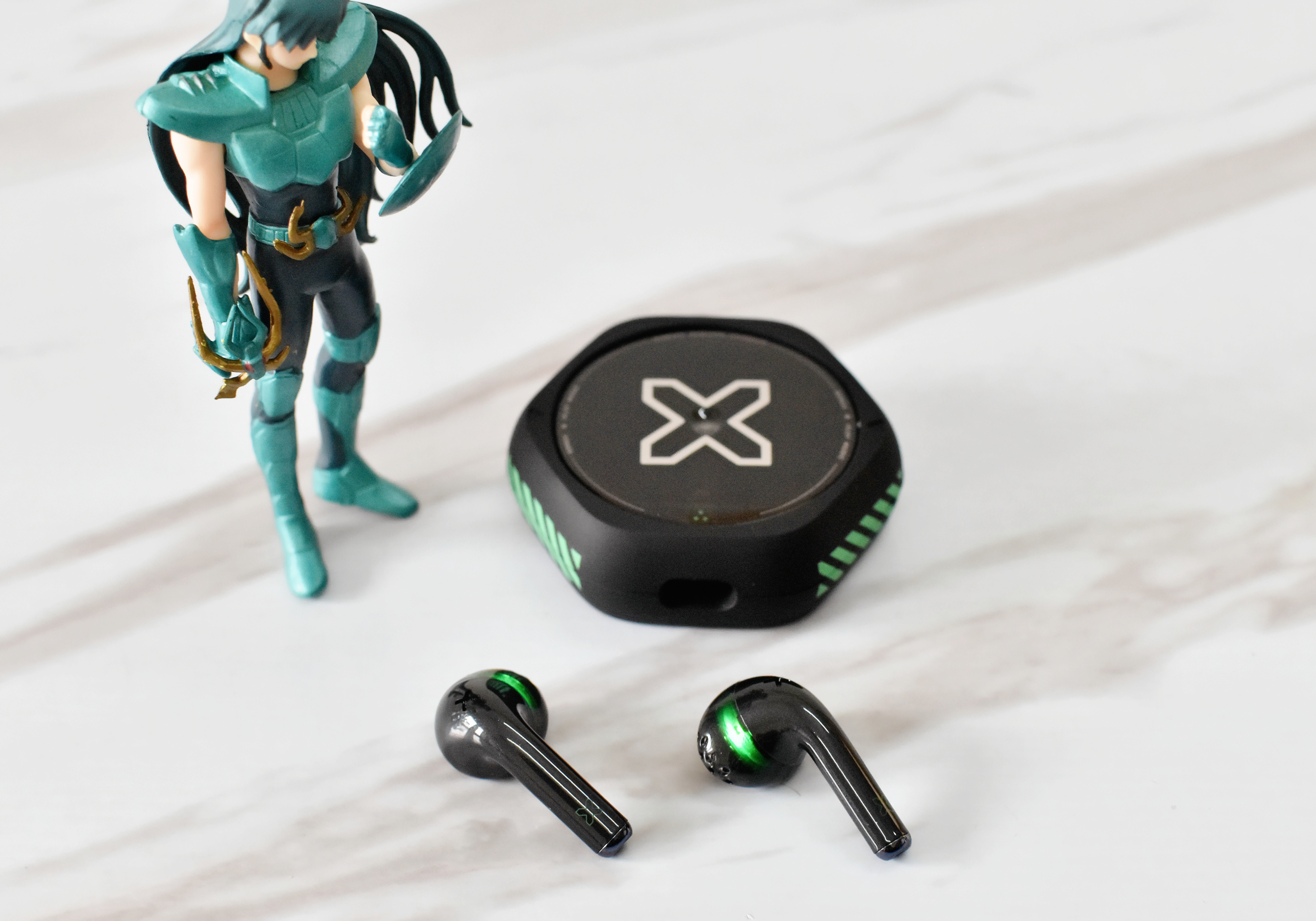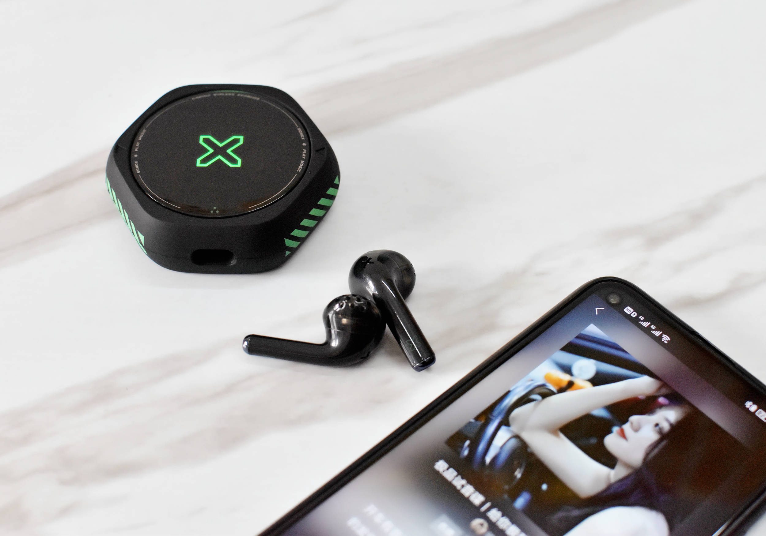 在耳机正面顶部有便捷操控的触控区域,左右耳机的操作功能完全相同,可以用来控制音量加减、接听/挂断电话、播放暂停、切换歌曲和唤醒语音助手等功能,长按还可以切换游戏模式和音乐模式。