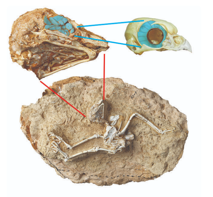通过化石,古生物学家是怎么推测出中新猛鸮的习性的呢?原来在中新猛鸮头骨的眼窝里,古生物学家发现了一些陷入其中的梯形小骨片,这些小骨共有16块片,名为巩膜小骨,能够组成环形的巩膜环。巩膜环在眼睛的后面,作用是支撑和加固眼睛的。有了巩膜环,古生物学家就可以复原和测算中新猛鸮眼睛和瞳孔的直径啦,而得到了这两个数值又可以推测其习性。