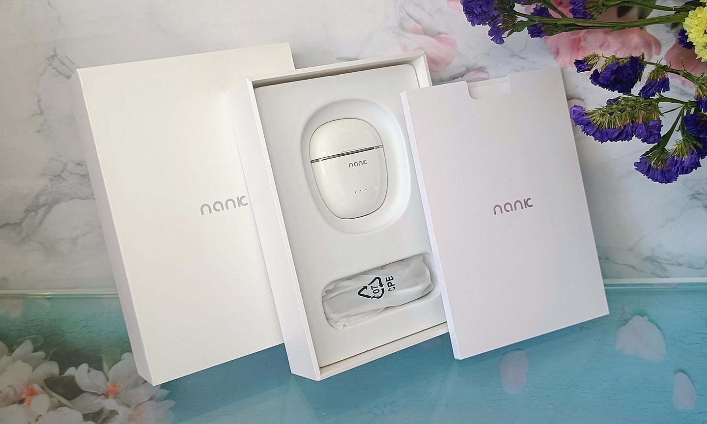 包装盒采用双层设计,最外层是纸套封。内盒采用天地盖结构,通体纯白,上盖印有NANK品牌LOGO;打开盒盖,盒内最上方是用于盛放产品说明书的纸盒,下方是一个白色塑料托盘,内置两个凹槽,分别用于固定Lite Pro2的充电盒和充电线。