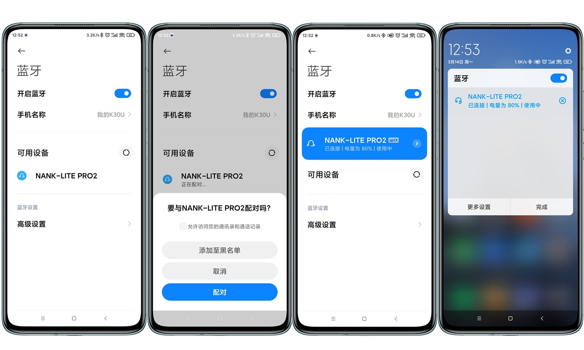 耳机进入待配对模式后,打开手机蓝牙界面,会自动识别出“NANK-LITE PRO2”设备名称,点击弹出的配对提示窗,配对成功。耳机采用了是蓝牙5.2芯片,全面兼容苹果、安卓和WINDOWS系统的手机 、平板或电脑,安卓手机支持aptX高级音频编码格式,苹果手机支持AAC高清解码。