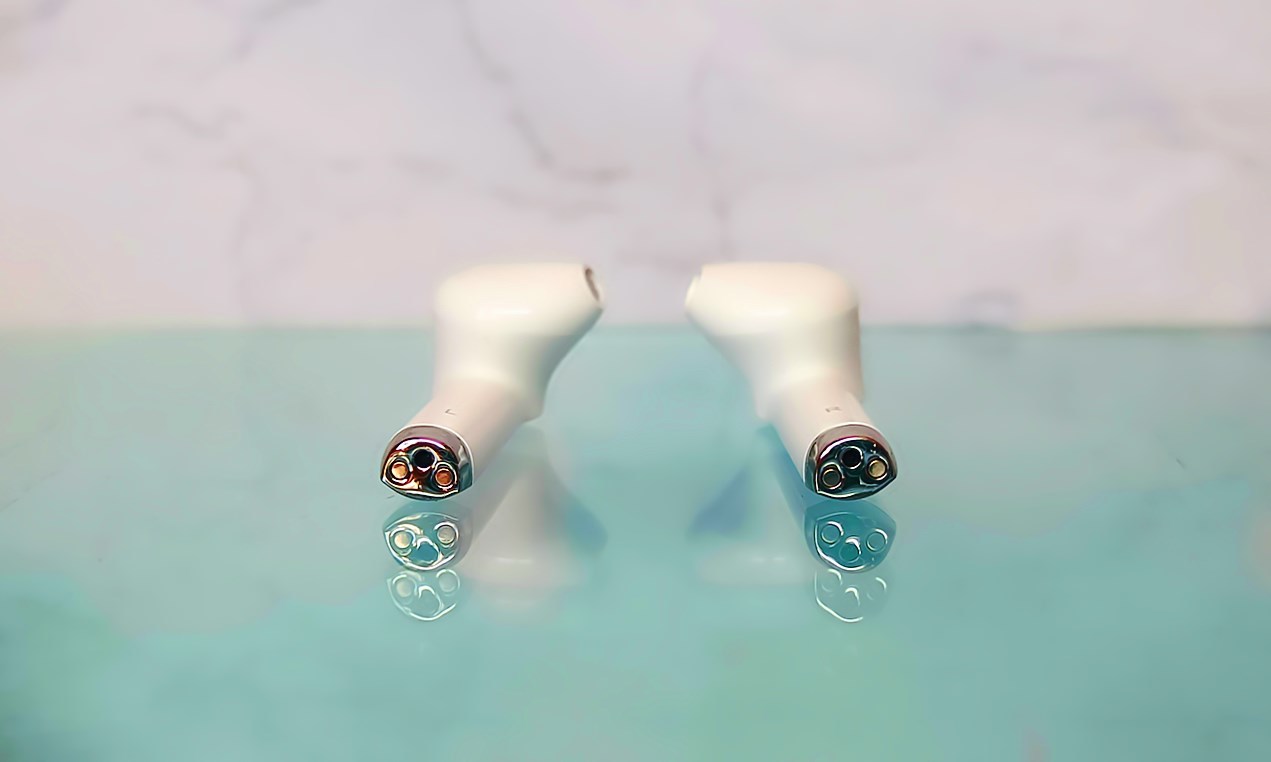 耳机握柄底部是磁吸充电触点和麦克风孔(前麦)。充电触点采用了全新的钯金涂层工艺,避免了传统铜触点易老化、氧化的缺点,大幅提升产品充电性能,抗氧化、耐腐蚀。此处的麦克风口为前麦,指向嘴部,主要用于拾取人声。