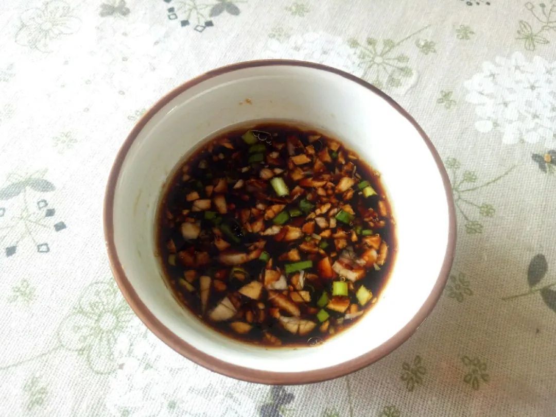 9.用醋、味极鲜、生抽、香油加蒜沫、小葱沫、喜欢吃辣的可以再加油泼辣子,做成蘸料汁。