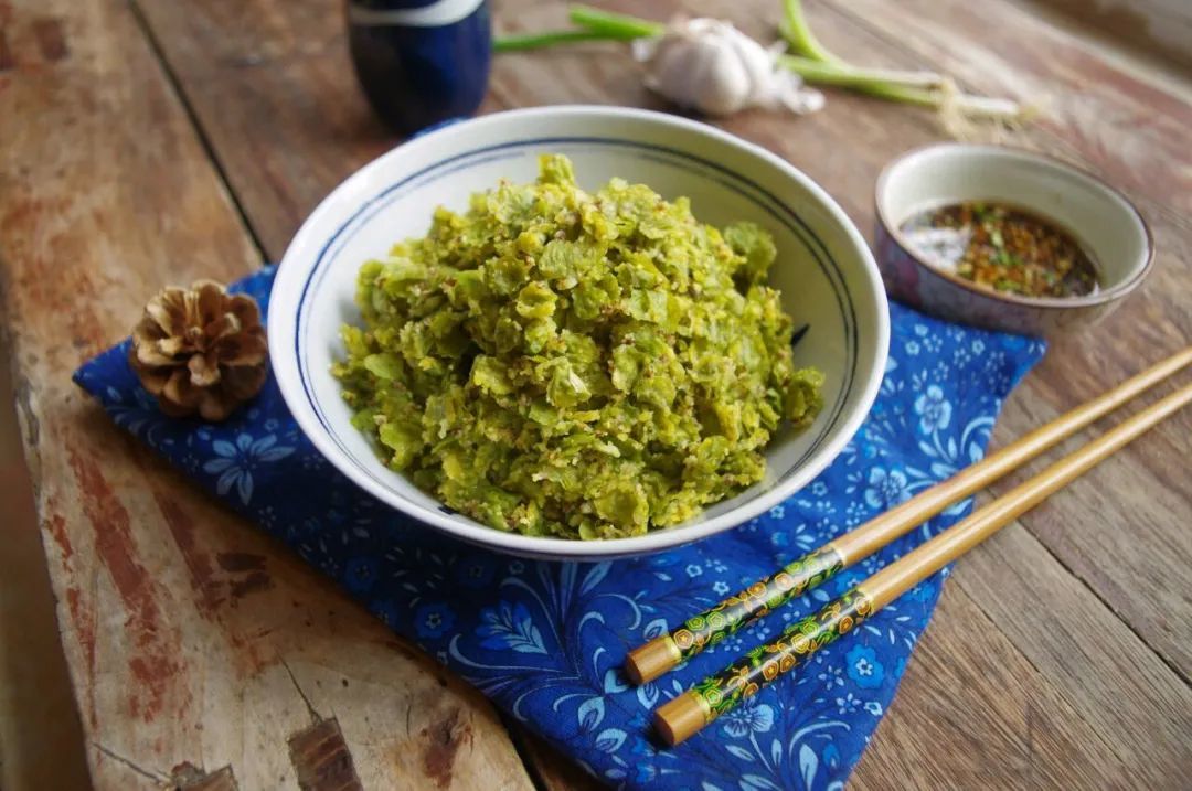 新鲜的榆钱摘回来,混合玉米面蒸熟,揭开锅盖,春的气息扑面而来。再配上用蒜汁和酱油醋调成的调料,滴上几滴香油,沾着吃,就是那样的爽口,那样的清香。