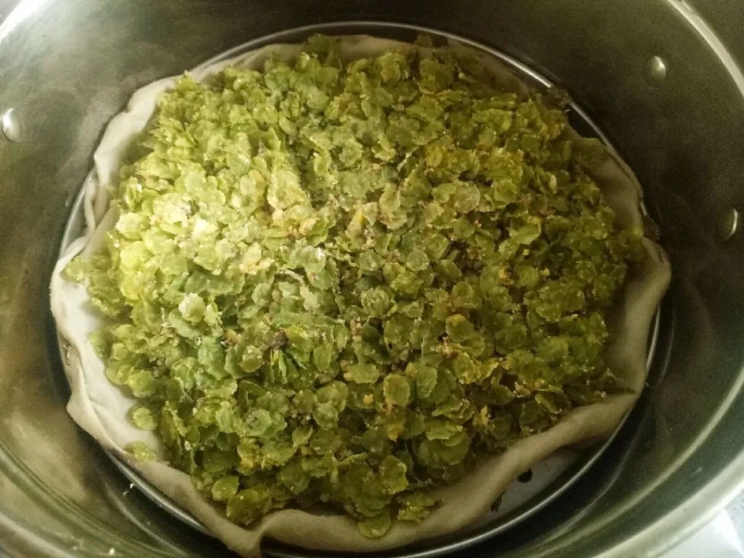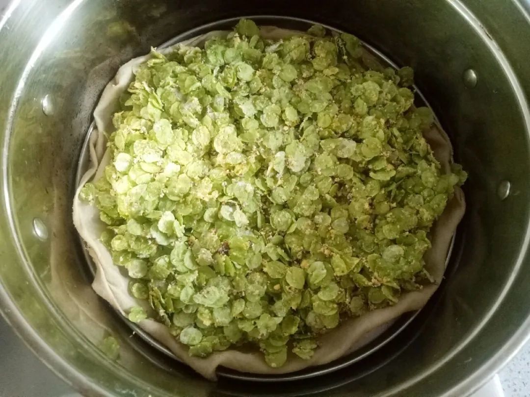 7. 蒸锅铺好屉布,把拌好的榆钱均匀平铺在屉布上。