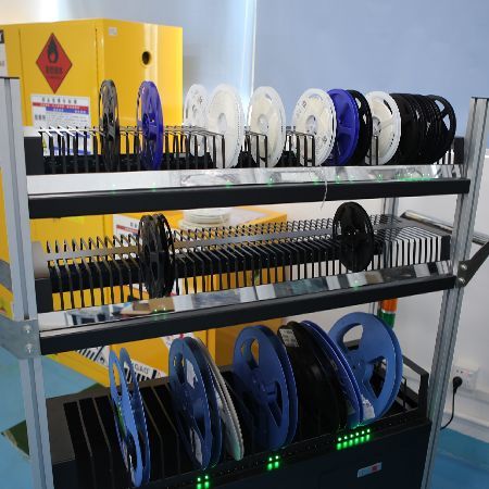 智能料架采用了智能灯光拣选技术,可以帮助用户拣选的准确性和效率。通过不同的颜色的灯光指引指导操作人员进行料盘拣选、分类,出库,入库。智能料架还可以和用户系统软件配合使用,可以实现工单管理,补料。智能料架上的不同的颜色实现多工单处理,退库,实时盘点SMT物料全流程管理。智能料架系统通过智能灯光系统帮助用户可以实现电子物料的全面管理。 物料类型包括7-15寸电子料盘,PCB, TRAY盘等. 智能料仓最大存储容量为1400盘。