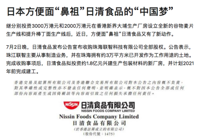 十年后,日清集团开始在中国内地扩张,1994年,日清在广东顺德建厂覆盖华南市场,之后其陆续在福建和浙江建厂,覆盖华东市场,其中浙江平湖的工厂于2017年正式投产,主要覆盖华中、华北市场。只是因为统一和康师傅发展迅猛,日清在中国内地的市场份额不足3%,处于第五、第六的位置。