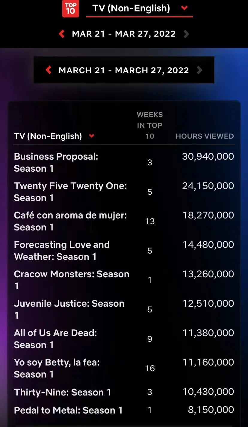 仅就Netflix平台的数据来看,在近期(3月21-27日)的全球非英语剧集播放量排行榜中,前10位的第1、2、4、6、9位全被韩剧包揽。其中,有Netflix主投的原创剧,如《少年法庭》;也有韩国本土电视台主投主控的电视剧,如《二十五,二十一》。
