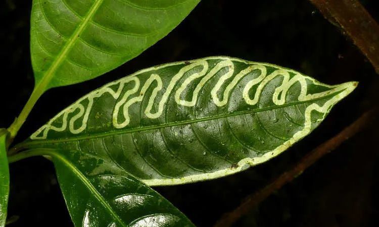 潜叶蝇的成虫会在植物的叶片上产卵,这些卵孵化之后就会有幼虫出来,这些幼虫会钻进叶片里,用它们的嘴不断的吞食植物的汁液,而植物的叶片就只剩下一层表皮,在叶片里面就会形成一些不规则的白色环形隧道。