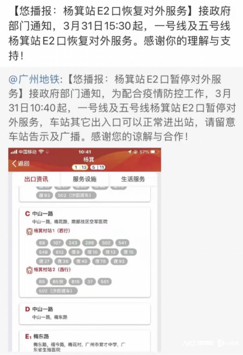 南都讯 记者钟丽婷 实习生罗靖瑜 广州地铁官方微博发布消息:接政府部门通知,3月31日15:30起,一号线及五号线杨箕站E2口恢复对外服务。感谢你的理解与支持!