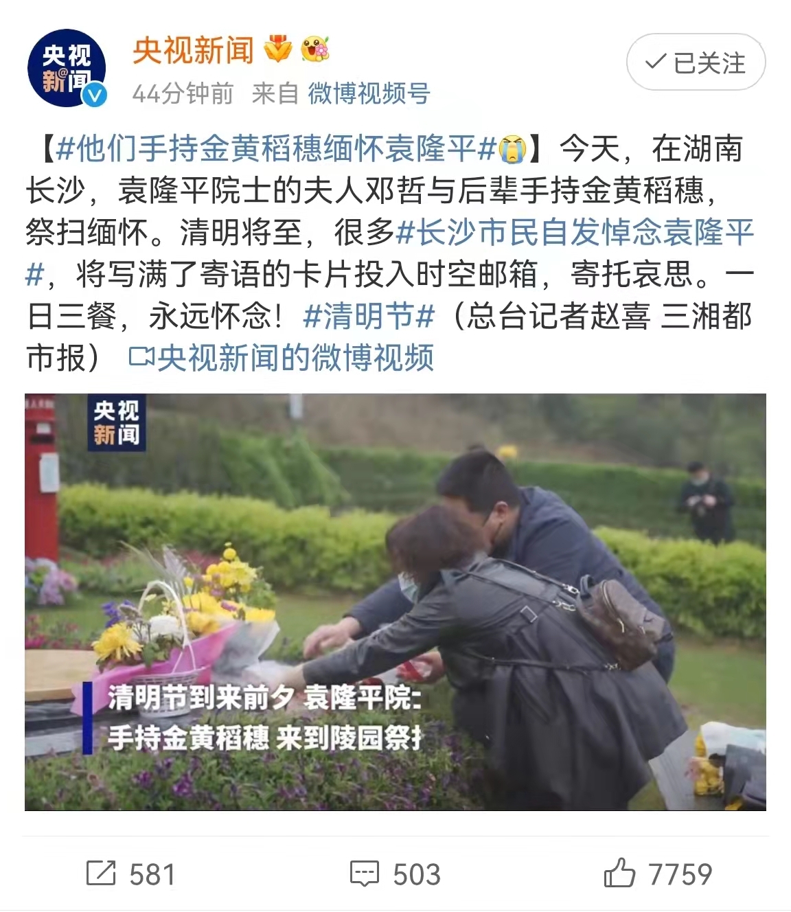 今天,在湖南长沙,袁隆平院士的夫人邓哲与后辈手持金黄稻穗,祭扫缅怀。清明将至,很多#长沙市民自发悼念袁隆平#,将写满了寄语的卡片投入时空邮箱,寄托哀思。