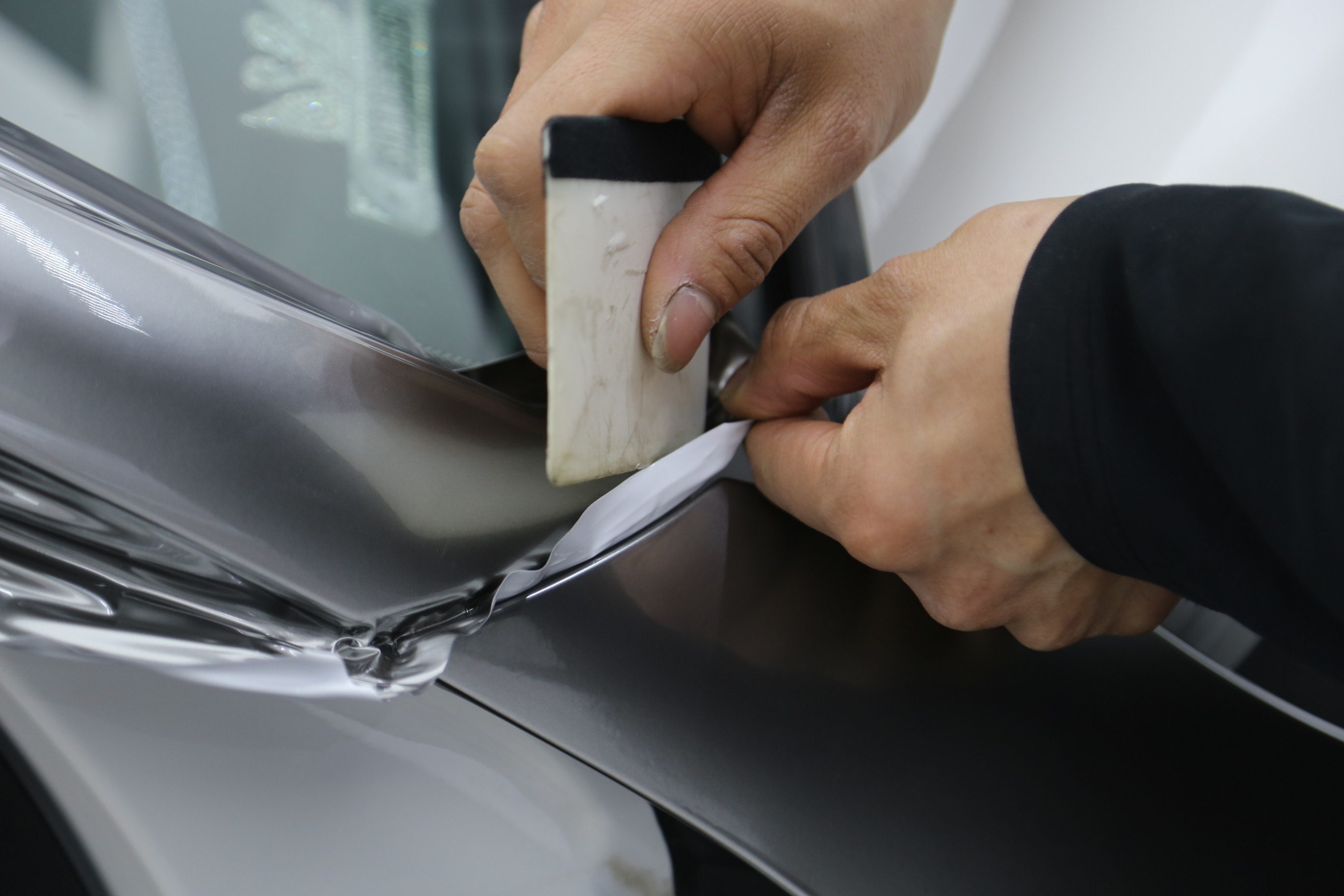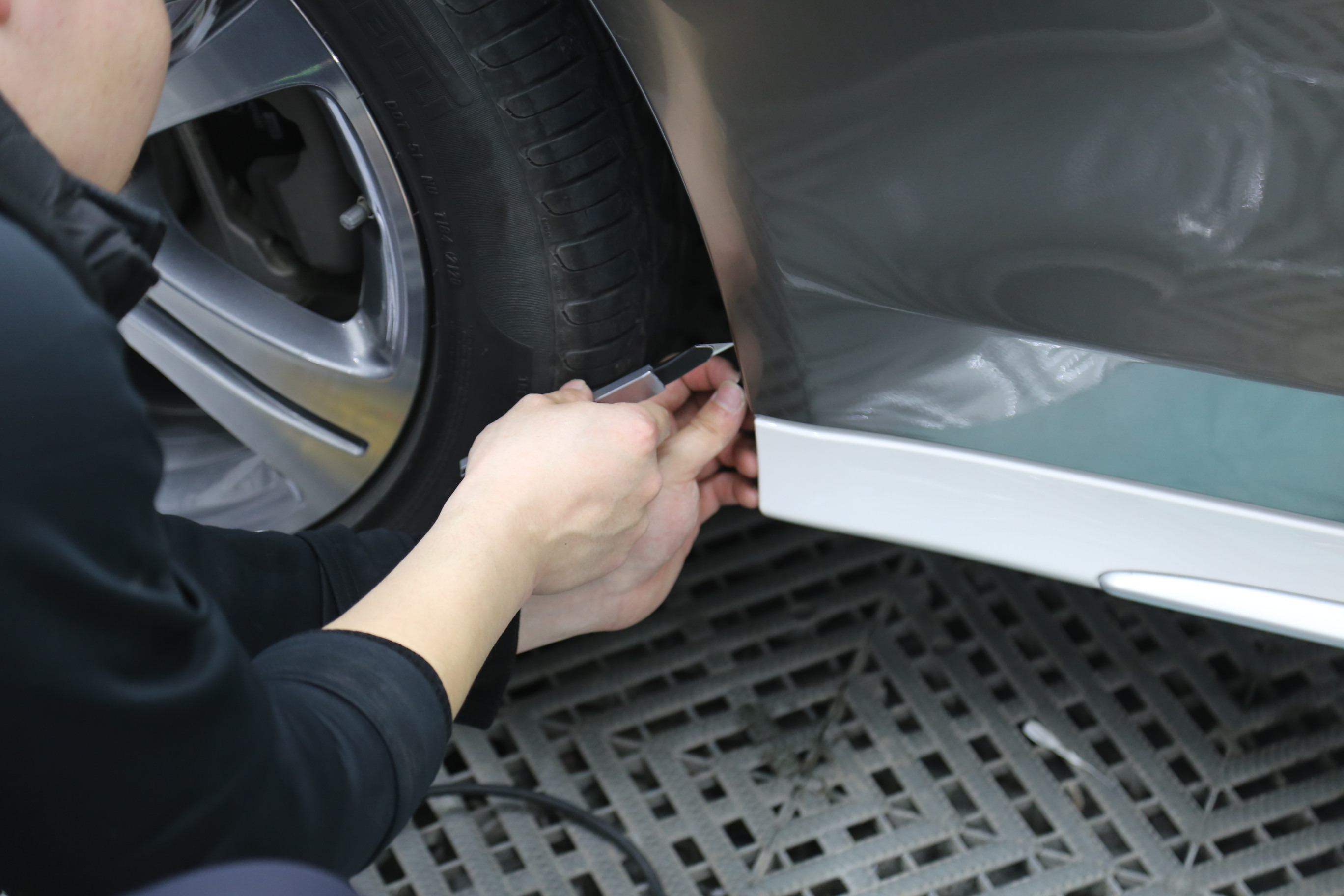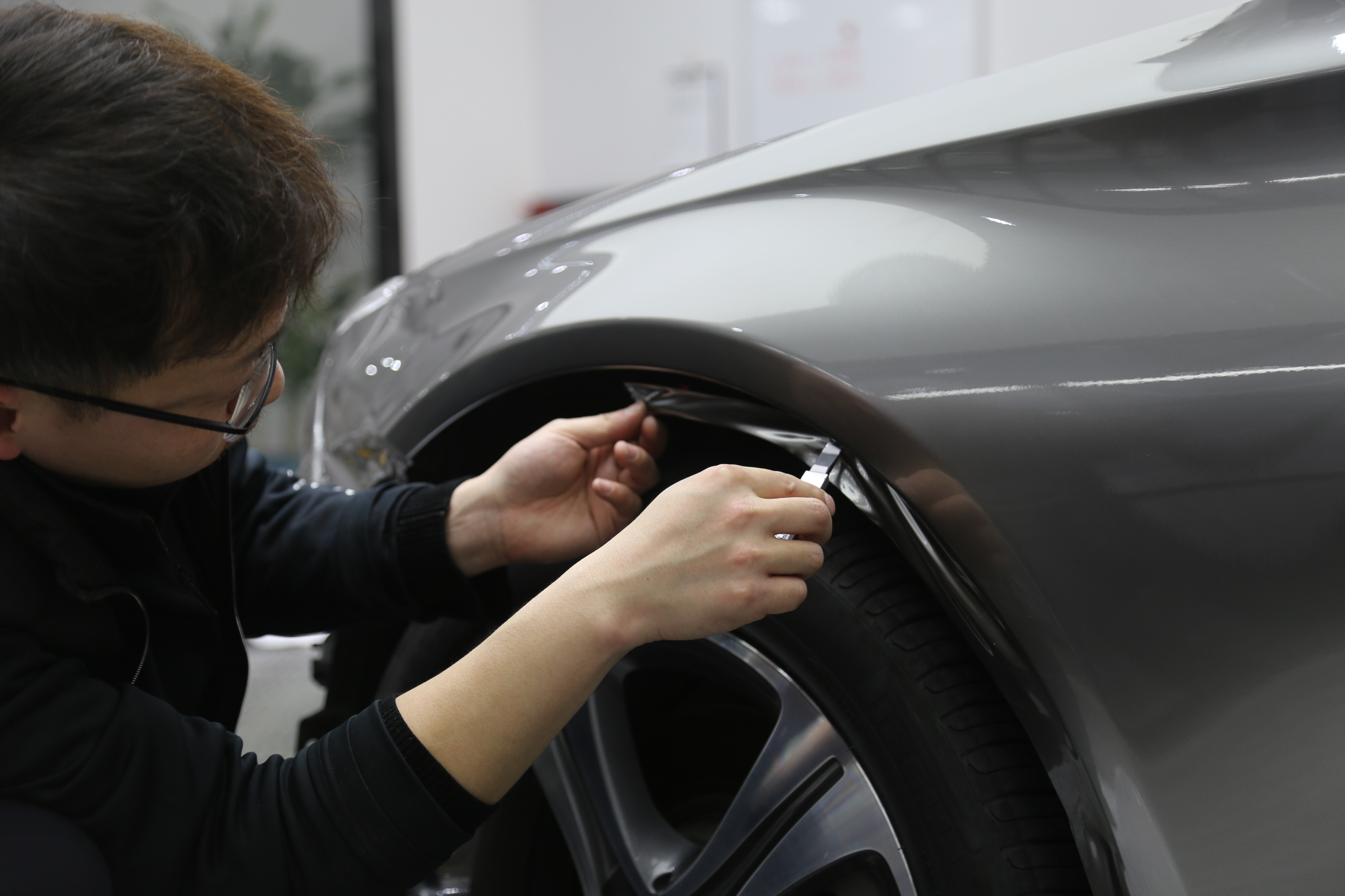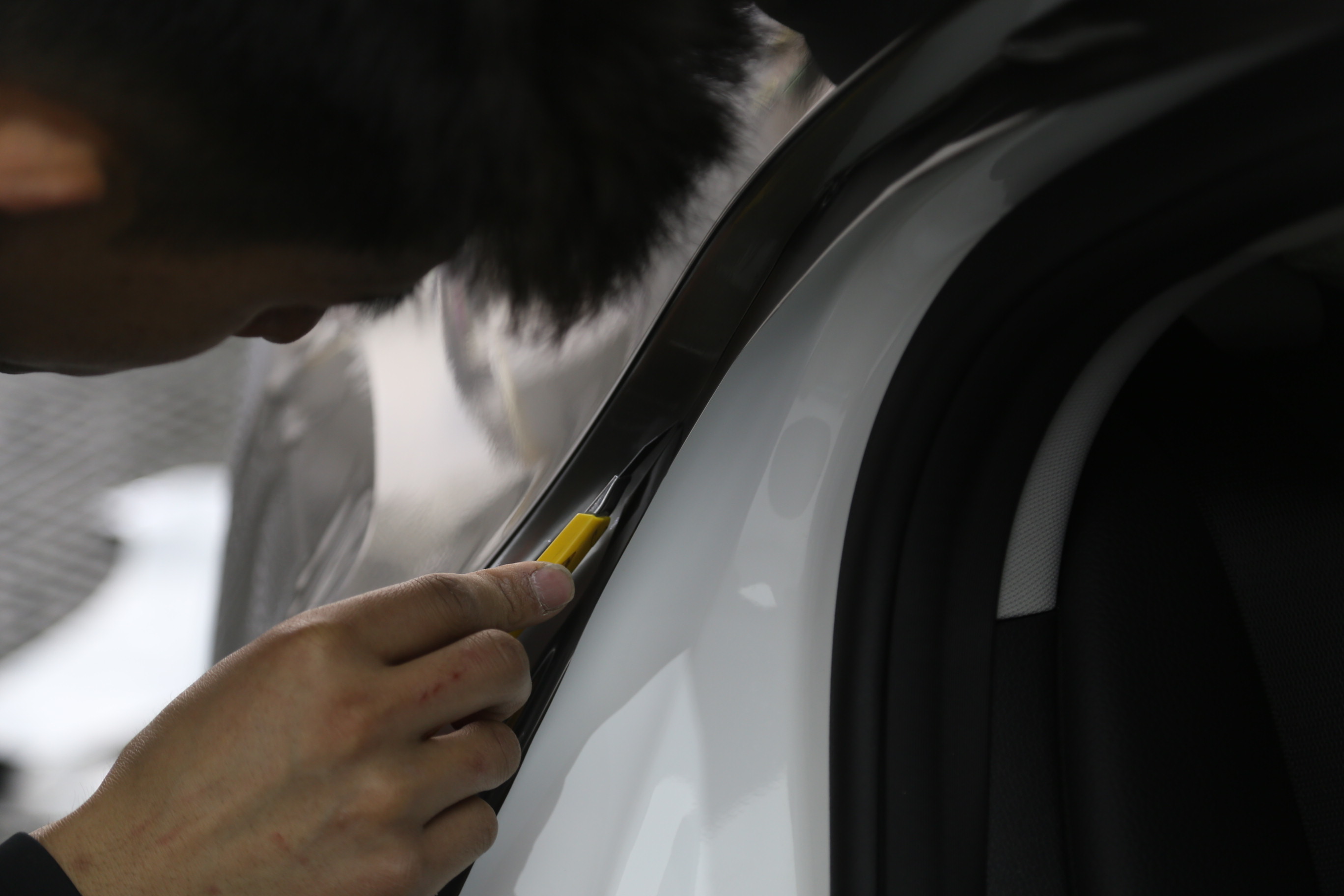 贴膜前的清洗工作非常重要,不仅要把表面的污渍清除干净,还要用软毛刷清洁缝隙,并把肉眼难以识别的水渍及角质等用洗车泥进一步清洁。