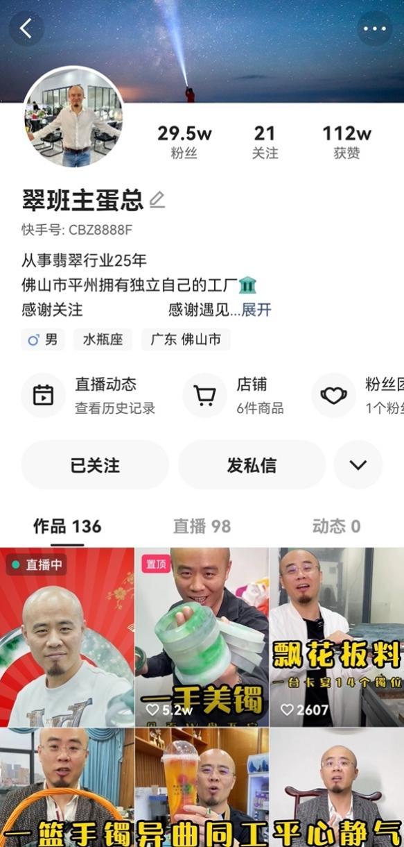 打开快手,进入“翠班主蛋总”账号首页,粉丝不仅可以看到白冰手镯、黄翡手镯、飘花手镯、春带彩手镯等手镯的知识讲解,还可以与蛋总一起进入翡翠工厂,了解翡翠人真实的工作场景。