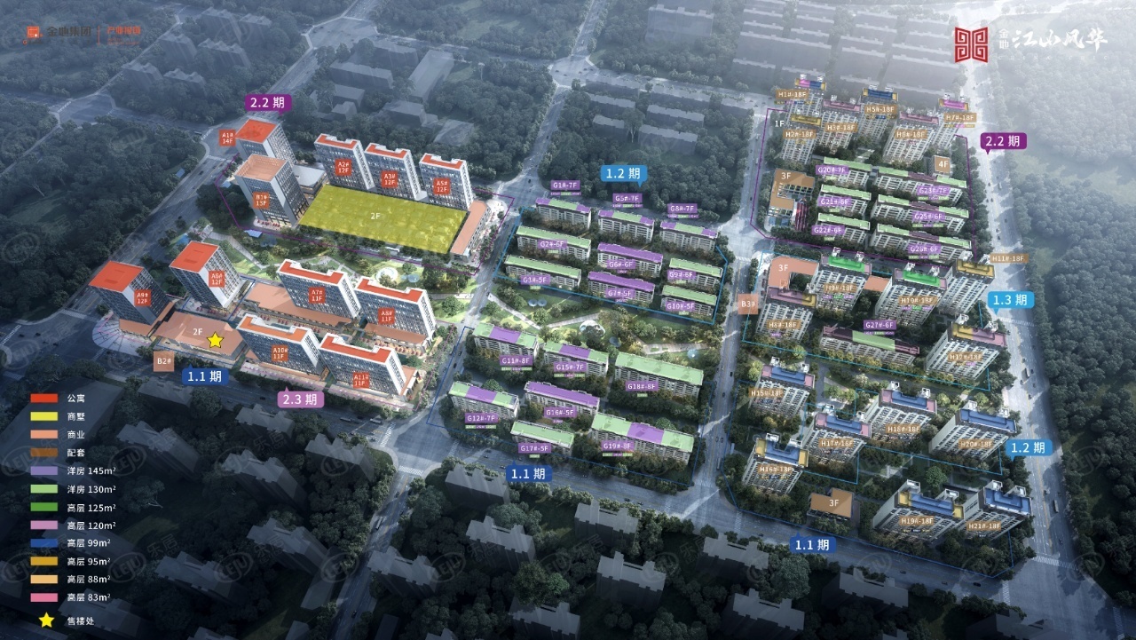 金地江山风华占地17.3万方,建筑面积为34.6万方,容积率为2.0,绿化率为31.93%,园区规划楼宇共为55栋,住宅共计规划18栋小高层,18层封顶,建面约95-120㎡。23栋洋房,5-8层封顶,建面约130-145㎡。住宅共计可容纳1972户,为首府新区板块少有的低密社区。