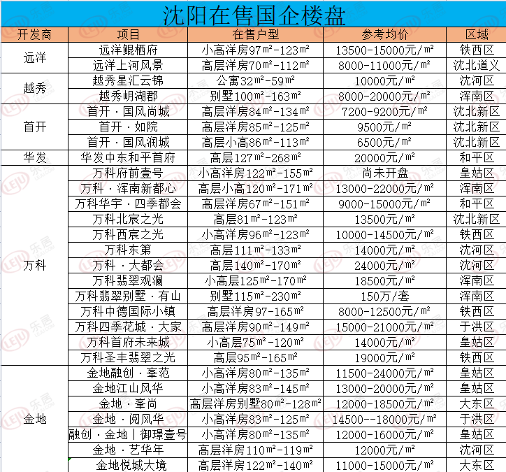 据不完全统计,目前沈阳在售国企楼盘共有28个,分布在沈阳8个城区中,在沈北新区和皇姑区各为5盘,沈河区、浑南区和铁西区各为4盘。户型产品多样化,不少项目采用高层洋房组合如首开、万科等。在价格方面其差距也是较大的,参考均价最高的项目为金地融创·峯范,均价约24000元/平,价格较低的也有首开·国风润城均价约6500元/平。