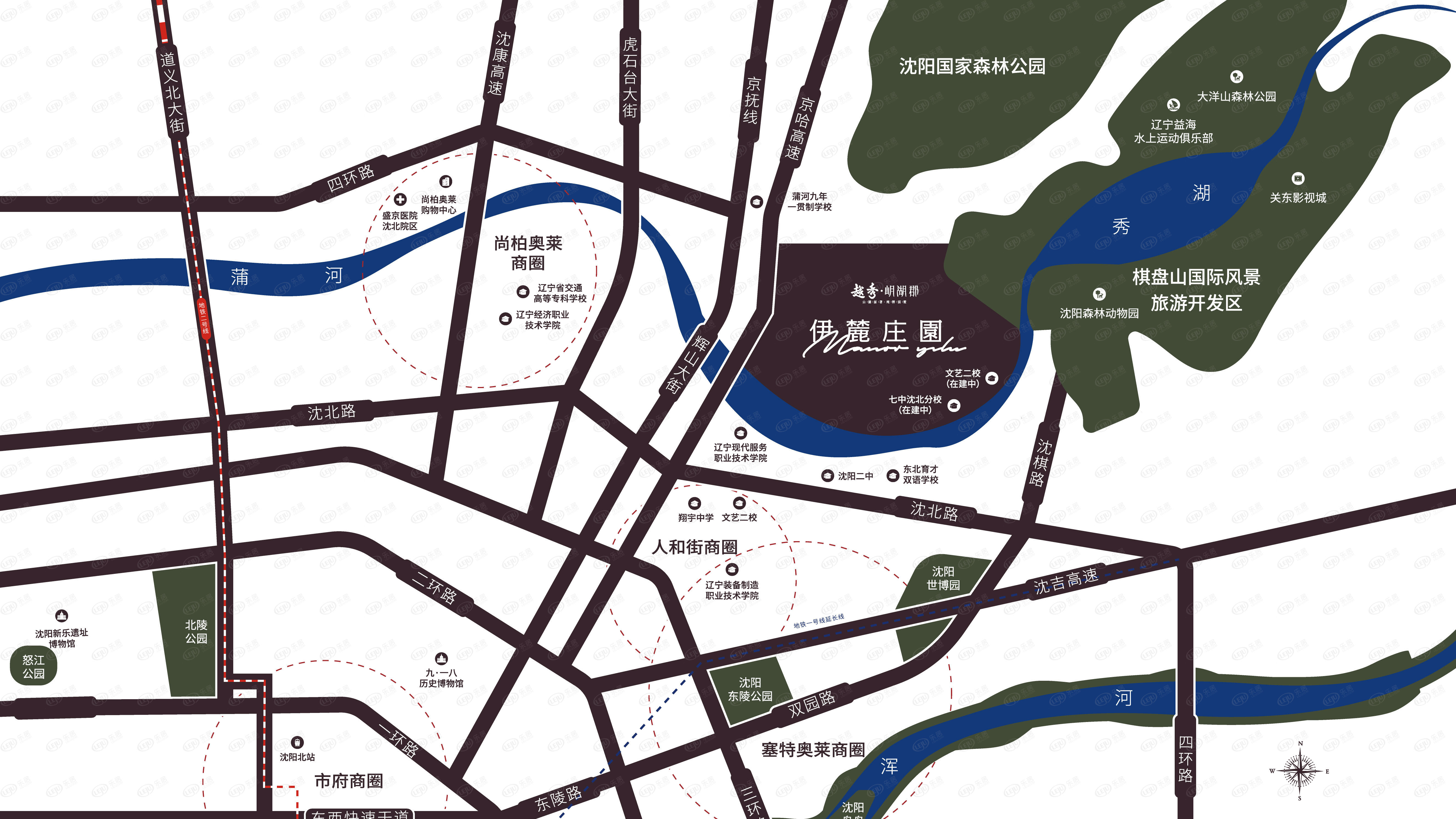 越秀岄湖郡占地面积约62万㎡,建筑面积约52.3万㎡,容积率0.84,绿化率约60%。项目依山旁水,紧邻40公里长蒲河生态景观。棋盘山、辉山、大洋山三山环抱。园区规划为新中式风格,含南北双院,空中花园。园区规划6400会馆,周围学校有沈阳七中沈北校区和文艺二小。项目东侧为棋盘山风景区、南侧有世博园和东陵公园。
