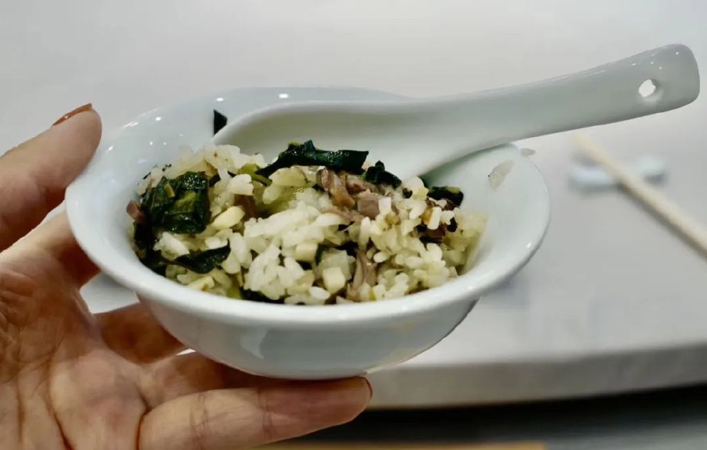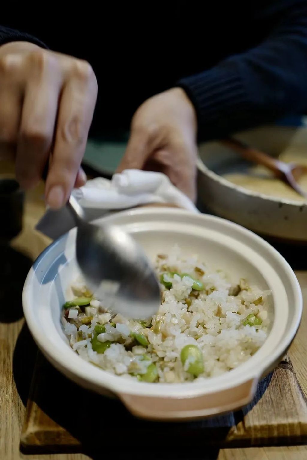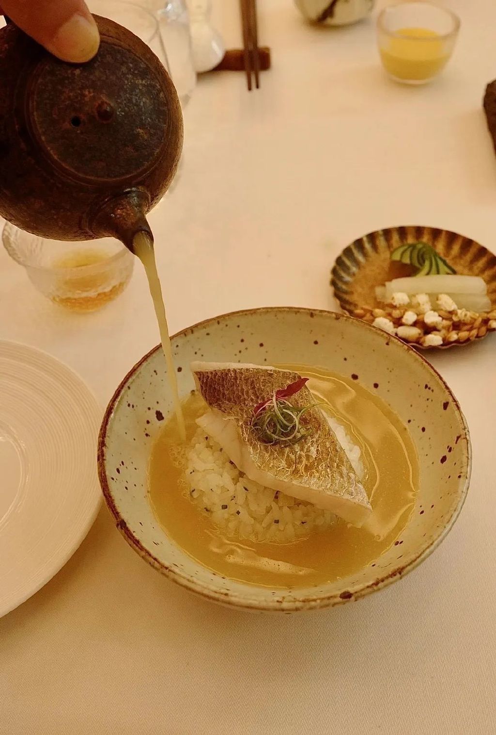 半块意犹未尽之时,大黄鱼泡饭用的潮式汤底再加花雕,脆笋在米饭中像音符跳跃,鲜啊。旁边的一夜渍小菜里居然有一棵带糠皮的爆米,与薄萝卜一起吃,酸与甜,脆与香,神奇相遇。温柔无负担。