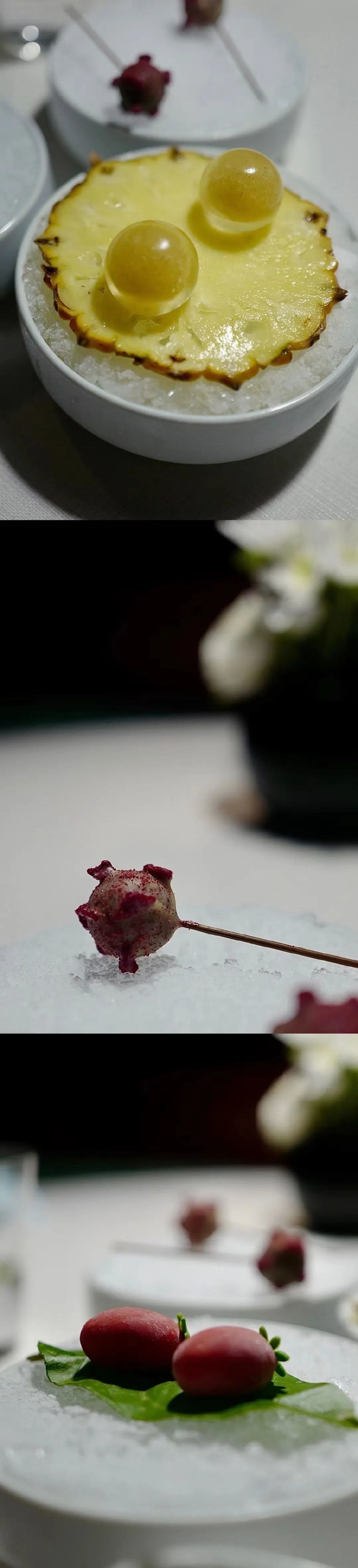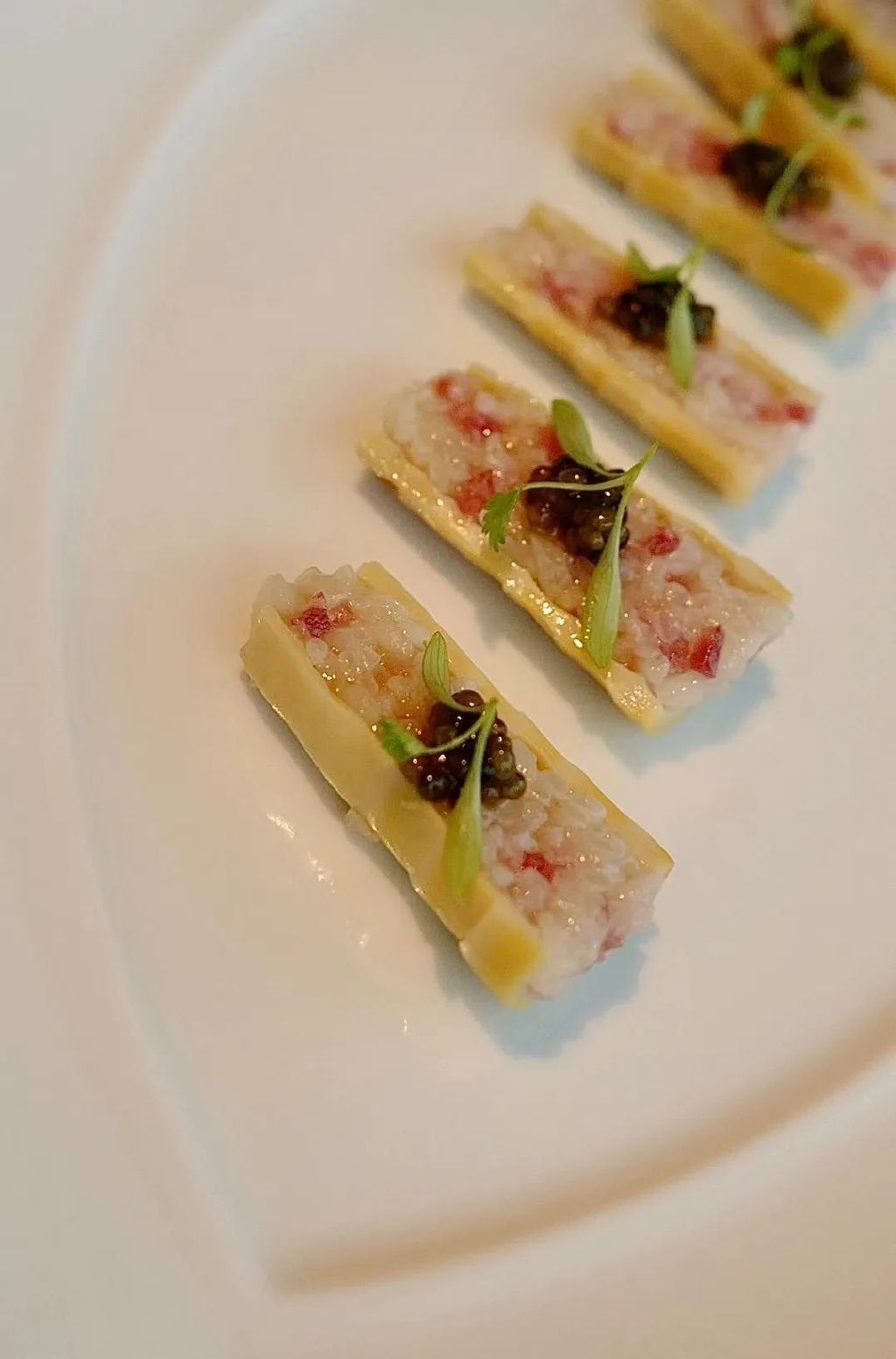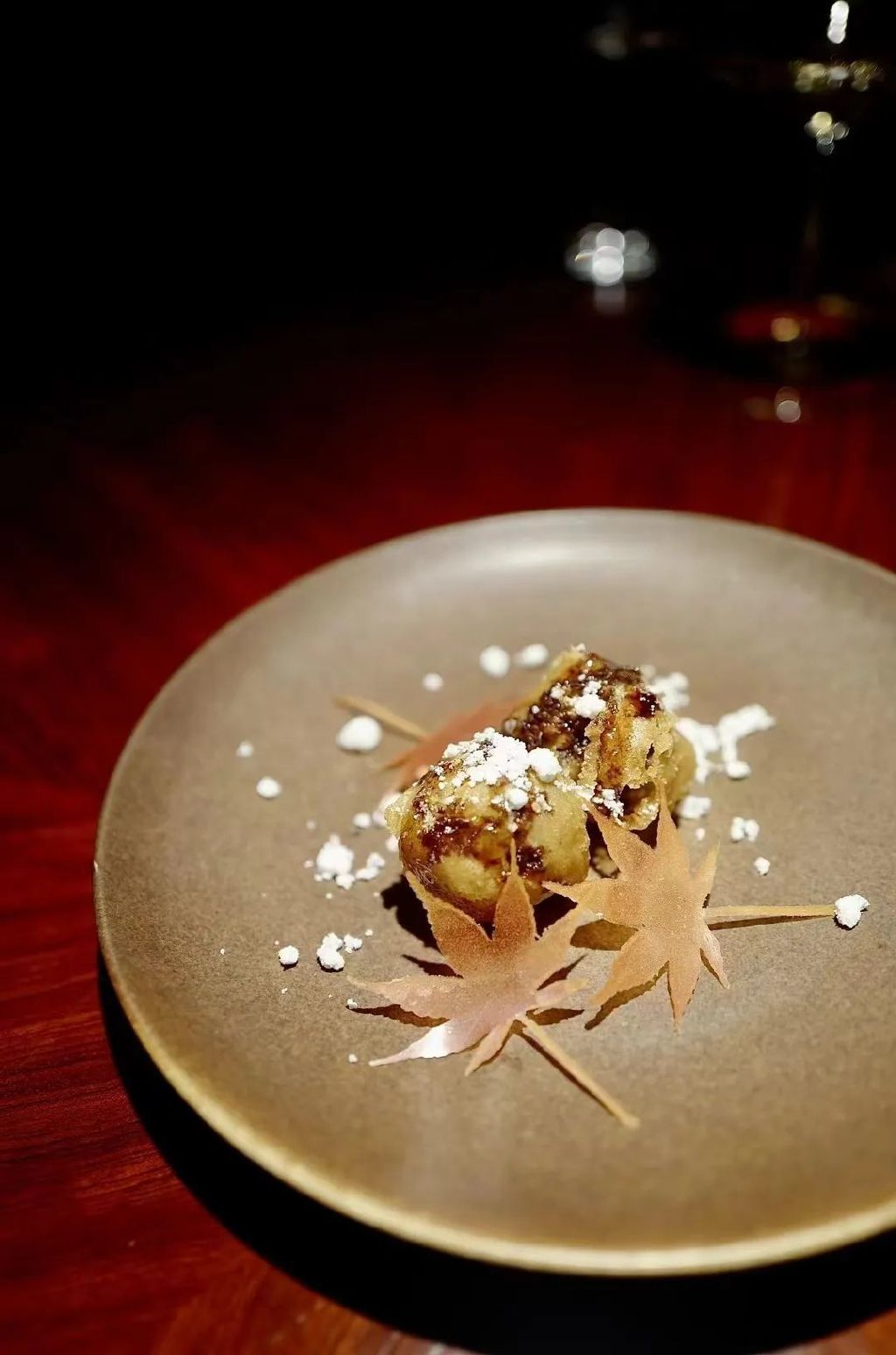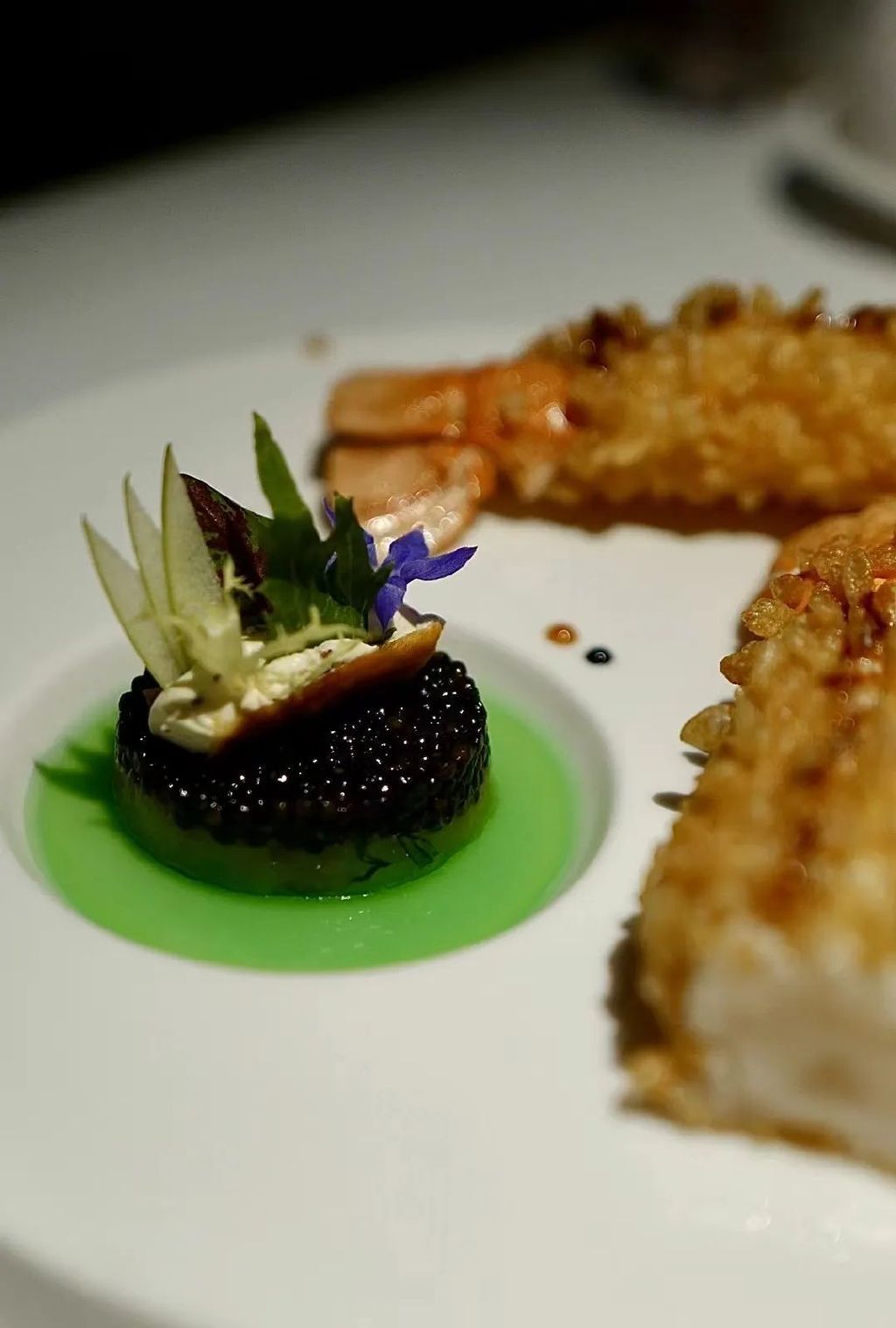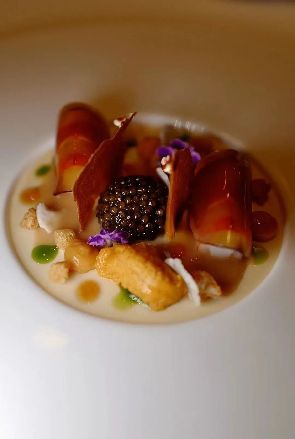 董克平老师大赞前菜精致,我一看眼前的山药球,球内包着芝士冻、山楂泥、核桃肉三层,上面还顶着卡露伽鱼子酱,确实讨喜。