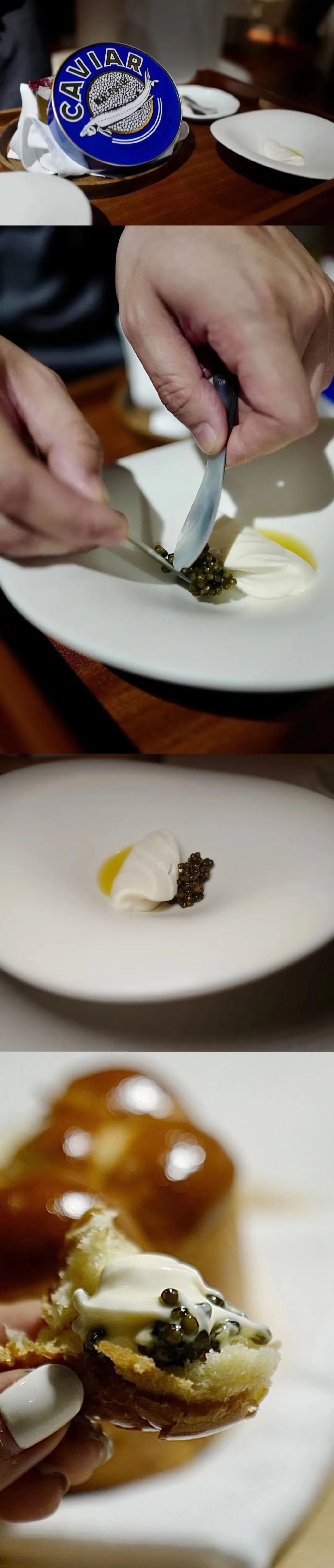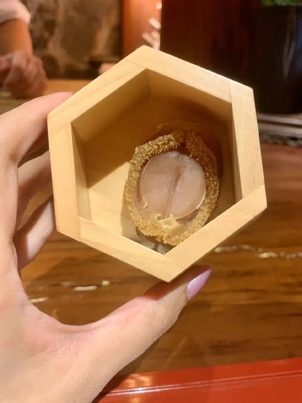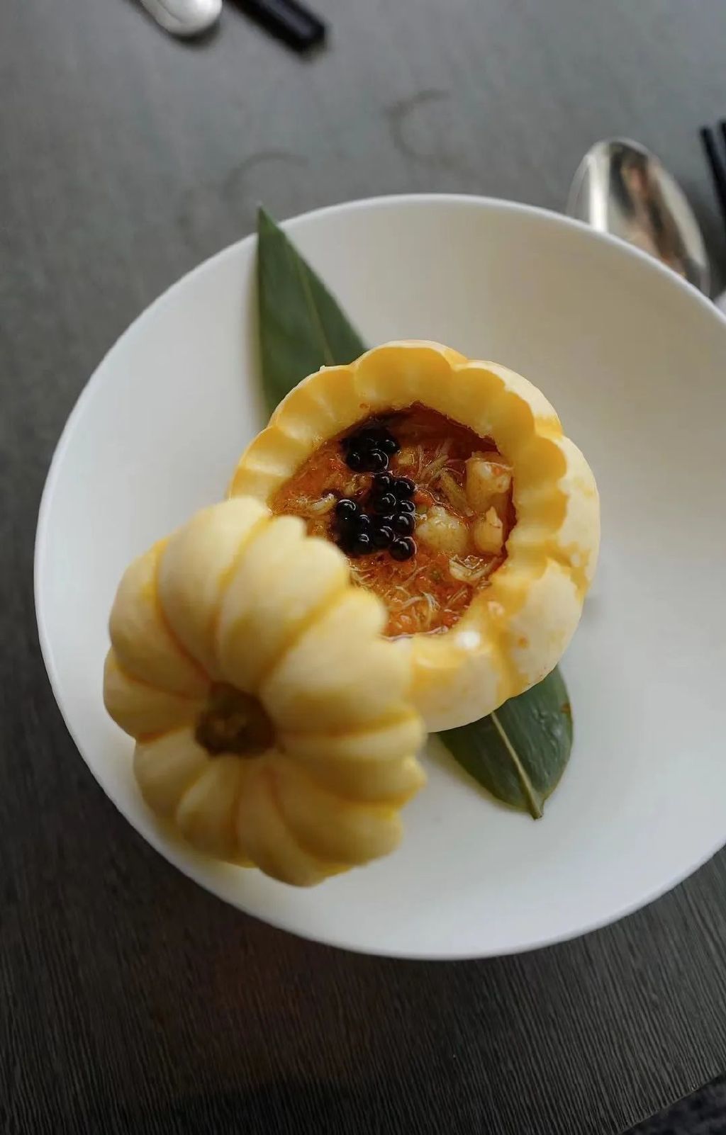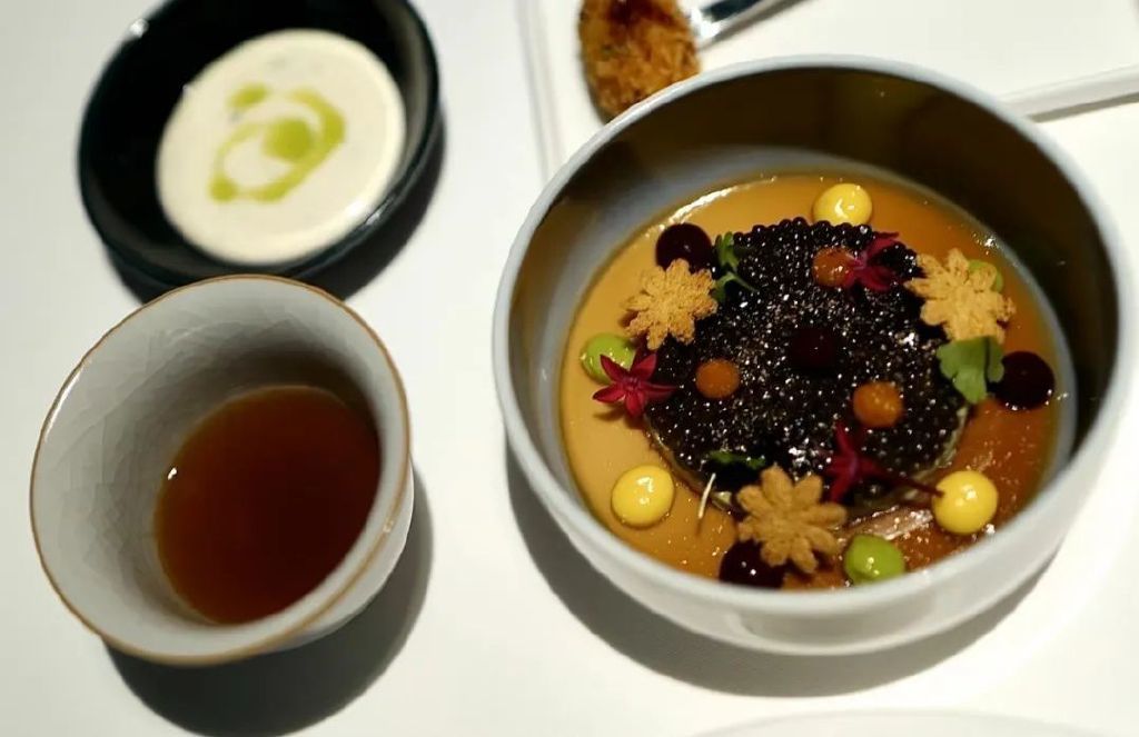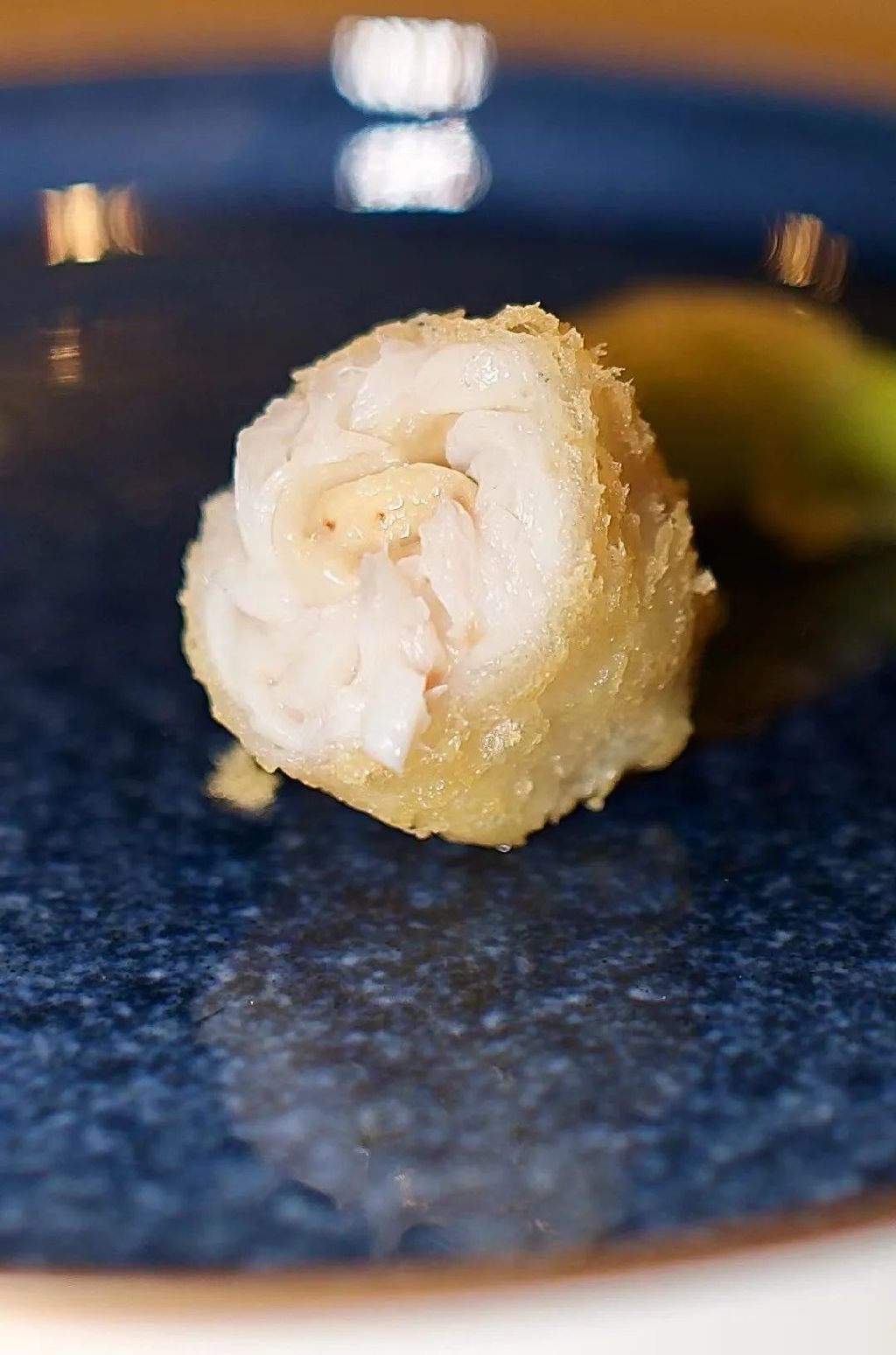 董克平老师大赞前菜精致,我一看眼前的山药球,球内包着芝士冻、山楂泥、核桃肉三层,上面还顶着卡露伽鱼子酱,确实讨喜。
