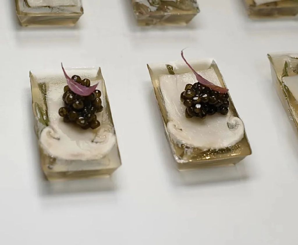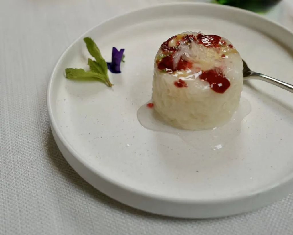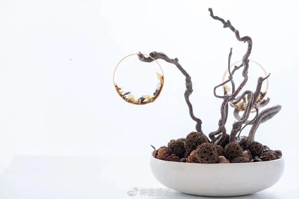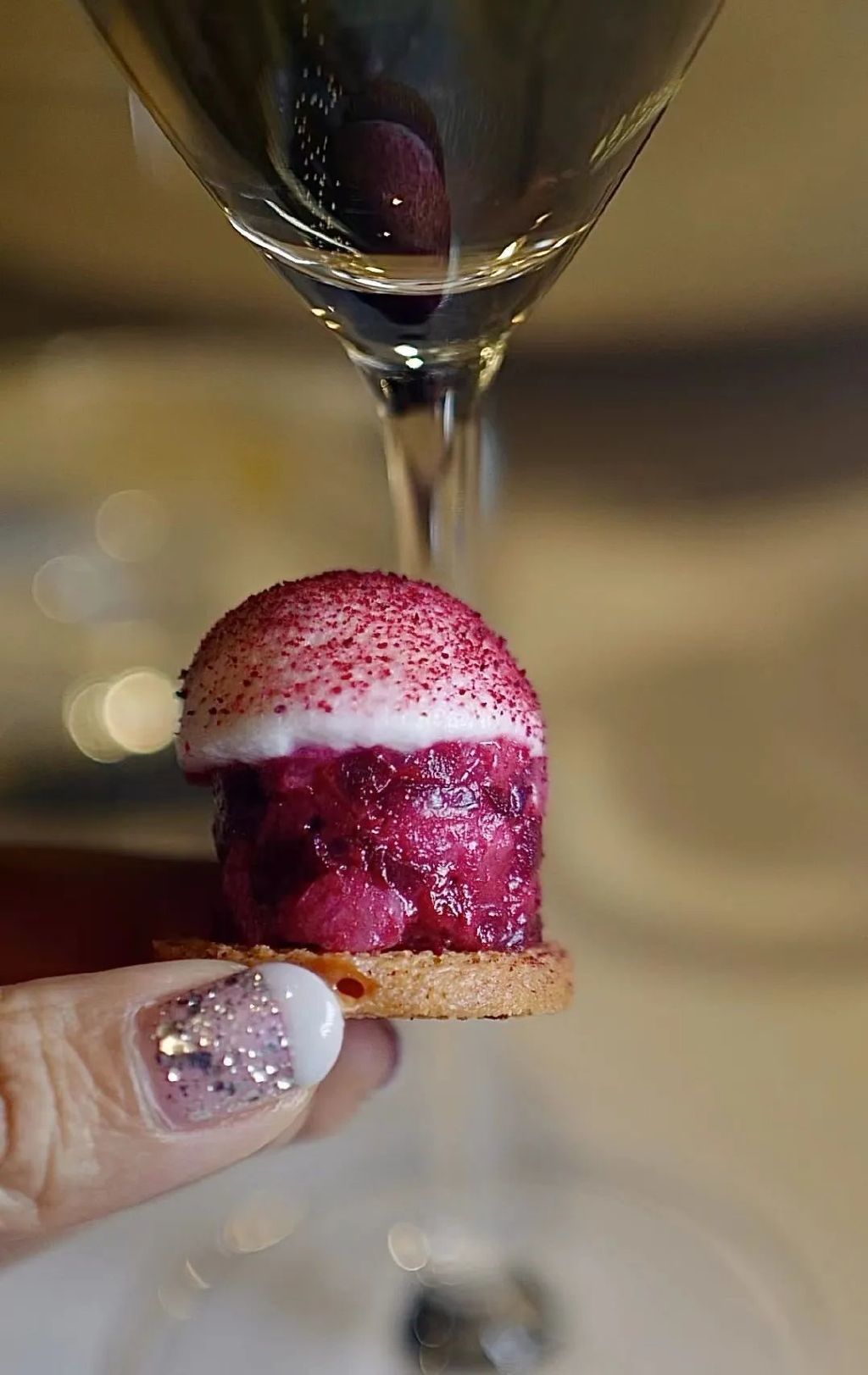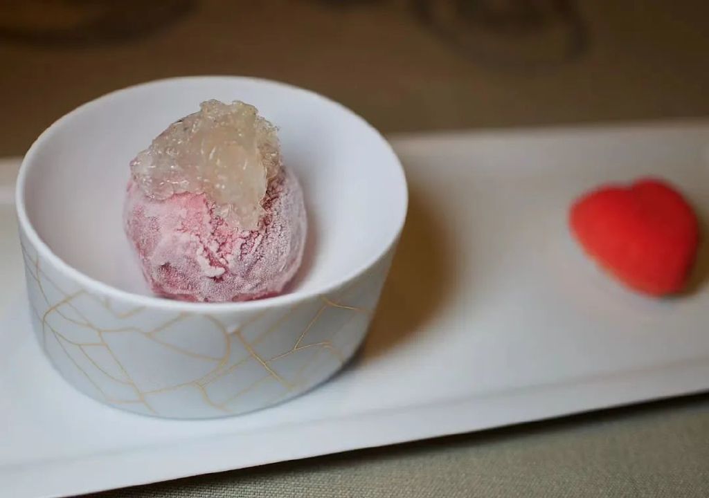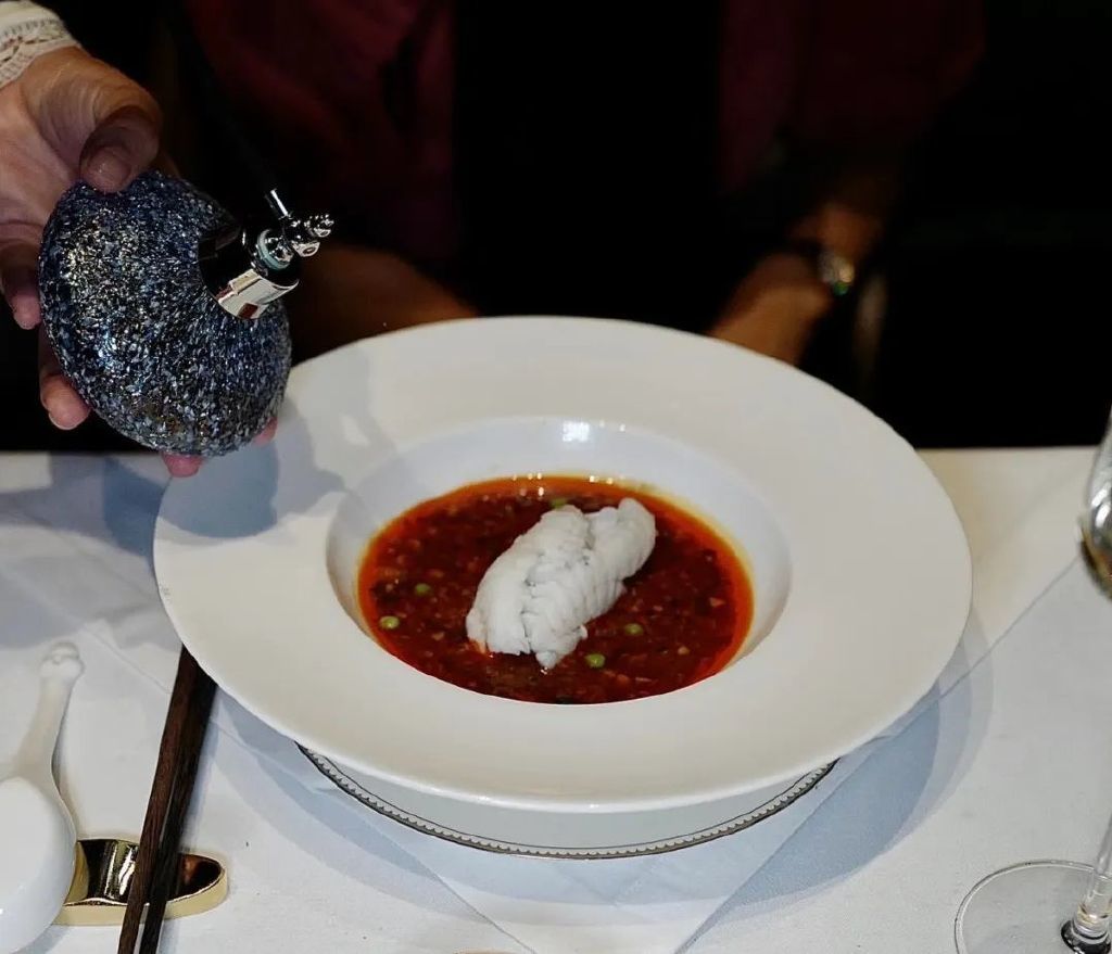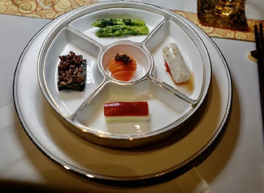 董克平老师大赞前菜精致,我一看眼前的山药球,球内包着芝士冻、山楂泥、核桃肉三层,上面还顶着卡露伽鱼子酱,确实讨喜。