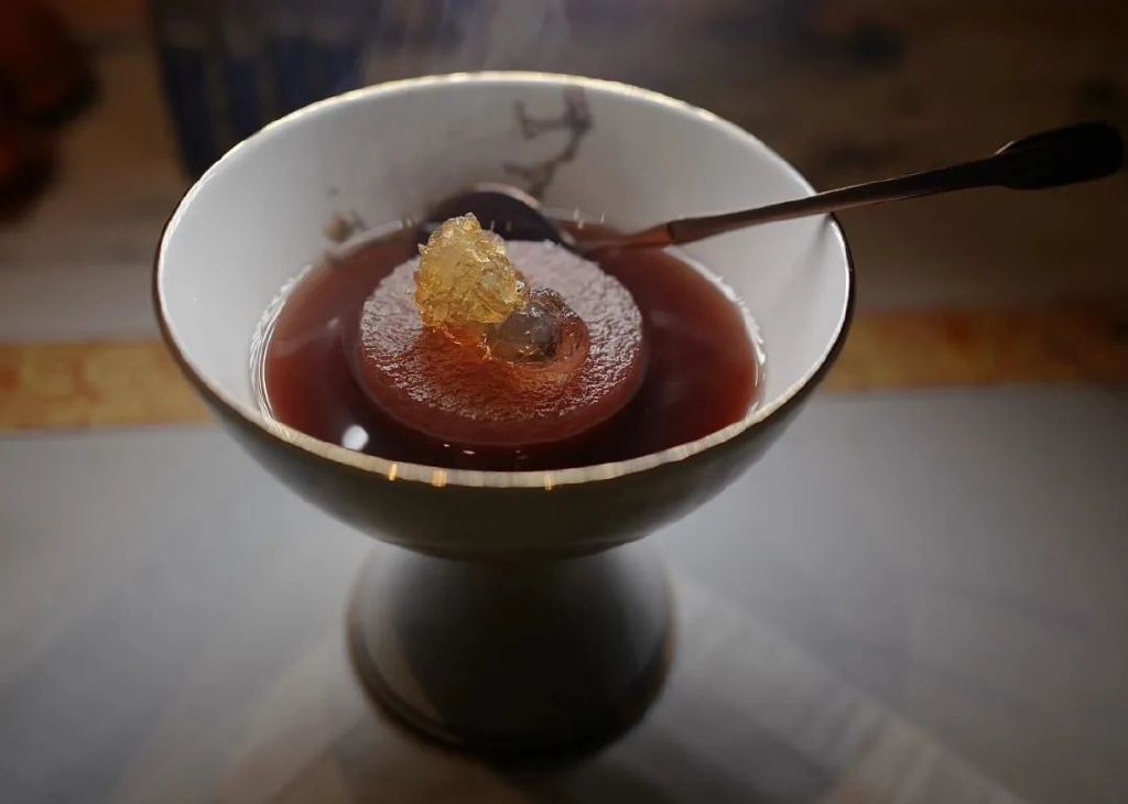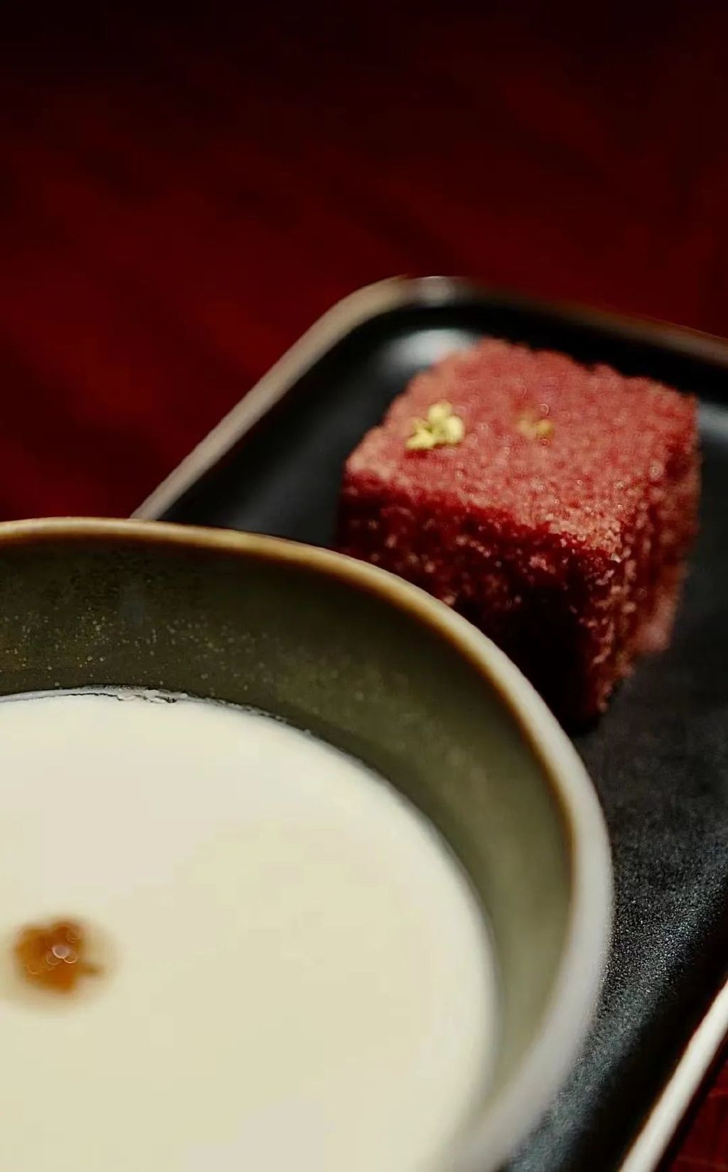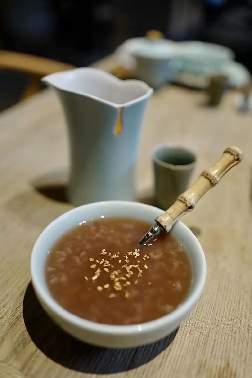 我去后厨看了牛肉熟成室,隔壁还有鸡,让我对新菜充满期待!甜品,是我爱的“杏仁茶”,不过一吃,又是非传统!铁观音冰糖茶汤里,有小小一块顺德龙皇杏仁,2% 北杏、98%南杏,再加葛根粉,轻微的韧,不过足够嬉戏舌头!