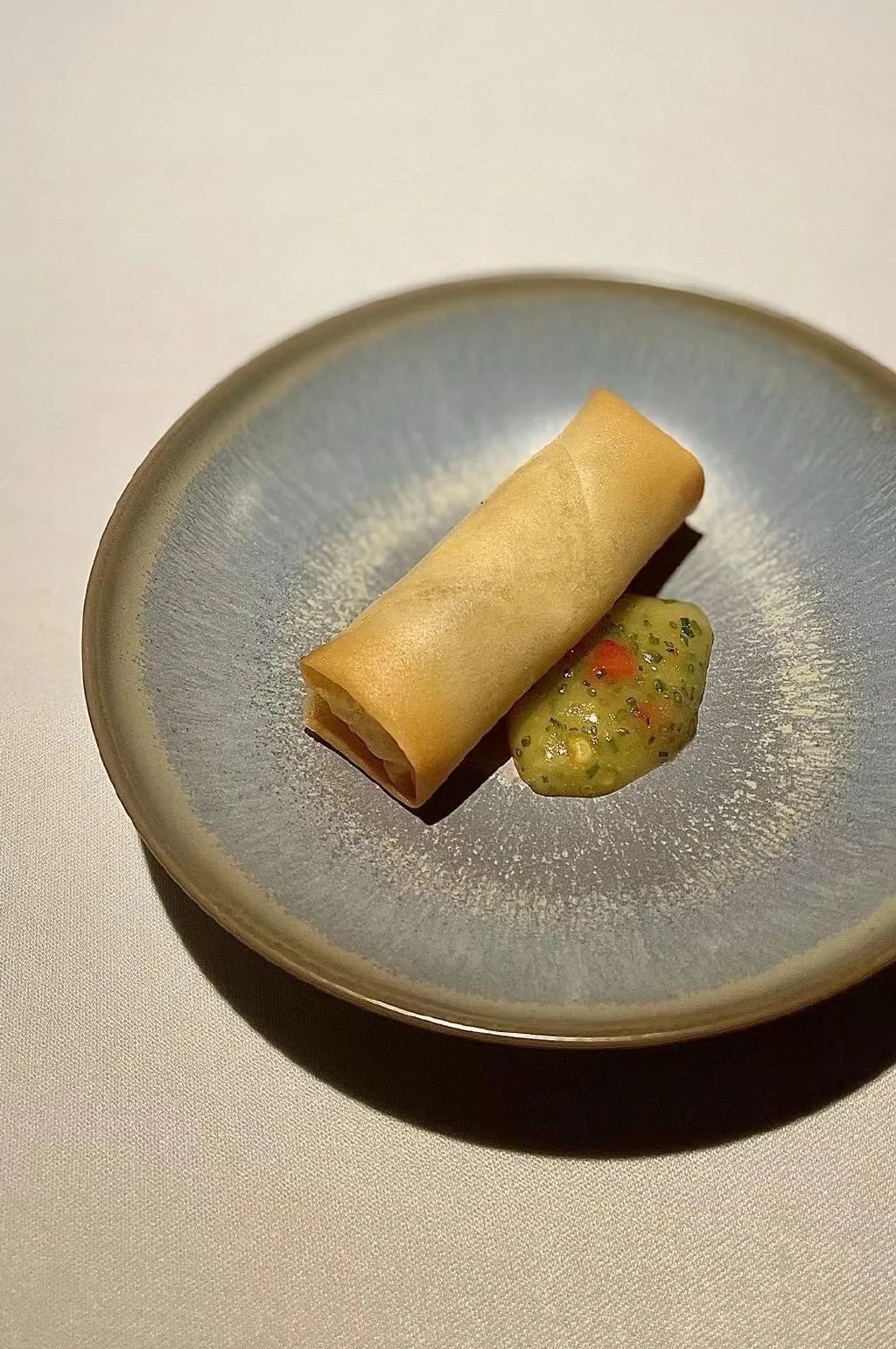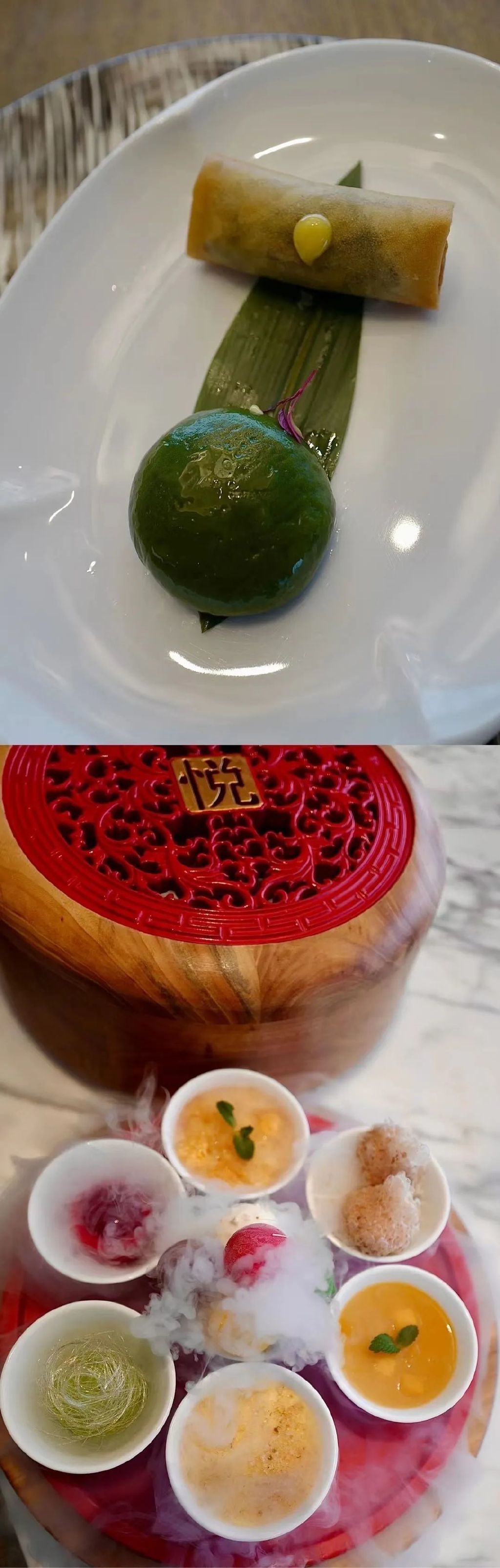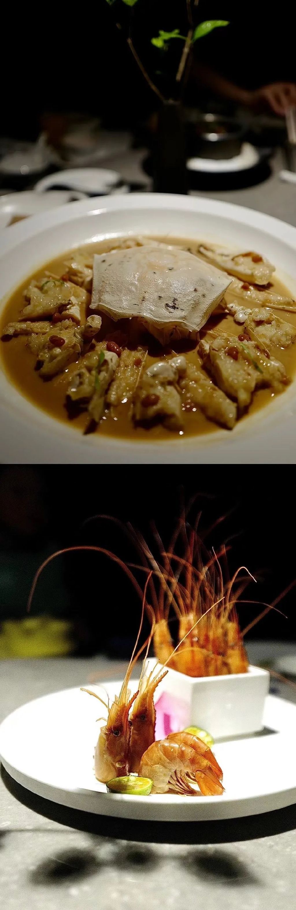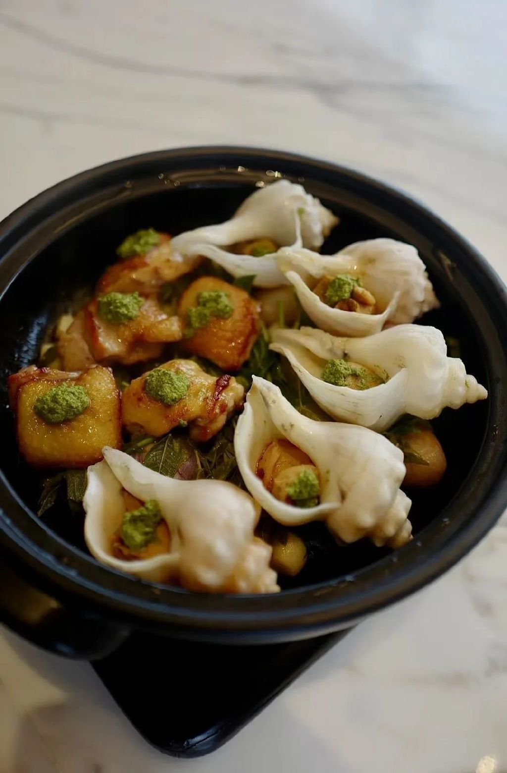 雪菜步鱼春卷拼燕窝青团,对我来说算是双料尝鲜了。今天香水都不用,肉碎蒸雪蟹的三十年陈皮香,鲟龙鱼筋大煮干丝的猪油香,角螺焗清远鸡的香椿香…闻了让人流口水。