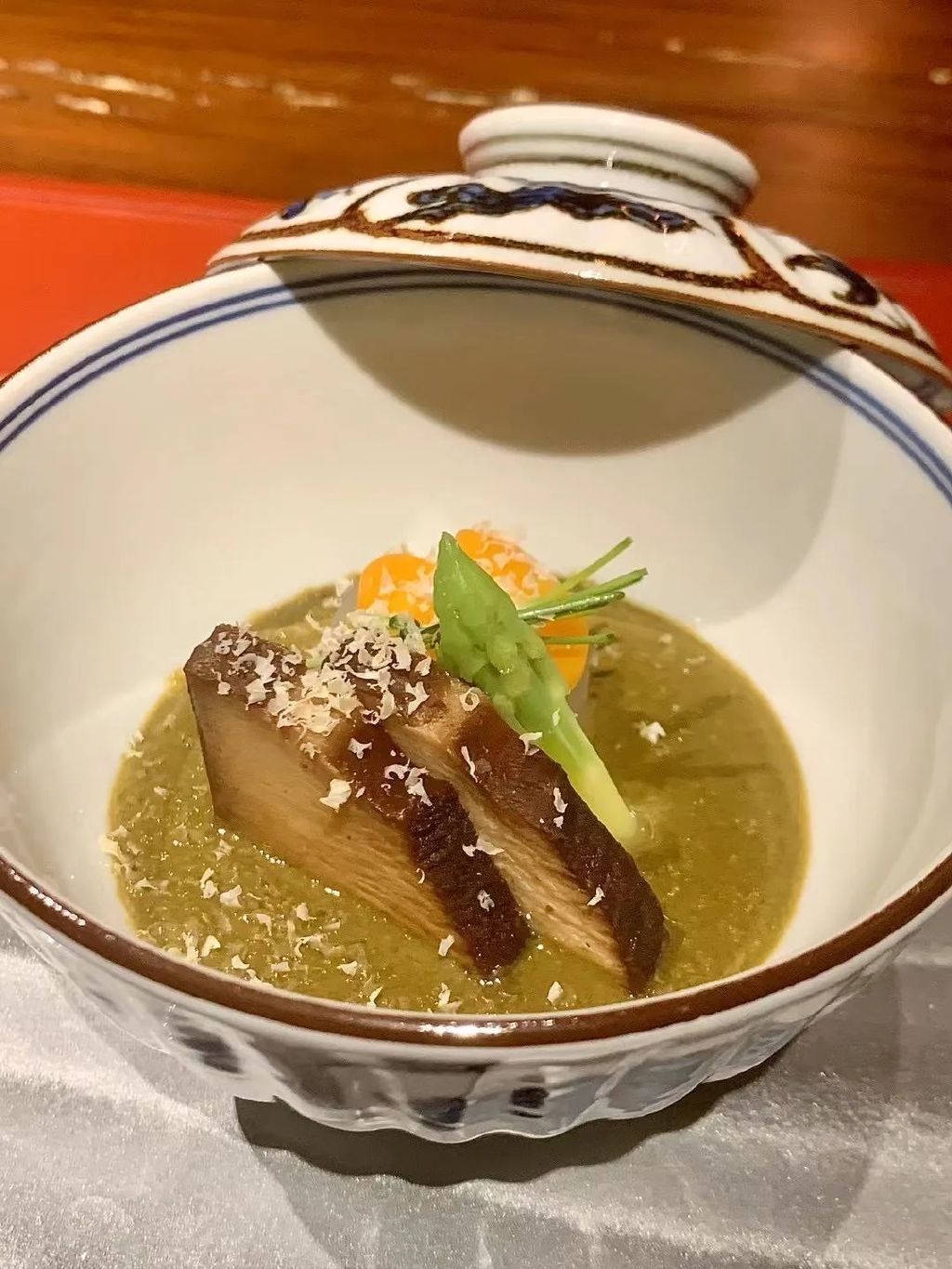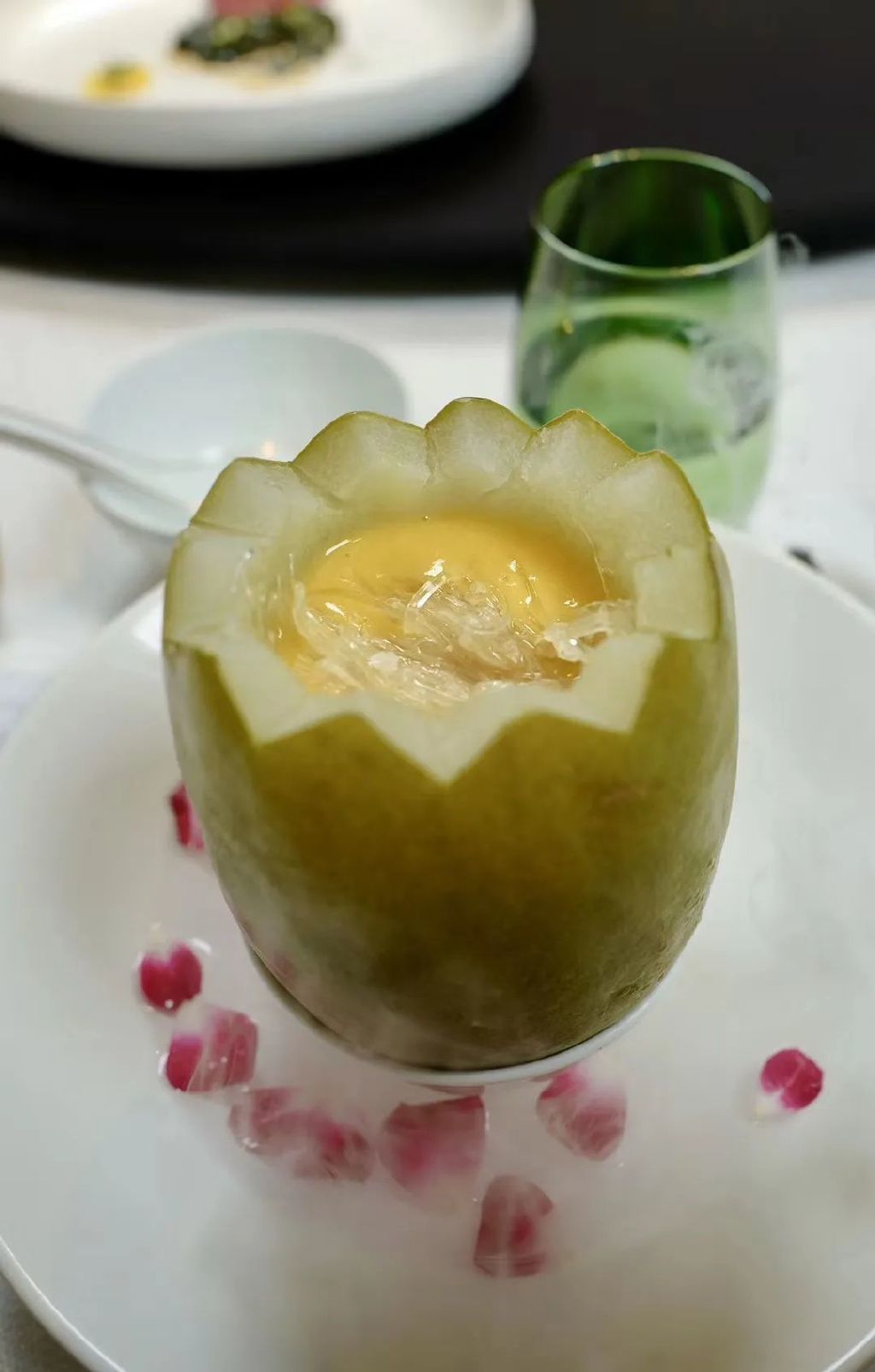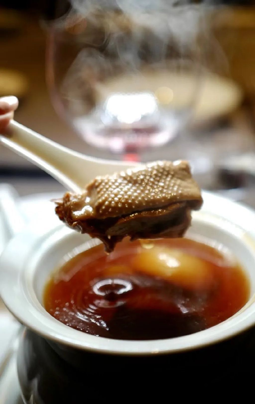 雪菜步鱼春卷拼燕窝青团,对我来说算是双料尝鲜了。今天香水都不用,肉碎蒸雪蟹的三十年陈皮香,鲟龙鱼筋大煮干丝的猪油香,角螺焗清远鸡的香椿香…闻了让人流口水。