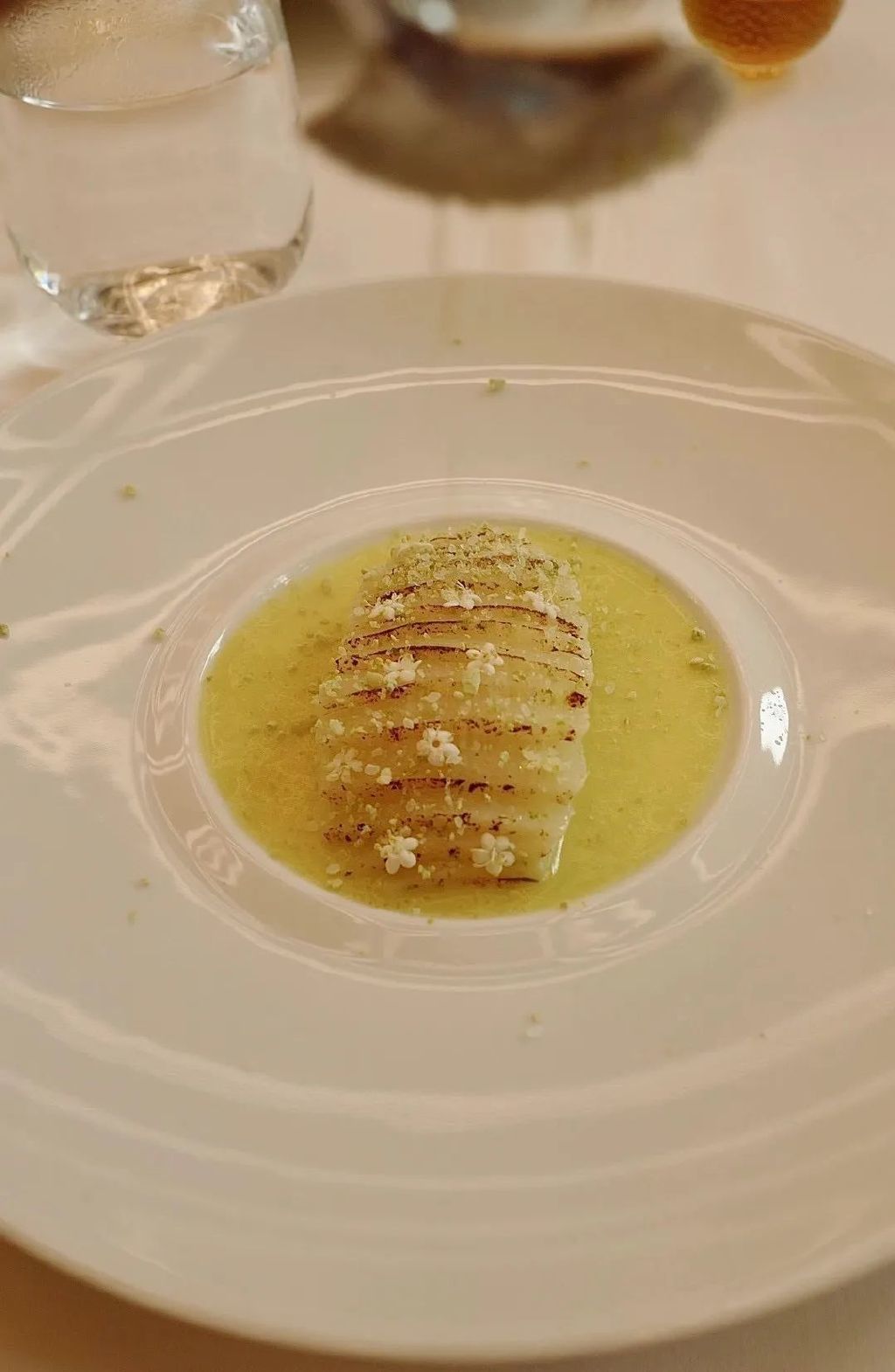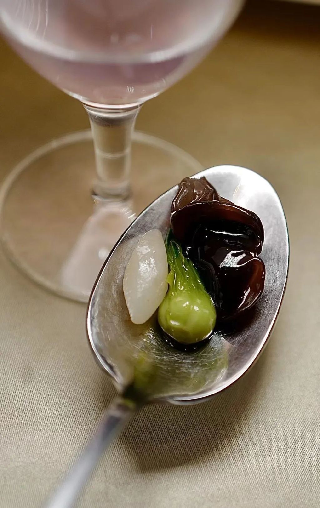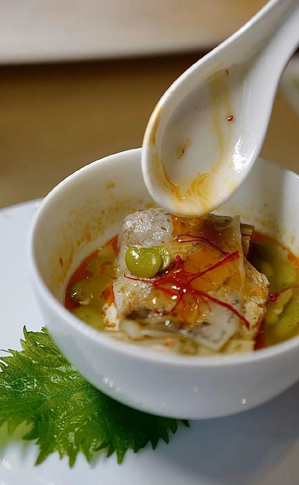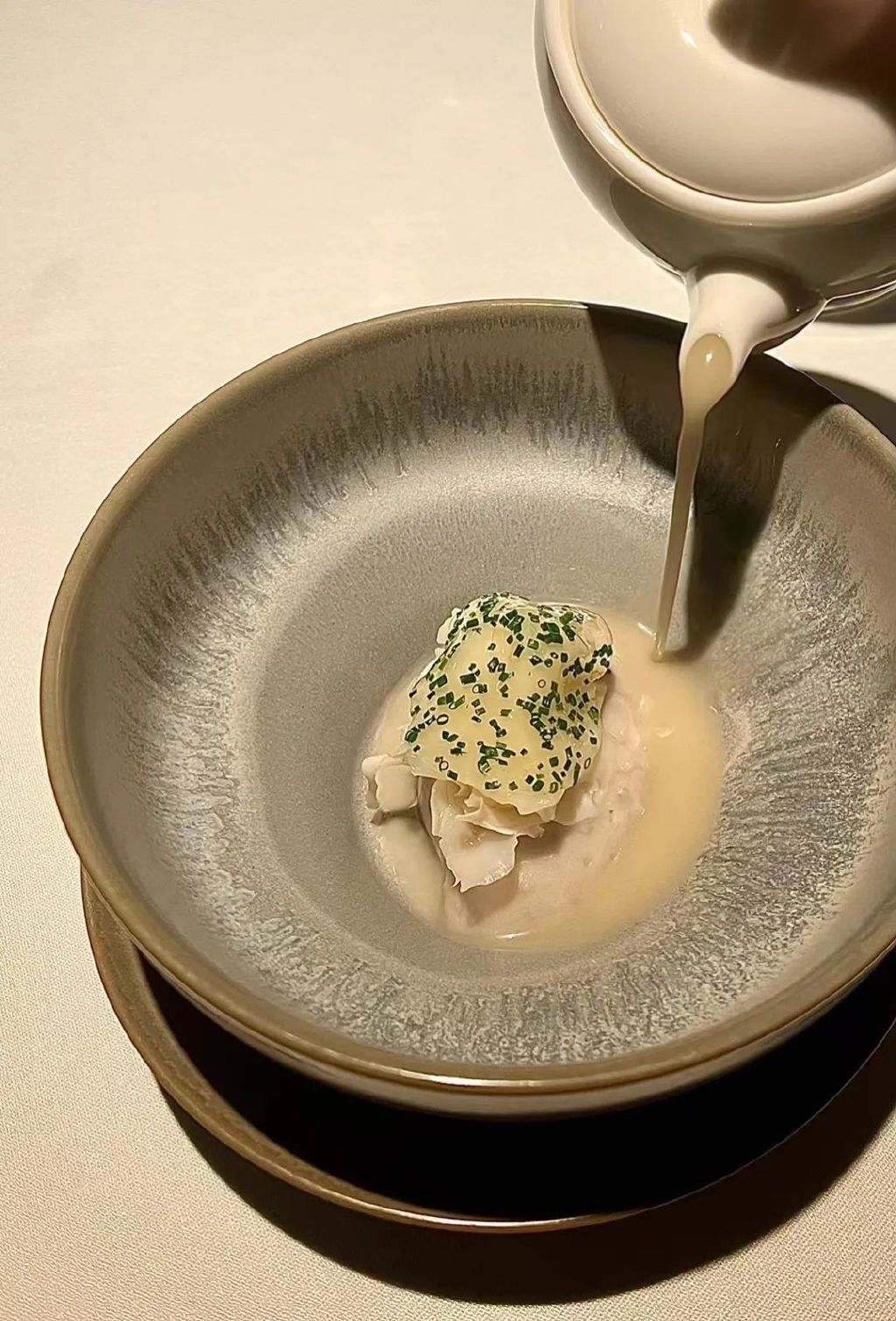 莼鲈之思,这道江南名菜,我吃过最好的版本出自名厨Oscar Wang。他用苏帮菜的清鲜理念斡旋山珍海味间,一手托起苏州唯一黑珍珠二钻餐厅华池88。我今夜在JuJu Wang的艺术展厅里享受到这道菜。鲈鱼用高汤就碗烫熟。茭白丝与莼菜叠映一爽脆一滑脆,这双脆口感,鱼肉相称之下,就更见肥嫩。