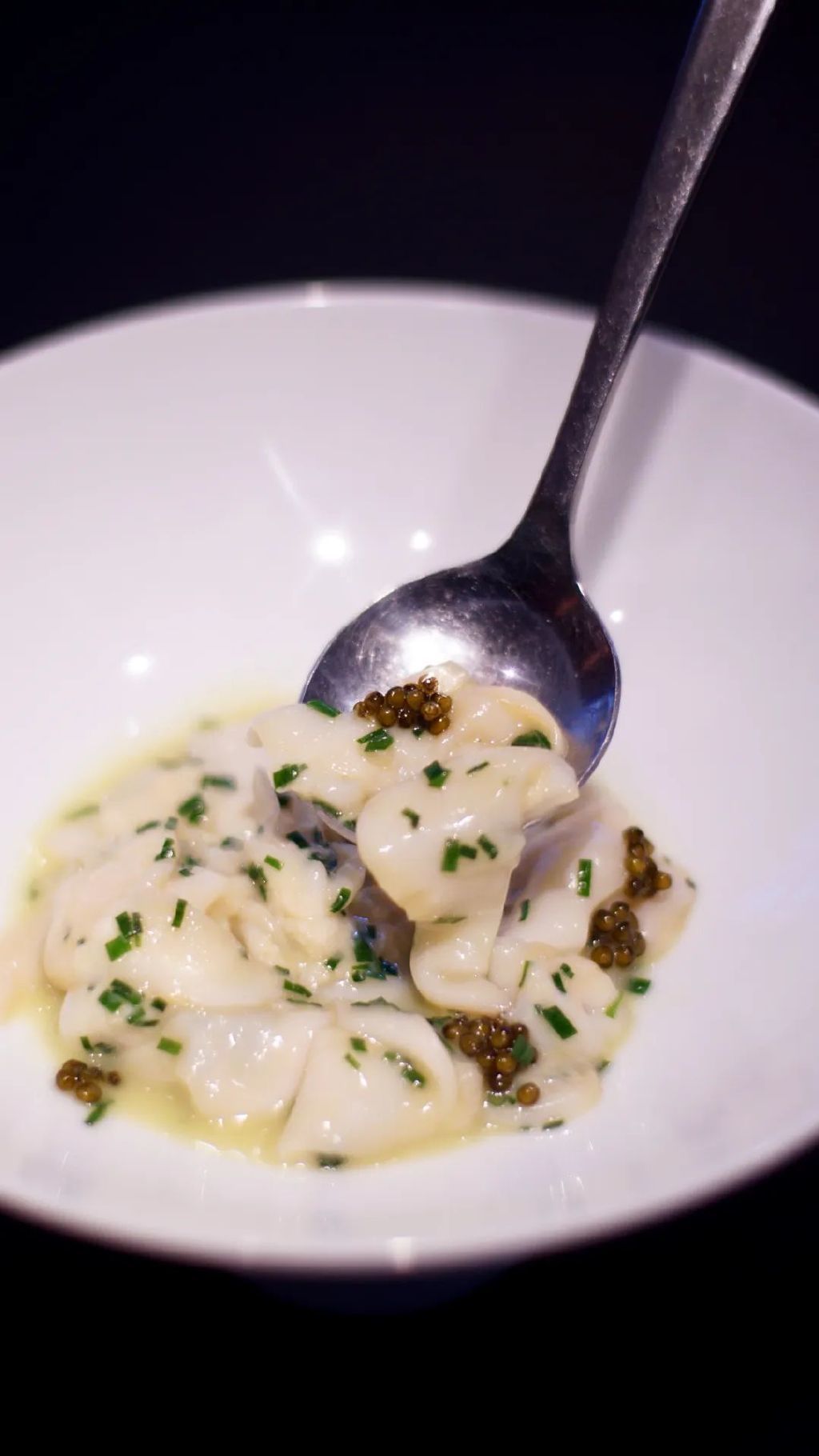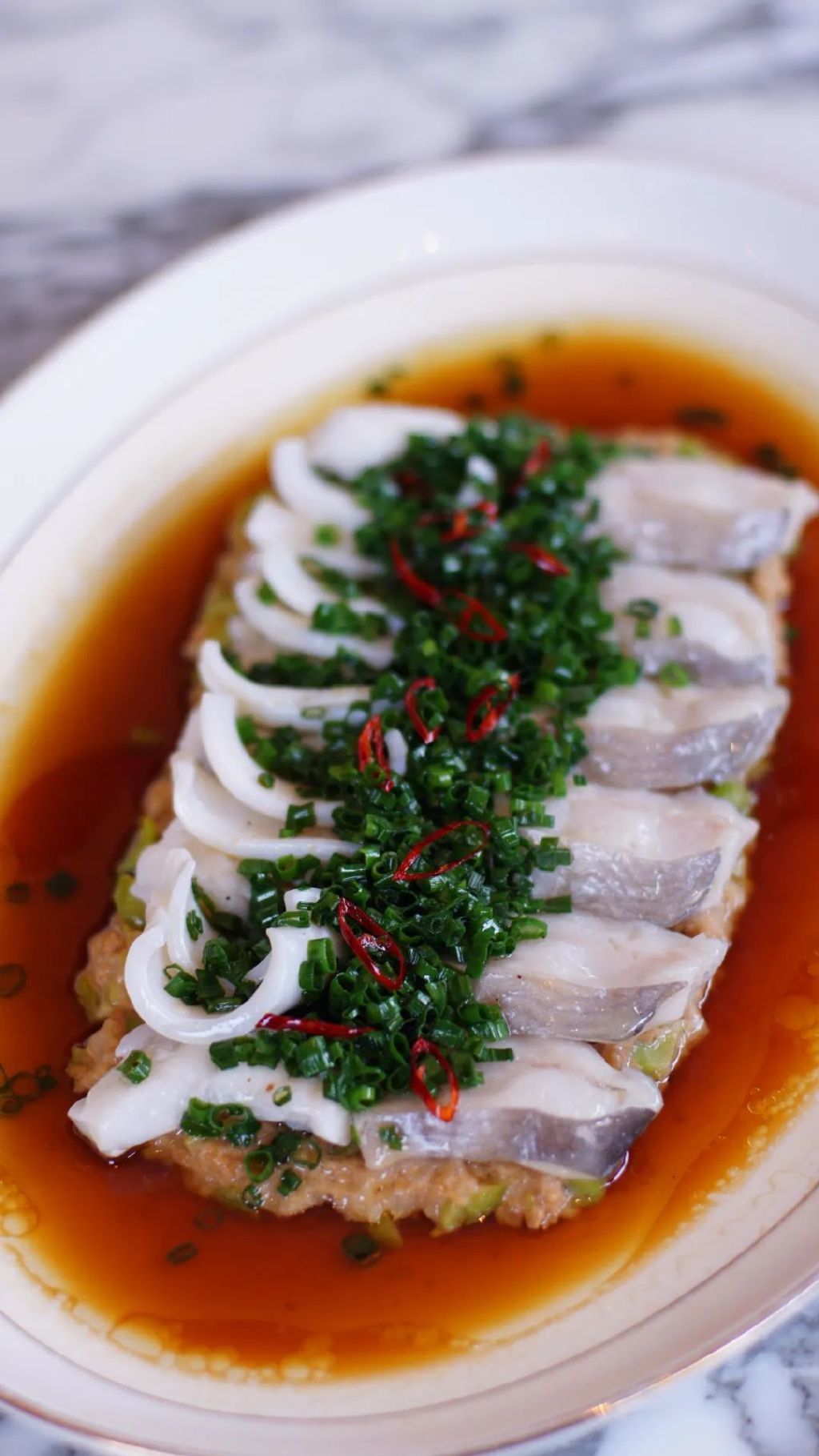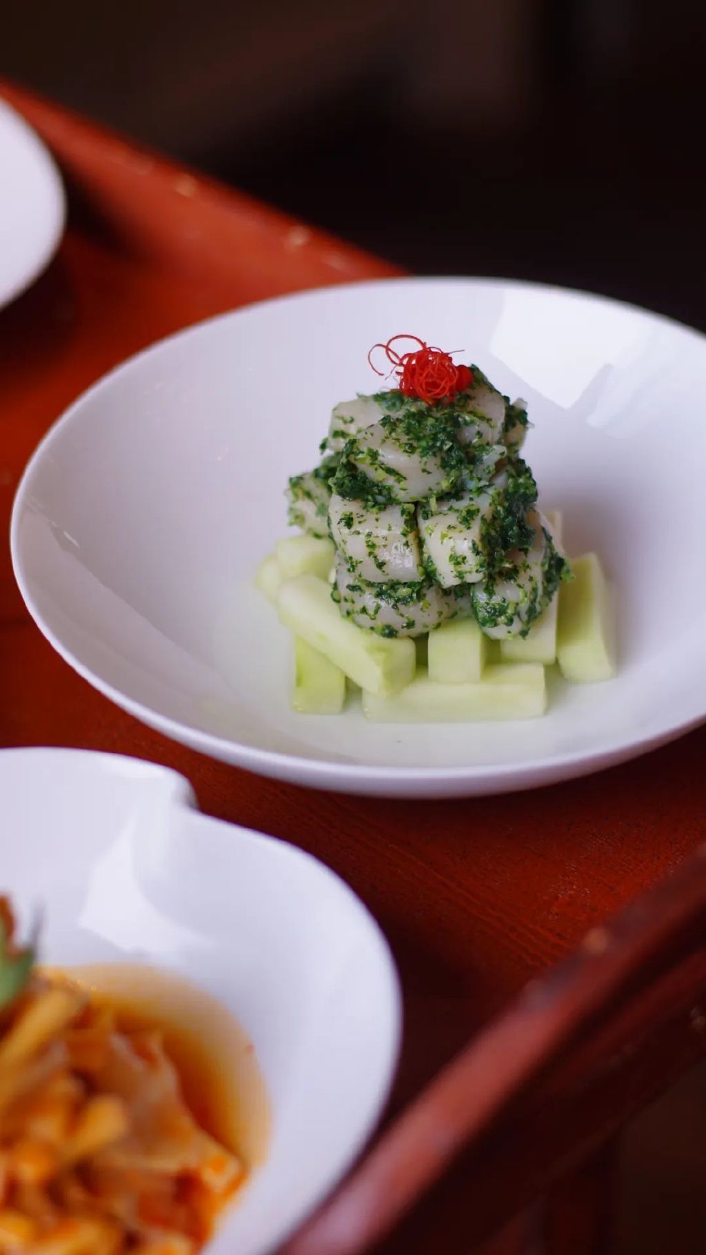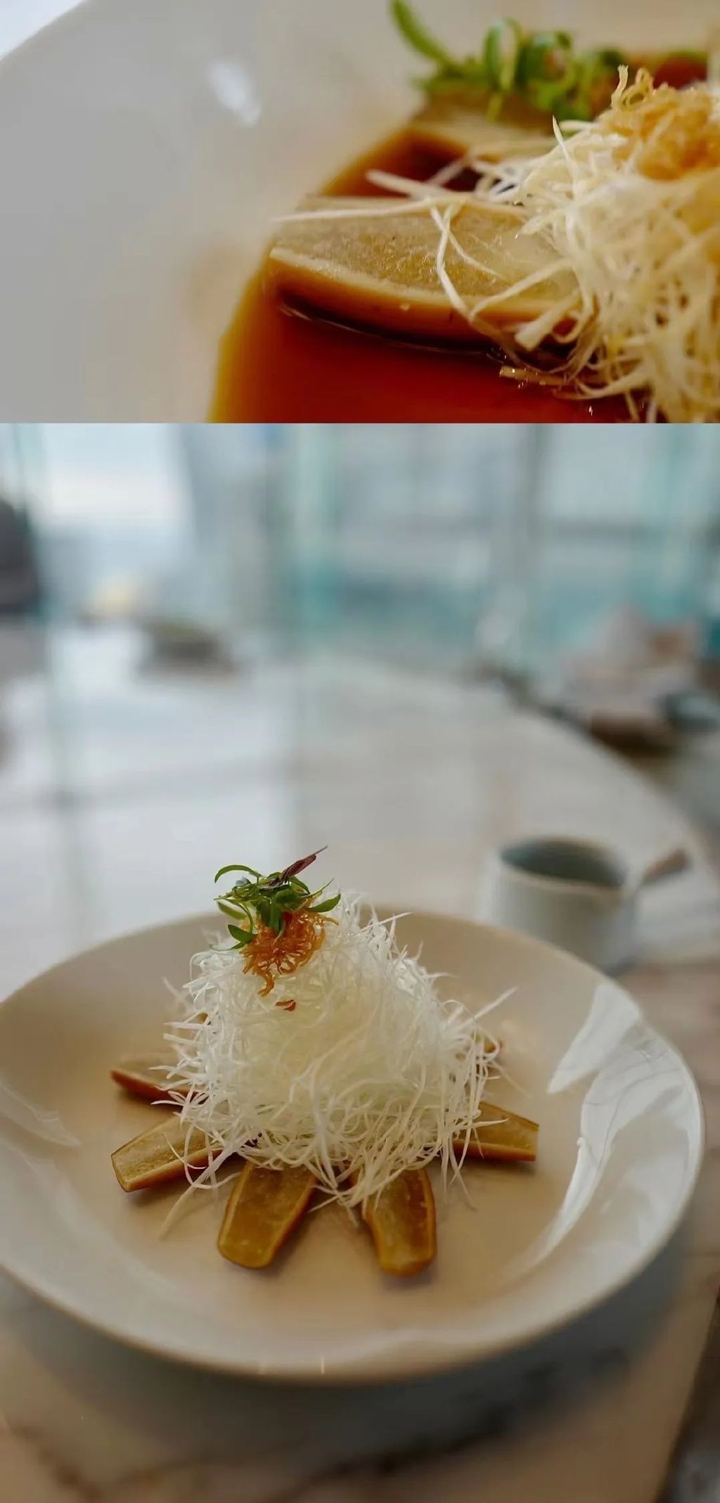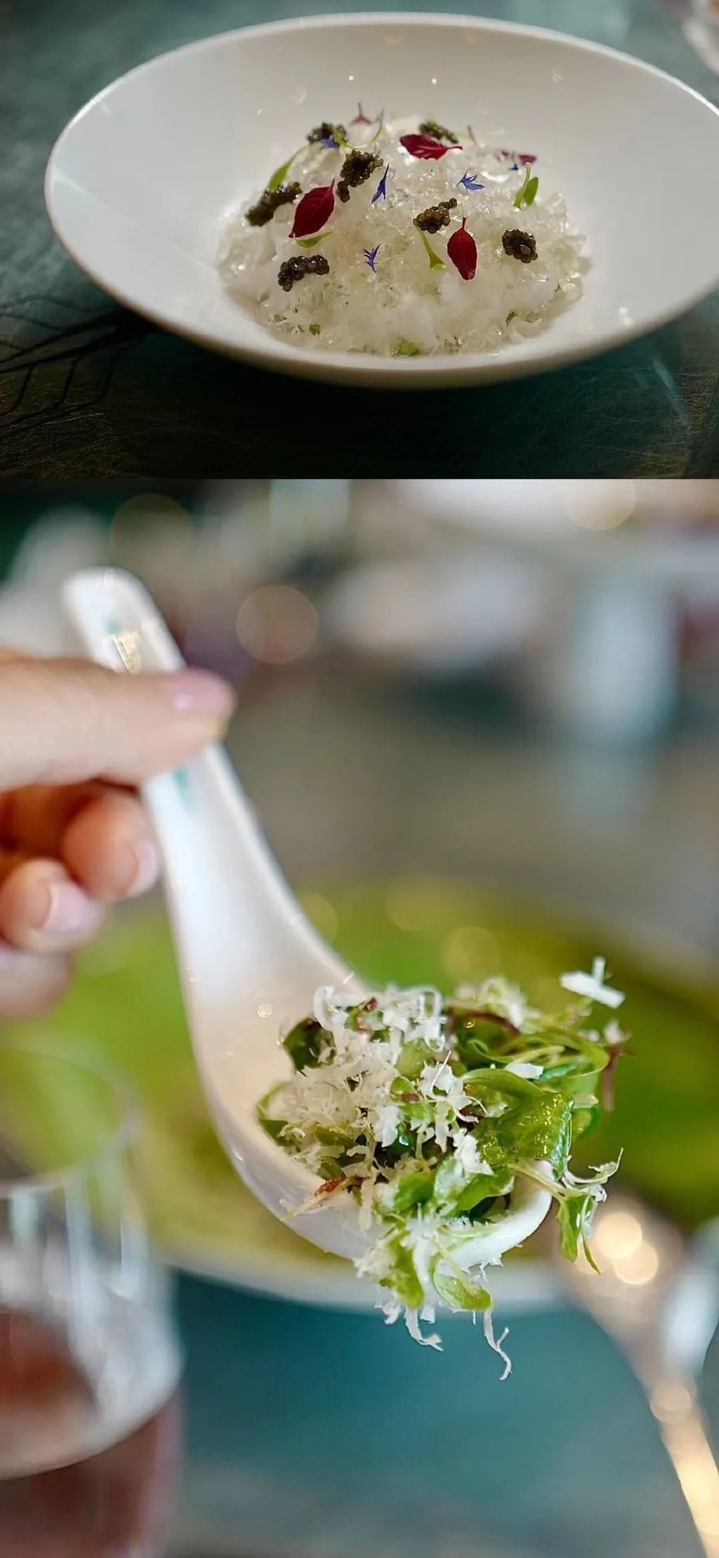 莼鲈之思,这道江南名菜,我吃过最好的版本出自名厨Oscar Wang。他用苏帮菜的清鲜理念斡旋山珍海味间,一手托起苏州唯一黑珍珠二钻餐厅华池88。我今夜在JuJu Wang的艺术展厅里享受到这道菜。鲈鱼用高汤就碗烫熟。茭白丝与莼菜叠映一爽脆一滑脆,这双脆口感,鱼肉相称之下,就更见肥嫩。
