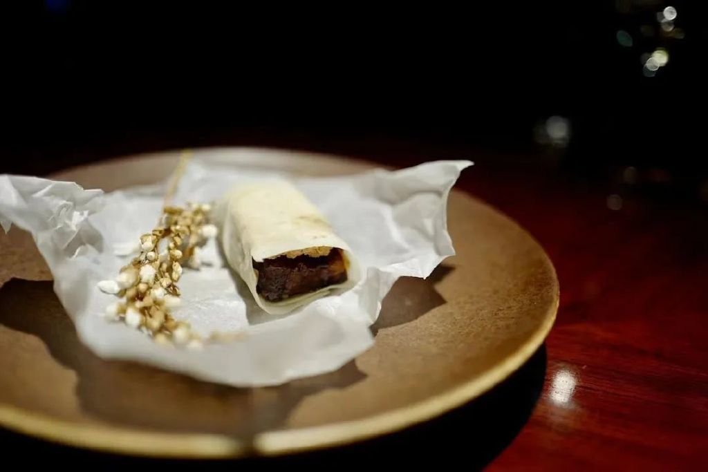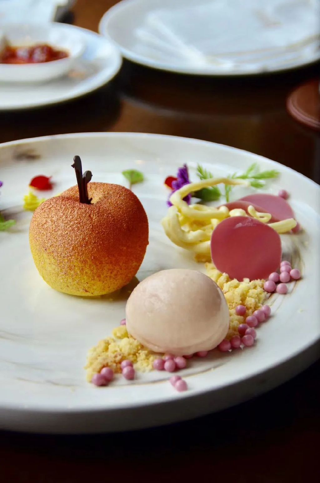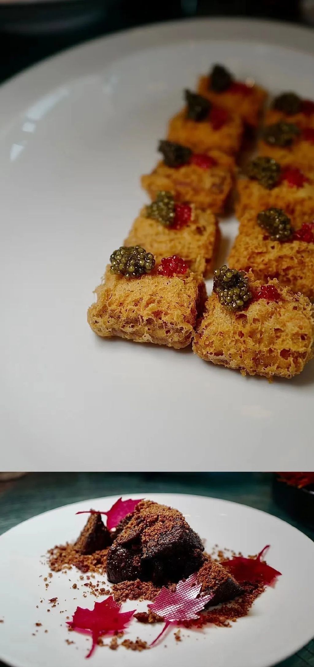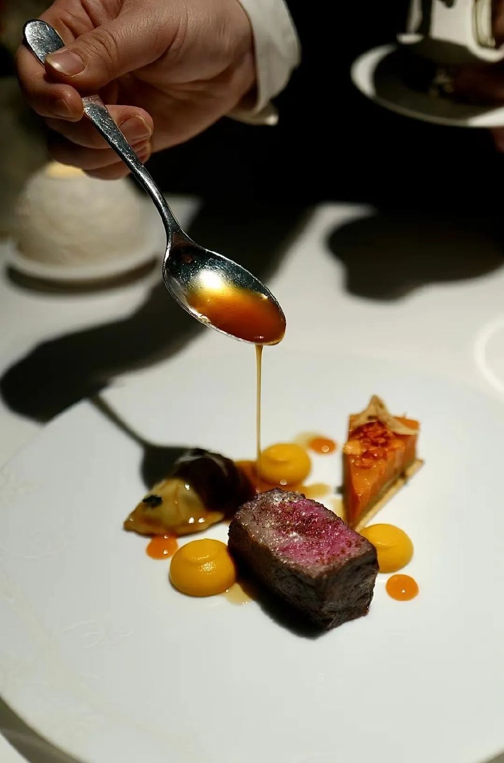 之后玉米三吃的黑松露爆酱玉米脆把胃口调动起来。惠灵顿用的是半山鸭肝半山和牛,梅干菜磨到无渣融合,大厨切薄脆皮时,拉大提琴一样稳,鲜汁汩汩。