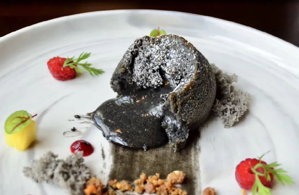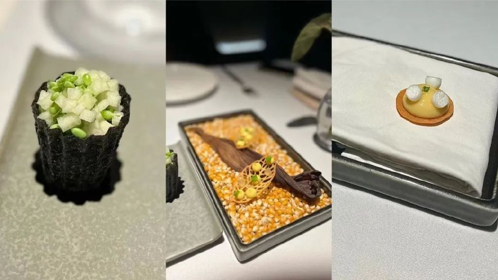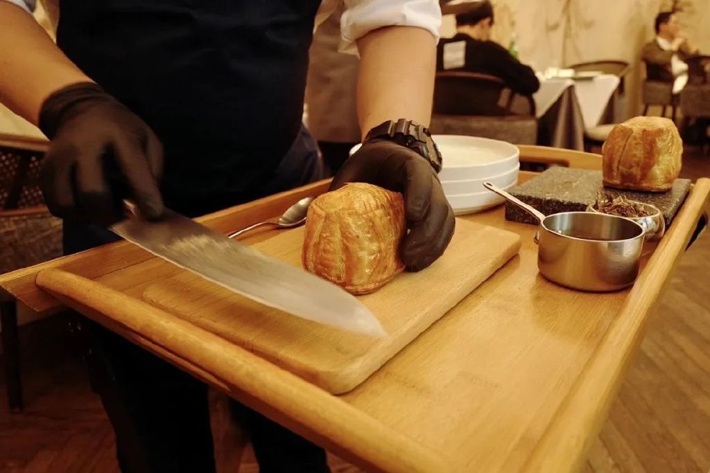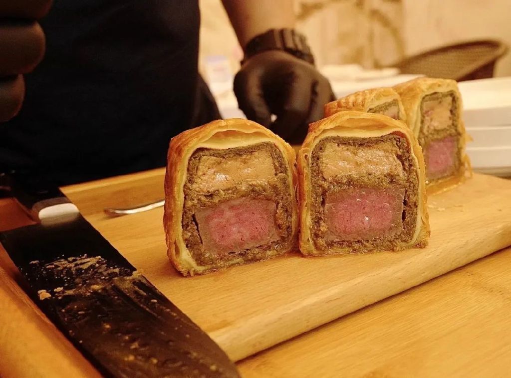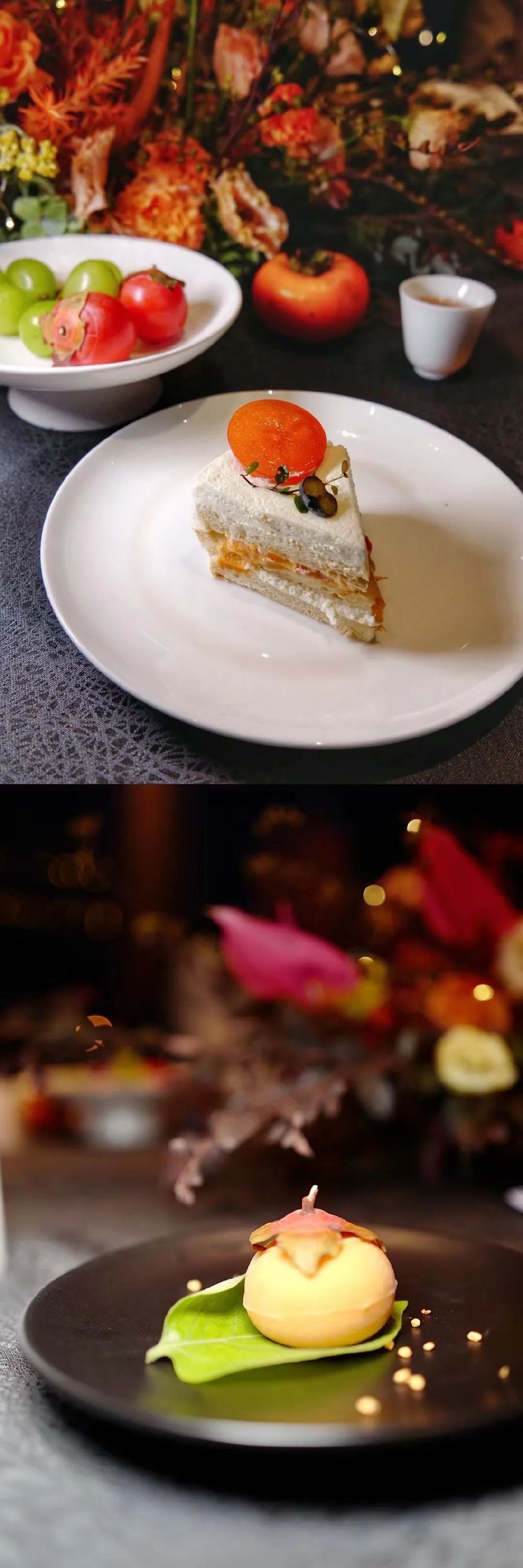 之后玉米三吃的黑松露爆酱玉米脆把胃口调动起来。惠灵顿用的是半山鸭肝半山和牛,梅干菜磨到无渣融合,大厨切薄脆皮时,拉大提琴一样稳,鲜汁汩汩。