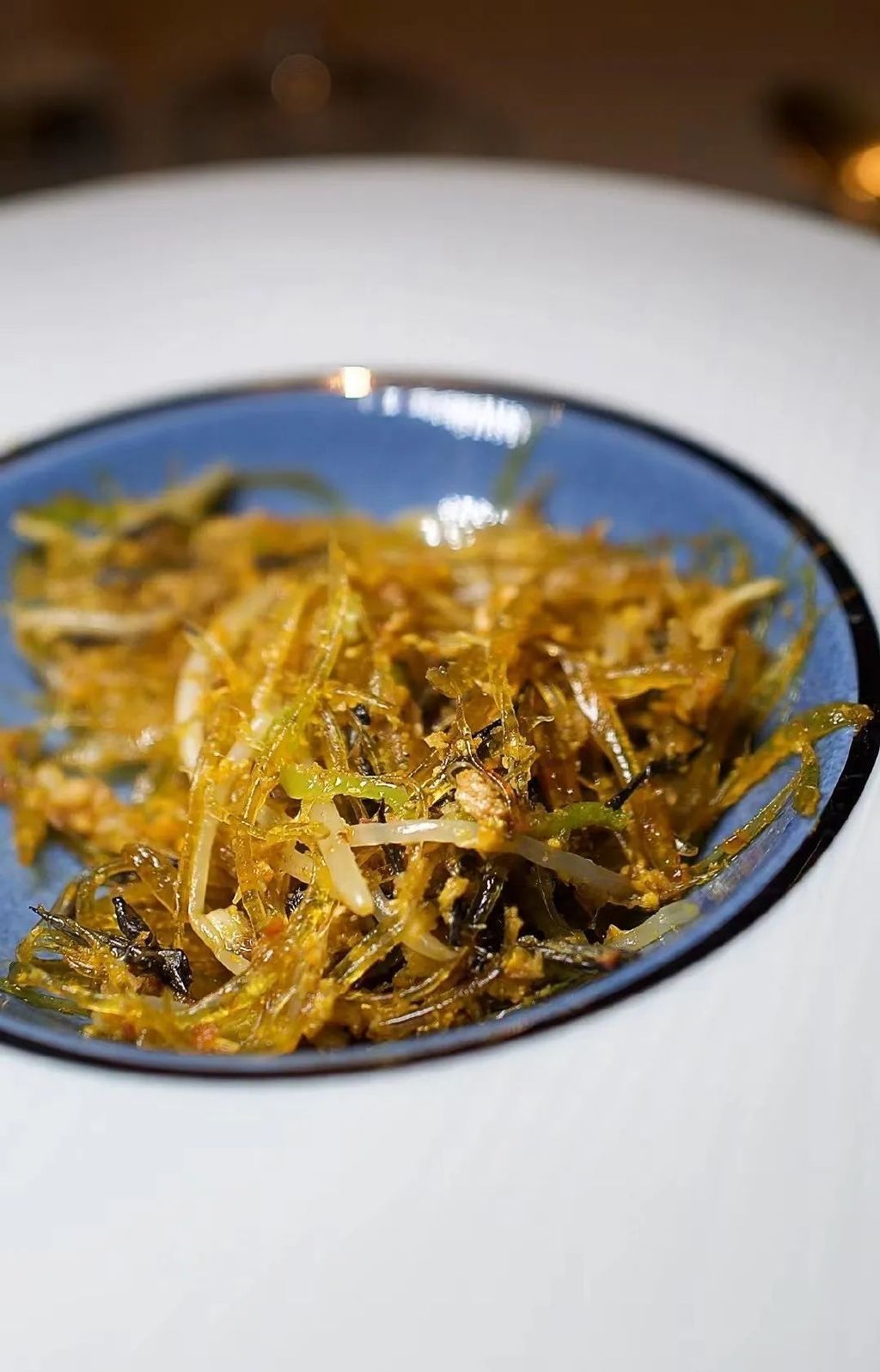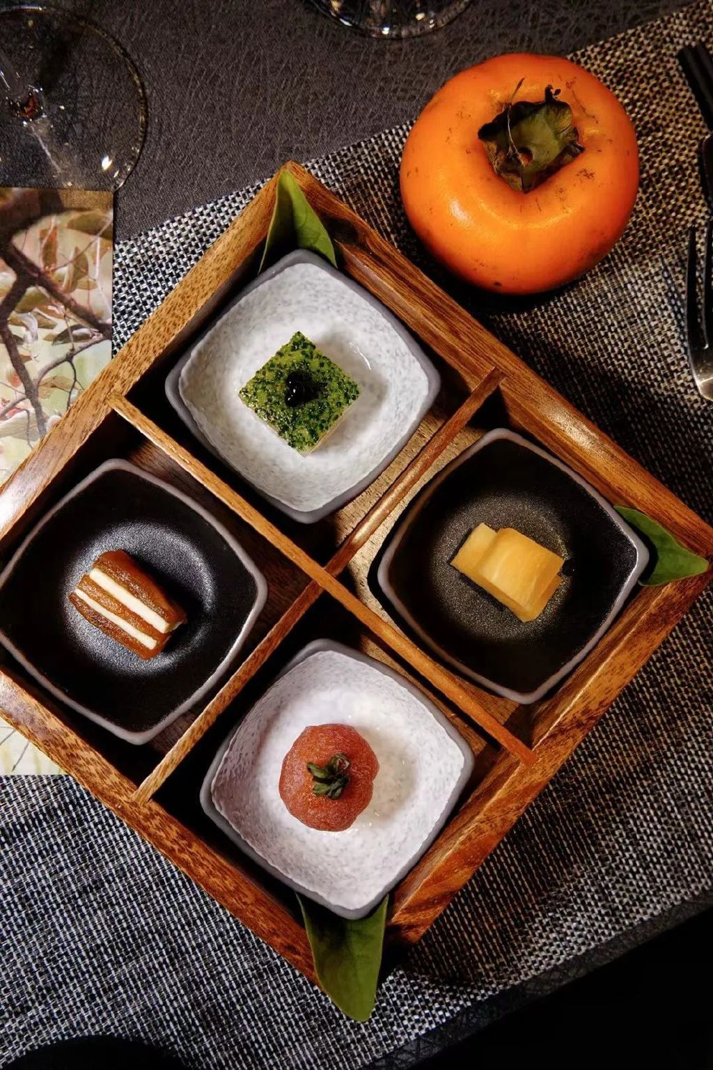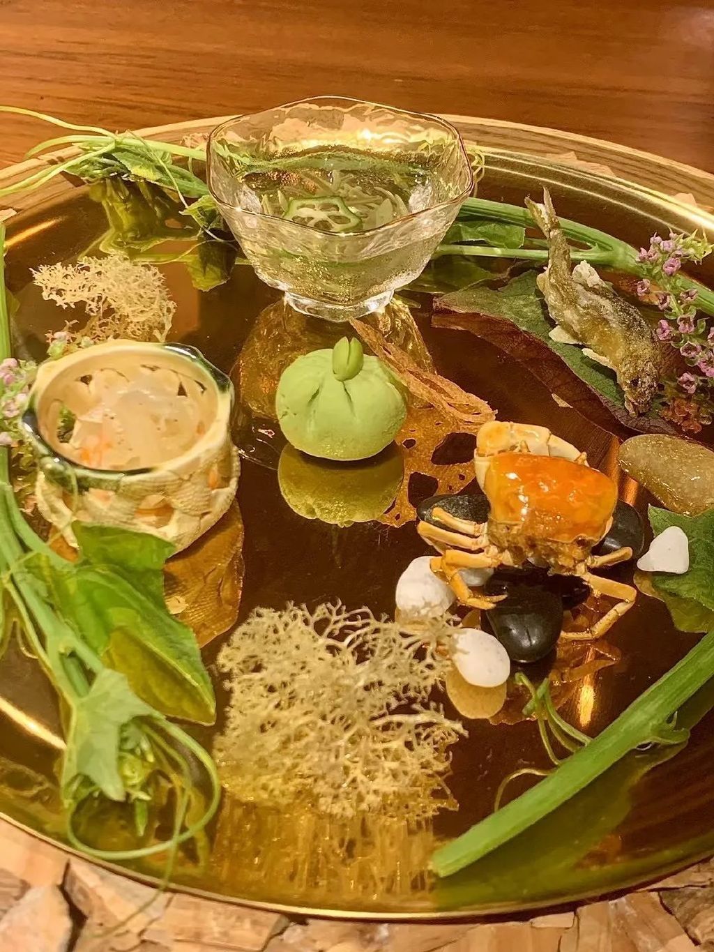这席宴的味觉灵魂是酸与咸的巧妙调和。酸味主调是柚子醋、苹果醋与土酢,一个香一个亮一个醇。而咸味就开花了,主厨创新用了鱼露、海苔、深焙烤过的樱花虾入菜。