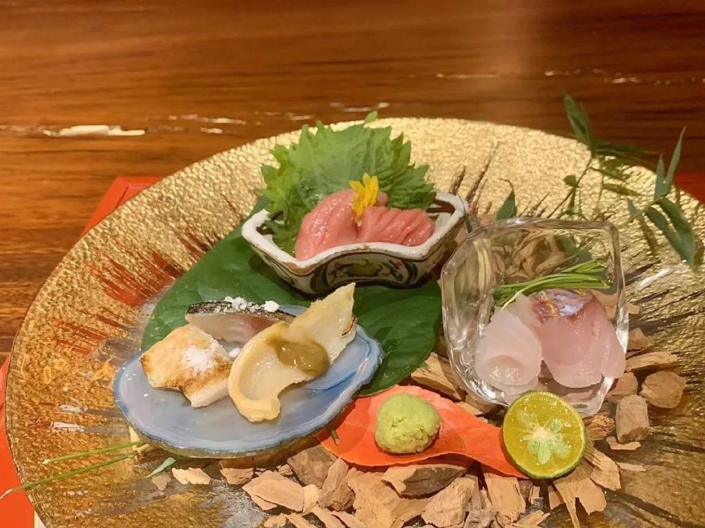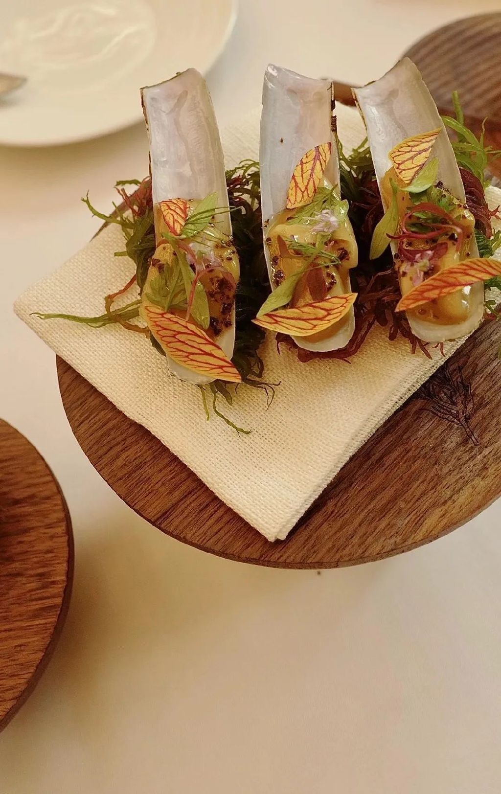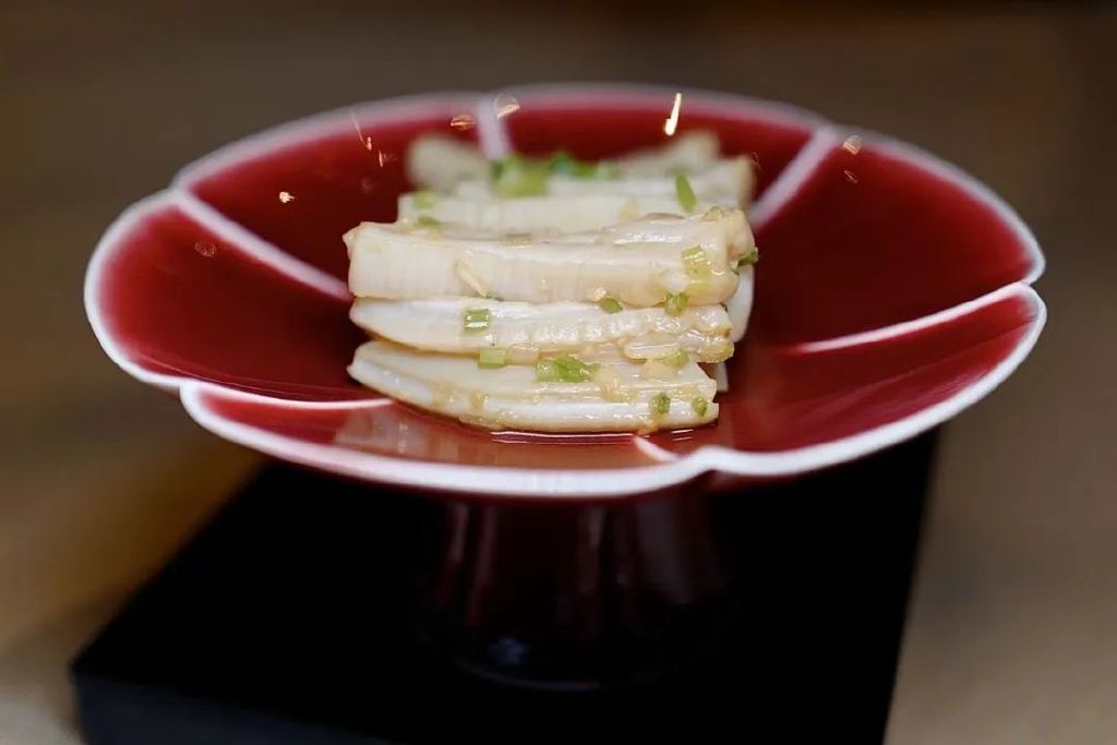 这席宴的味觉灵魂是酸与咸的巧妙调和。酸味主调是柚子醋、苹果醋与土酢,一个香一个亮一个醇。而咸味就开花了,主厨创新用了鱼露、海苔、深焙烤过的樱花虾入菜。