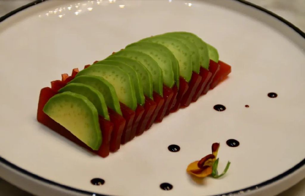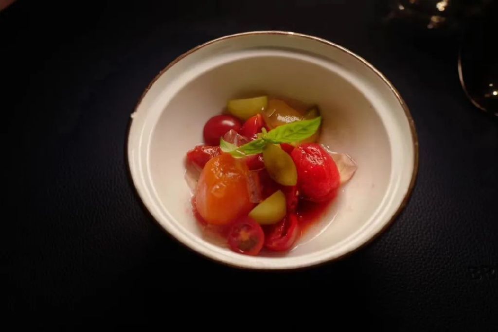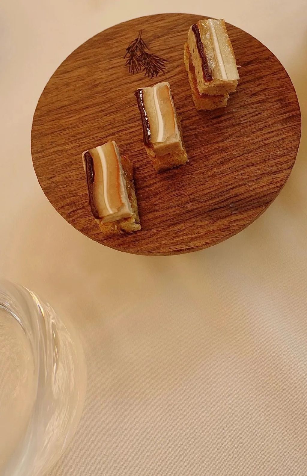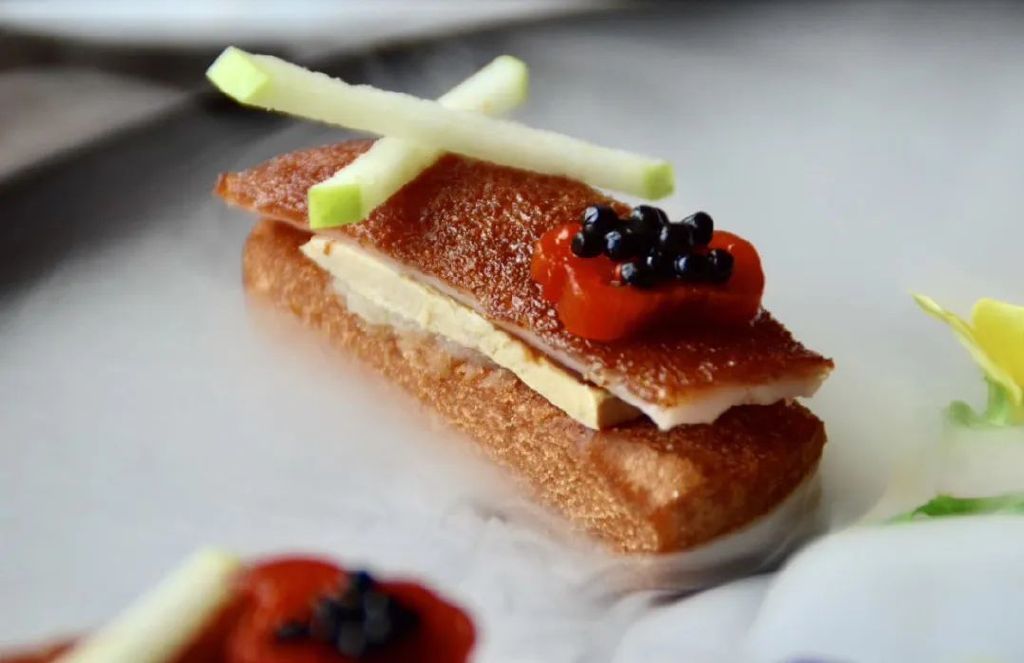 鹅肝乳猪手指饼是朱砂痣般的女孩,浓郁丰富,最好就着顶上的青苹果丝、腌西红柿和分子黑醋一口嚼。