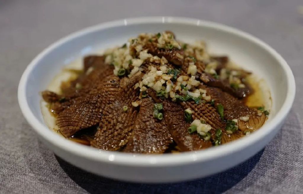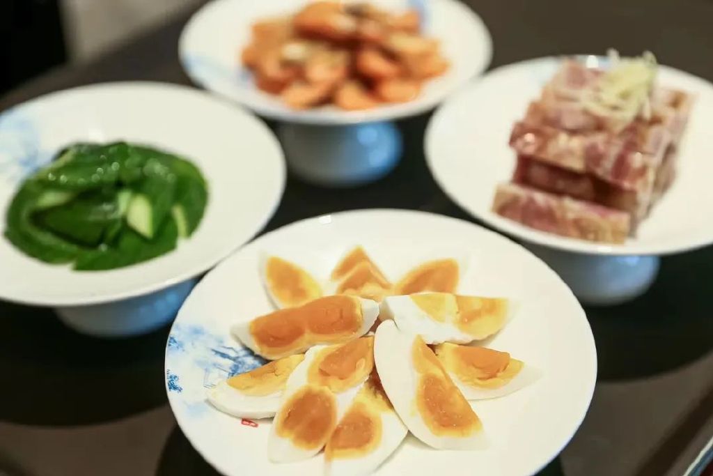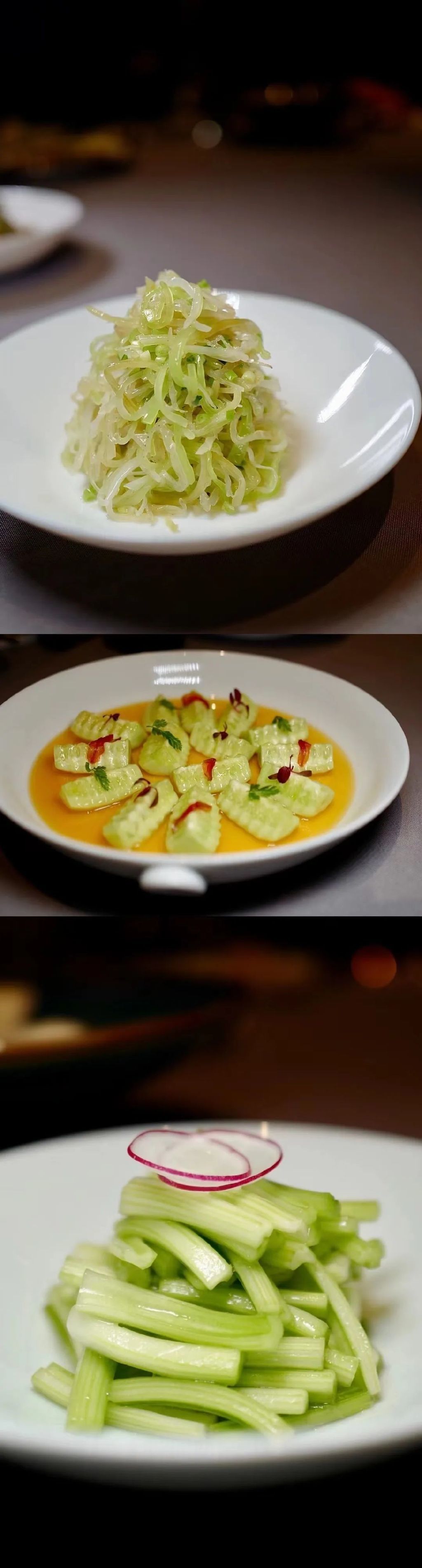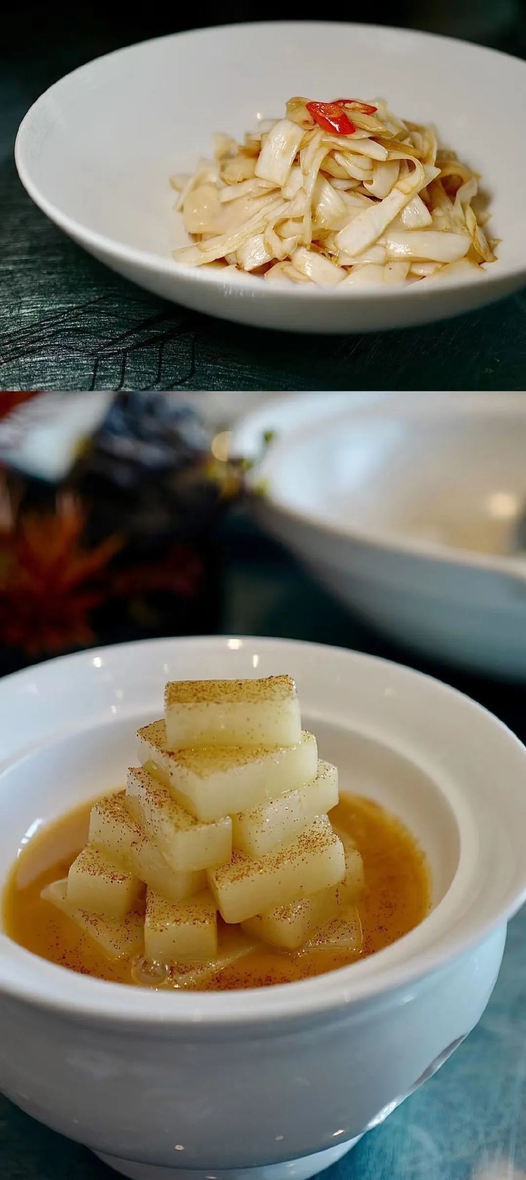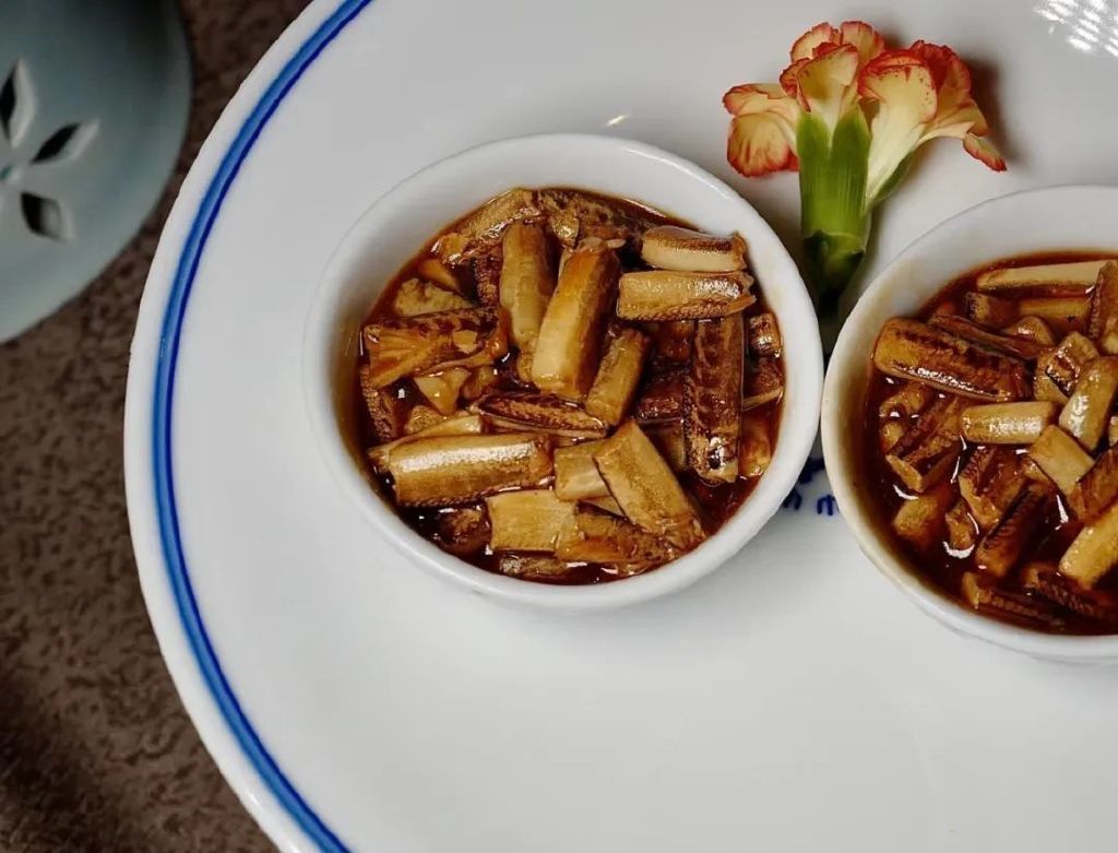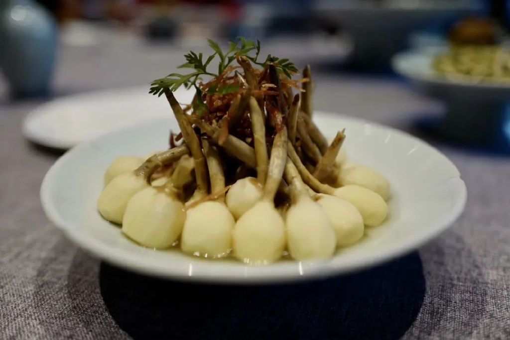大颗低温带子拌马兰头,紧弹钱塘江鳗卷梅干菜,烟熏马鲛鱼顶小撮红姜末。春笋嫩尖咸肉炖花胶,南宋傍林鲜上鲜。