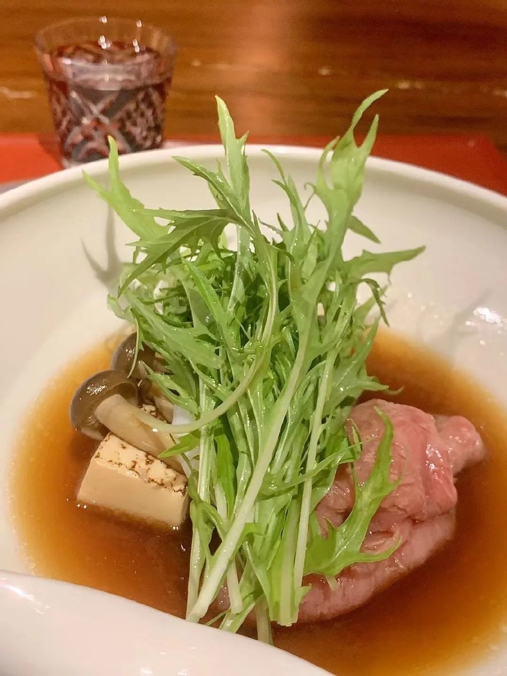 春生(春韭鱼子酱贝肉)、春芽(醋汁巧拌菊花菜)、春娶(临安小笋腐皮卷)、春深(酱汁生腌龙虾)四道冷菜是潘厨的表达心意,浦江牛肉、牛舌两片煮苦刺心的牛清汤温热过渡。