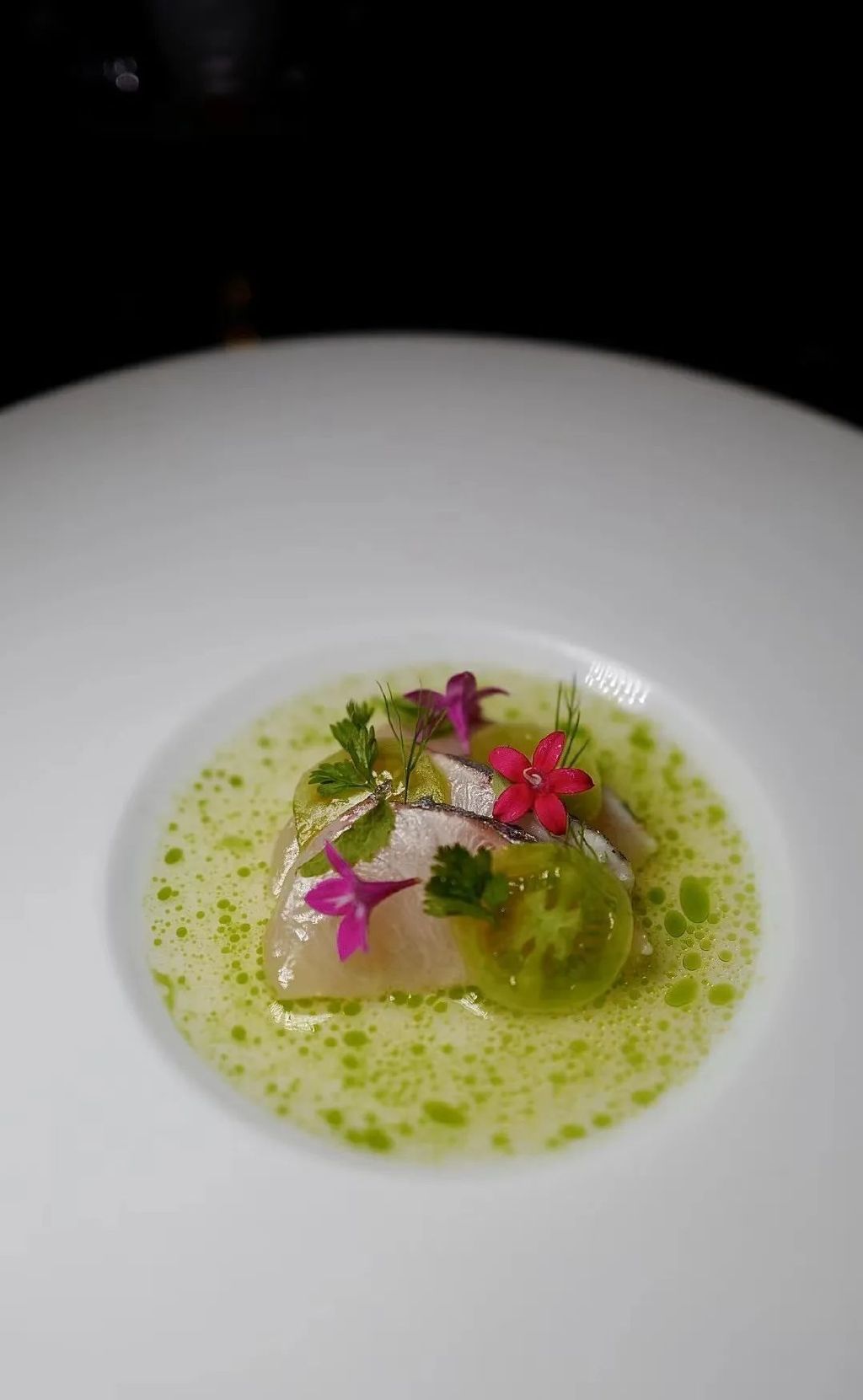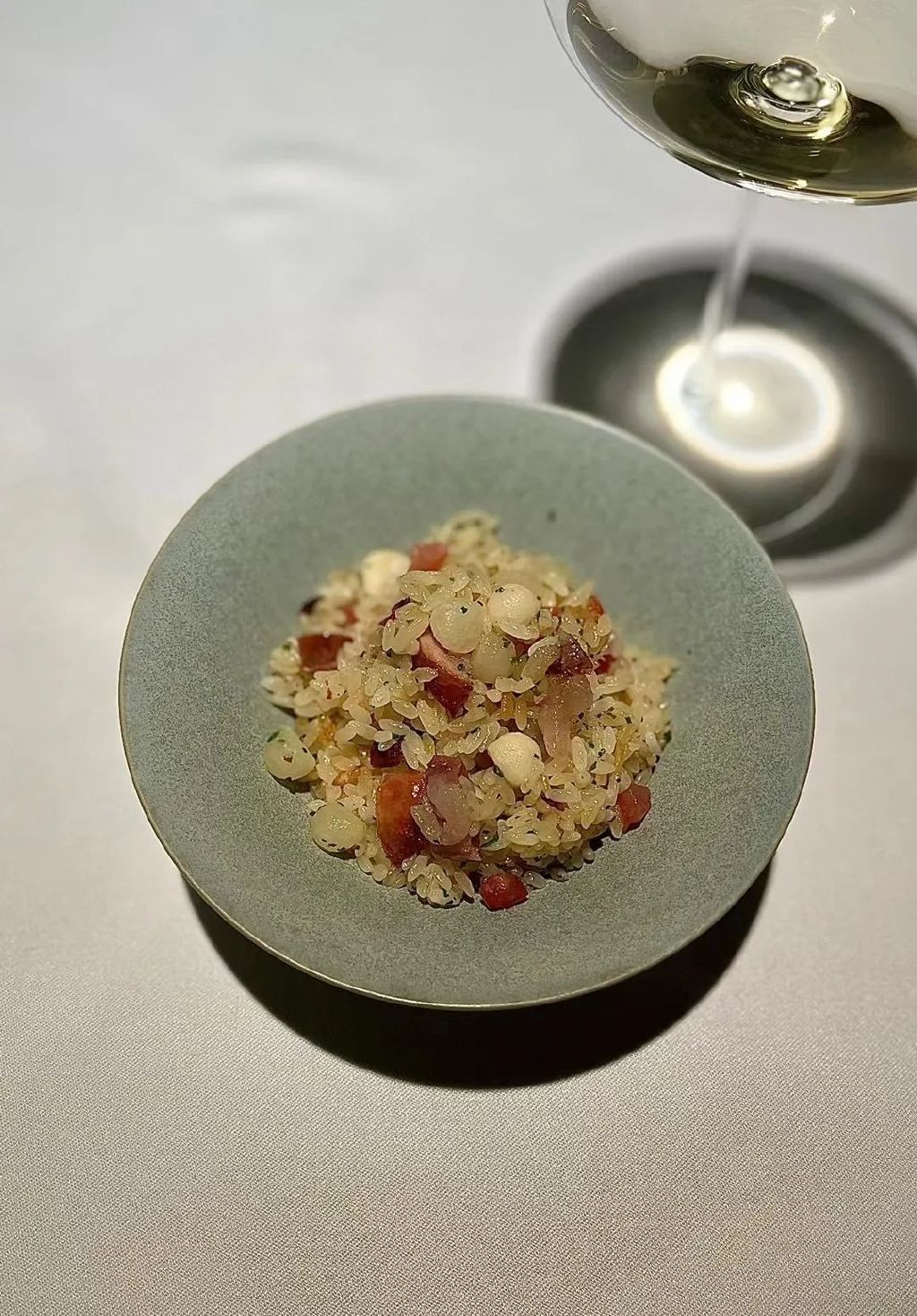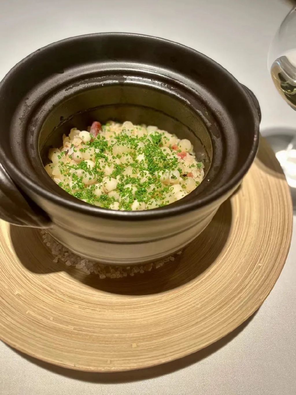 侍酒师Della特意选了Ricky此前在芒通Mirazur喝到的Chateau Simon,打开了吃货们的话匣子,轻度氧化的味道完美承接螃蜞蟹与腌仔蟹粉。我昨天惊艳于刺身级别的渤海大竹荚鱼,新疆沙棘和攀枝花番茄冷汤,江门香草小镇的柠檬香蜂草调味。这道的配酒是Markus Moliter酒庄罕见的干型Auslese的搭配,前调黄杏迷香,后调夹杂幽幽柠檬草香。