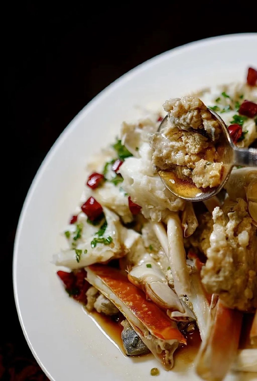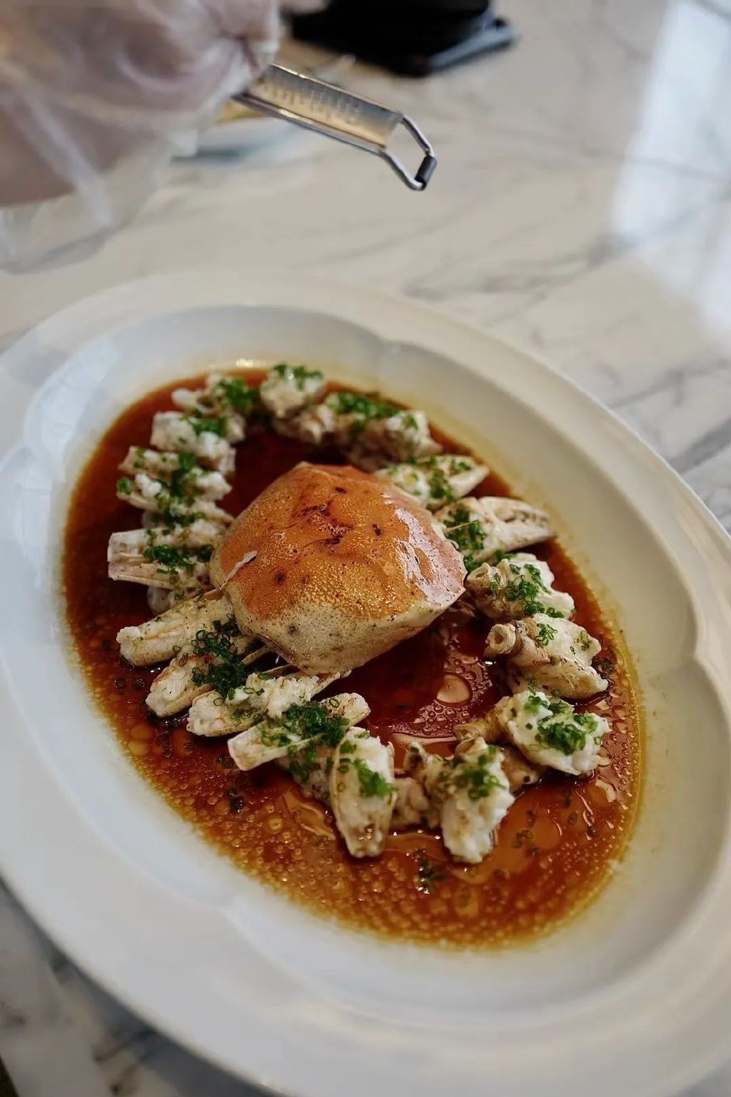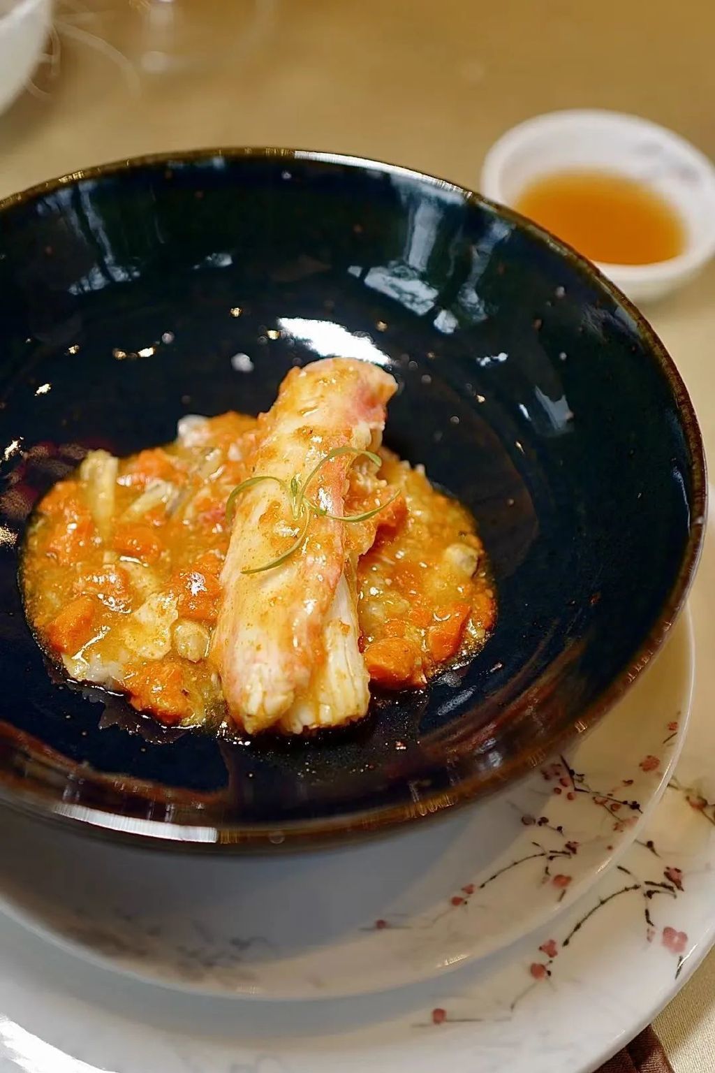 蒸双臭顶上是一片丰厚甲鱼裙边。一只饱满的帝王蟹腿,下面“枕”的是雌蟹黄与雄蟹膏双料慰藉。