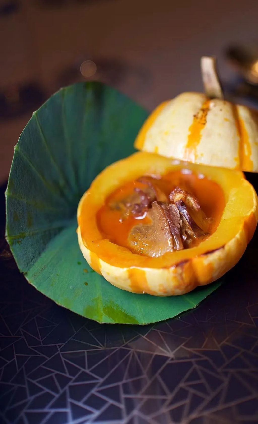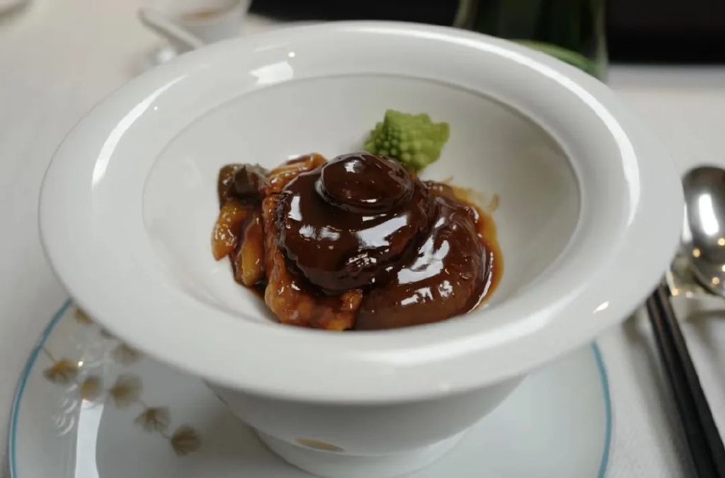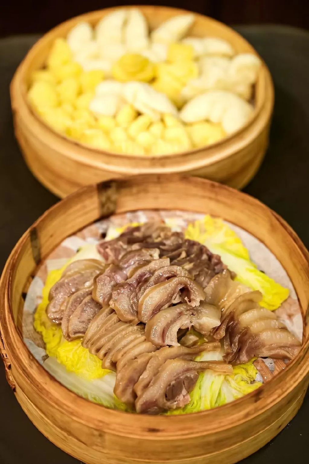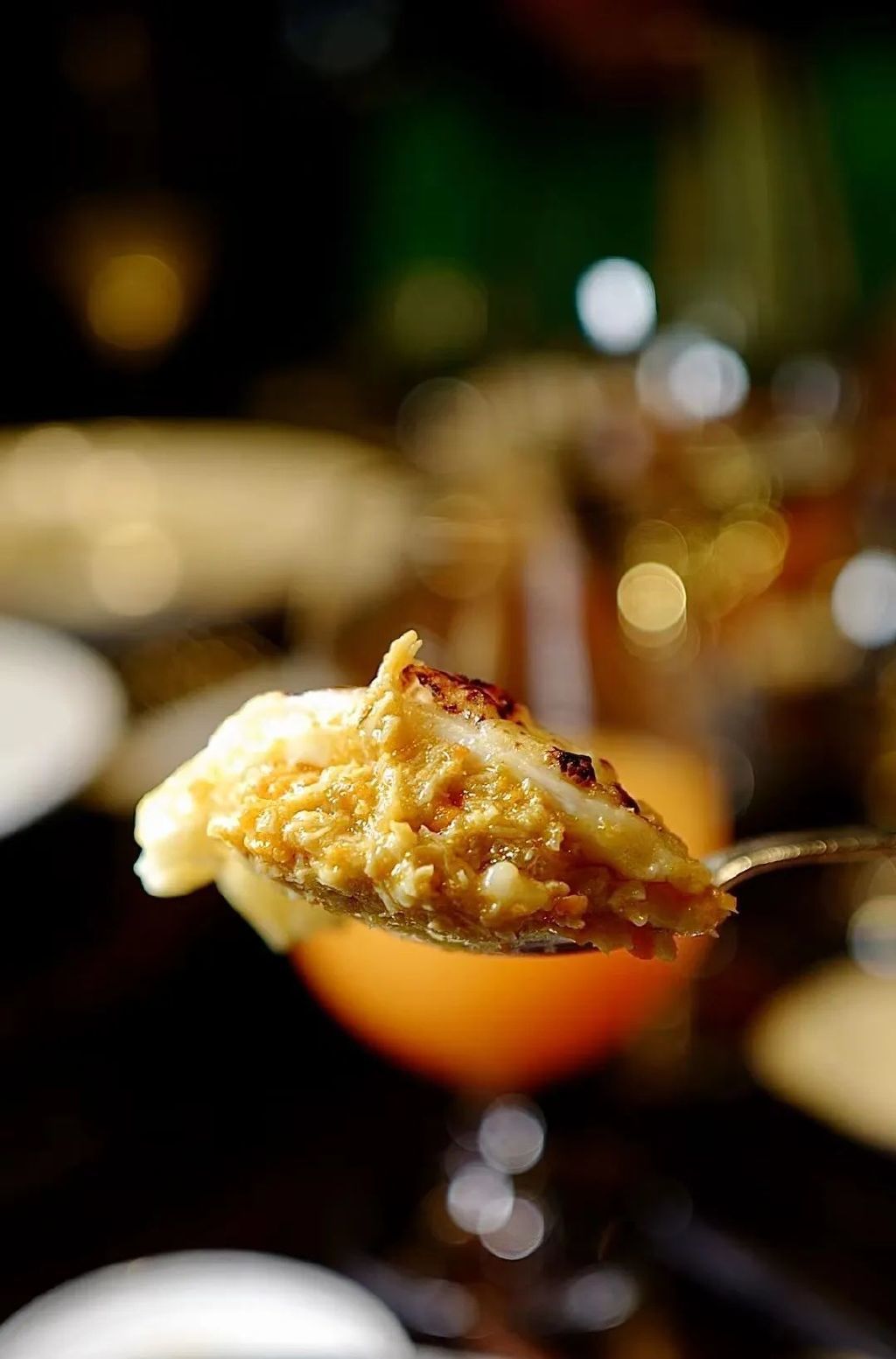蒸双臭顶上是一片丰厚甲鱼裙边。一只饱满的帝王蟹腿,下面“枕”的是雌蟹黄与雄蟹膏双料慰藉。