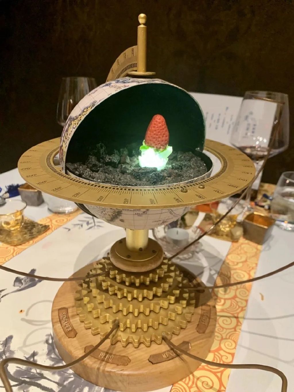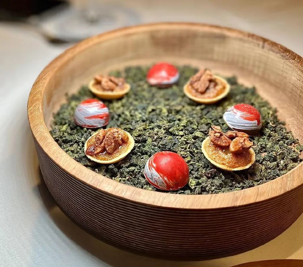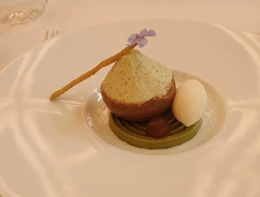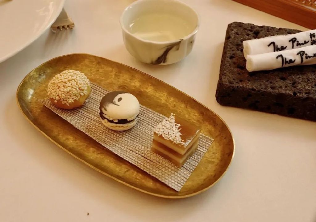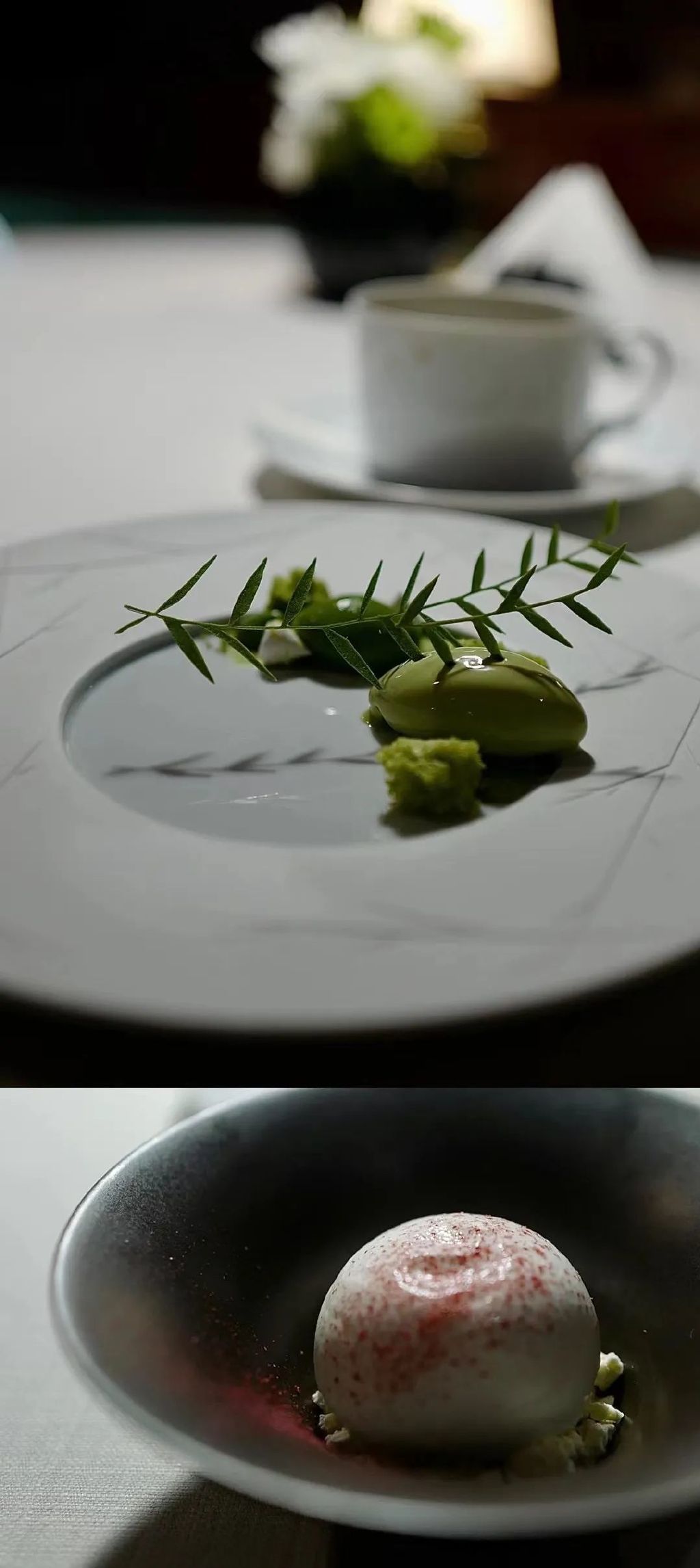 Predessert是一道清香的鸡尾茶,比现在国外的米其林前阵子特别流行的英国草本蒸馏酒神人Ben Branson出的有机seedlip要适合我。Petit four里有个枸杞蟹壳黄,顿时感觉在地融合的美好。对了,绿豆刨冰上的冻干薄荷粉像一声吊镲,漂亮!再次感叹,西餐的出手是吃得出的,跨界不是生搬硬套。