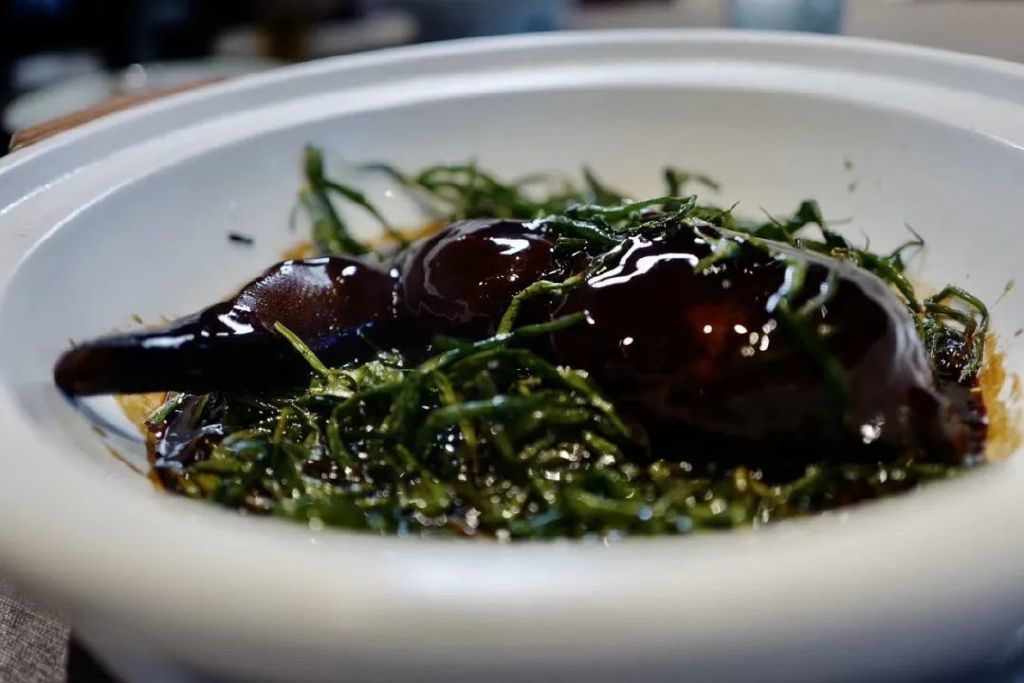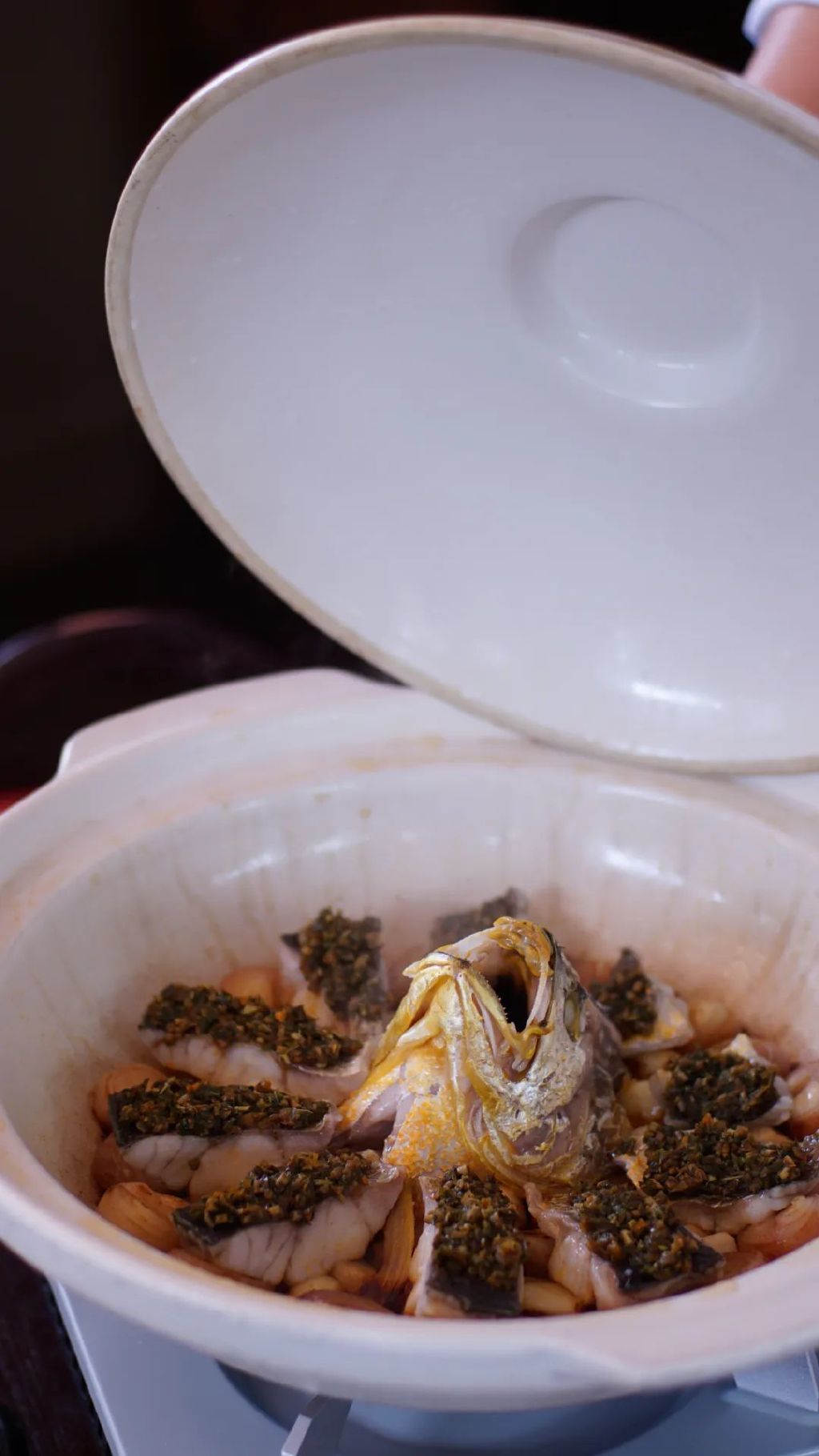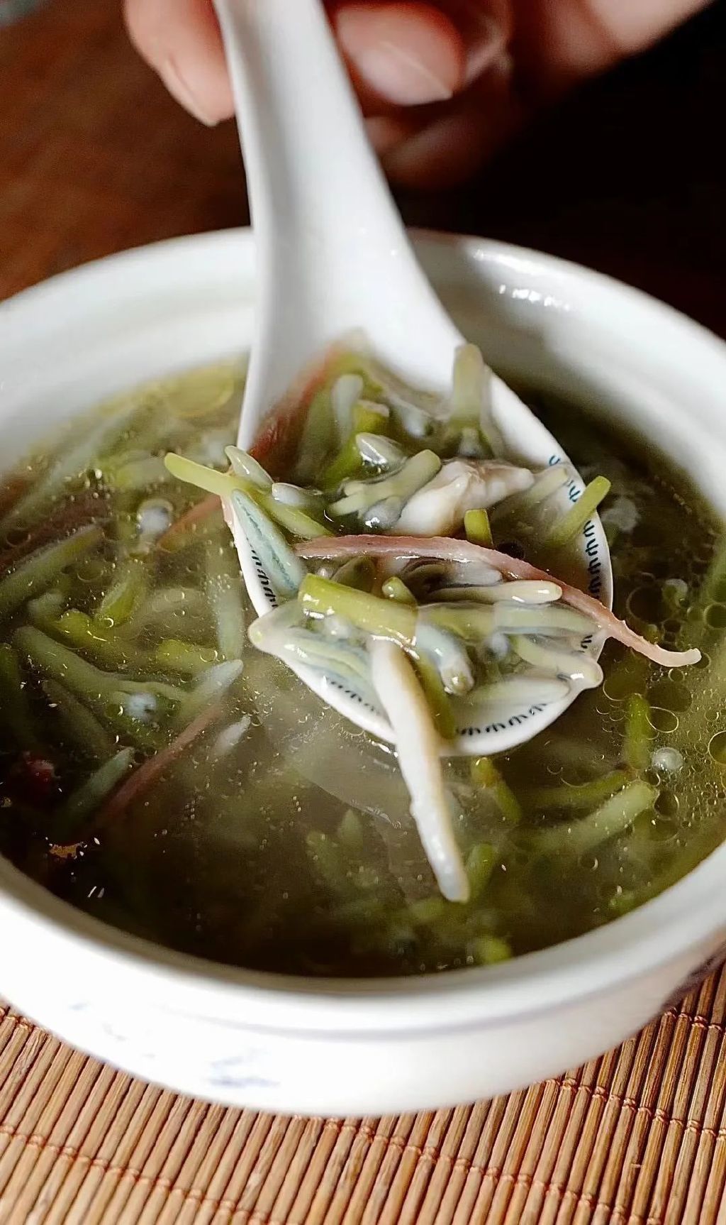 蚕豆碎入手打肉饼,铺上白鲳和鲜鱿合蒸,1+1>3的好吃。嘴里还在咸鲜,一阵”臭香”飘进鼻子,霉苋菜汤煮象拔蚌,汤深得发酵物狂魔的心。
