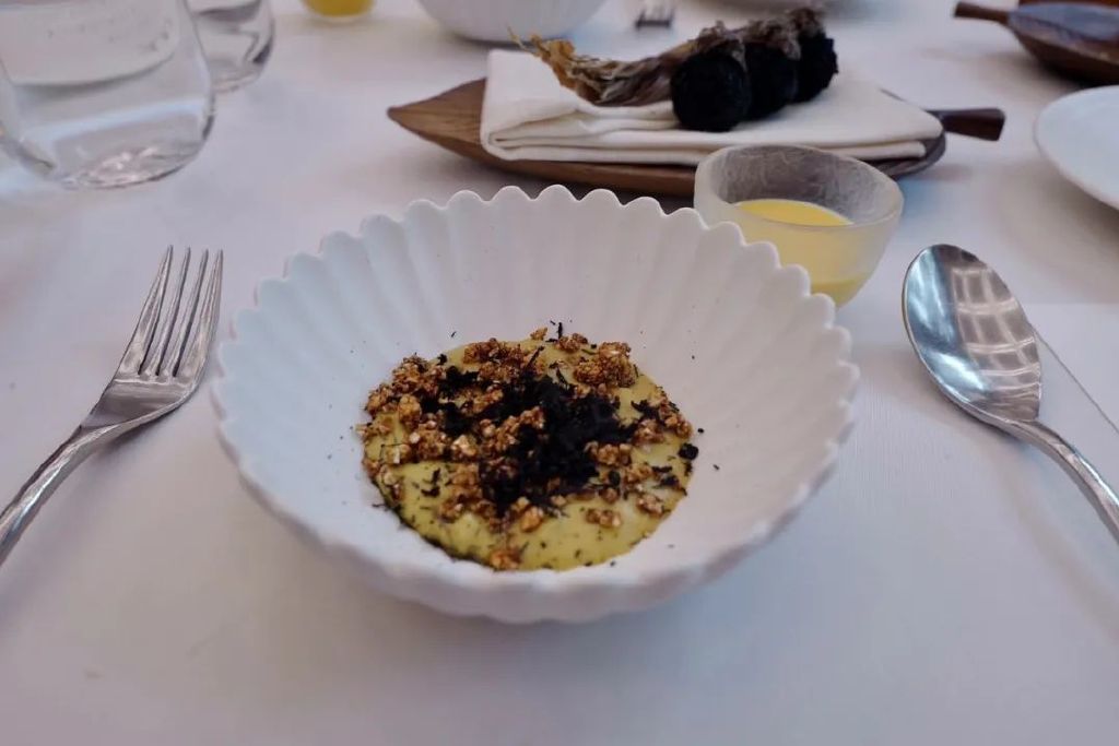 早起就想吃一口Ensue的“粥”。这道菜的灵感来自意大利阿尔巴同一纬度,北纬44.7度。所谓用纬度做饭,用这道“阿城大米配在地豆浆”做例子就很合适。沿着中国相同纬度,使用阿城种植水稻、加五常糯米,再用小兴安岭的豆浆糊化它们,嘴里就一个混沌的美字!
