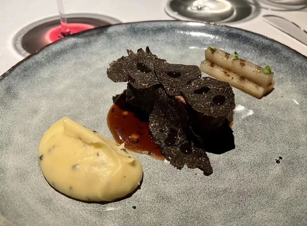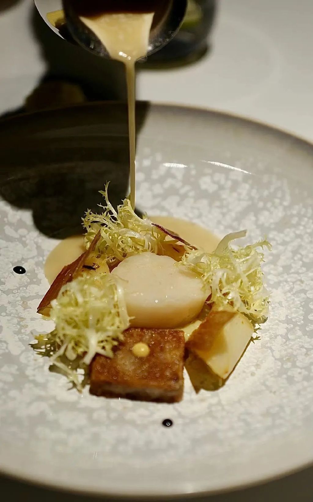 一个月来吃了两次莱美露滋,我还是觉得胆子大得有新意。这次令我印象深刻的是圣诞季冬季菜,主厨把扇贝与黑松露一层层漂亮叠好,包裹上黑松露与包菜的薄“外壳”,两半合起来又是一块黑松露。