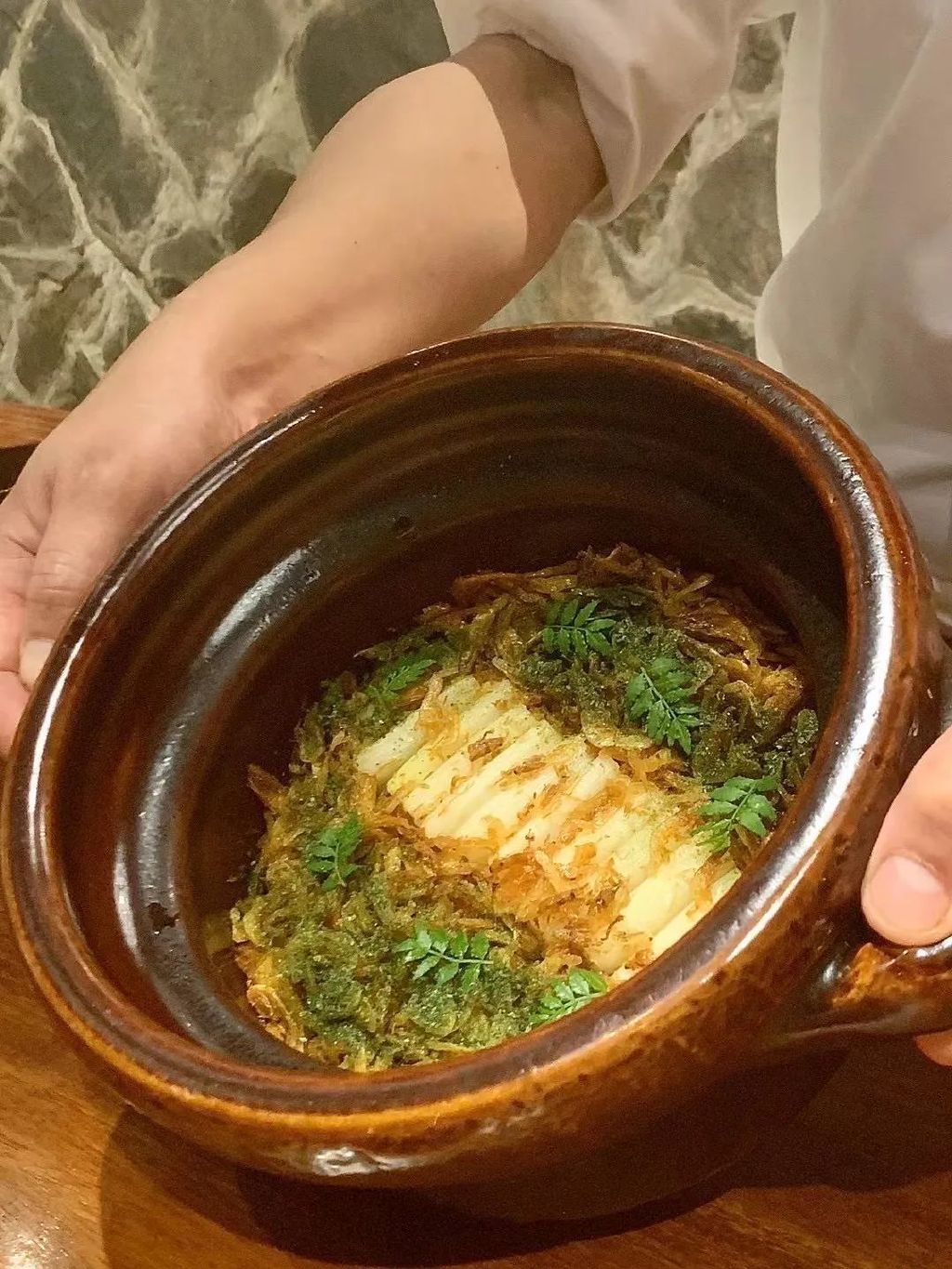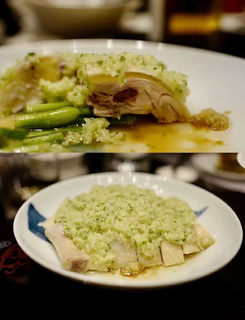 香椿蚕豆泥海胆溏心蛋,多层次的柔美清甜流淌着,把我多年来对香椿的抵抗全部都治愈了,两口吃完,只有春天撩人的气息充盈口腔。姜蓉葵香鸡好吃飞了,我是追不上的。