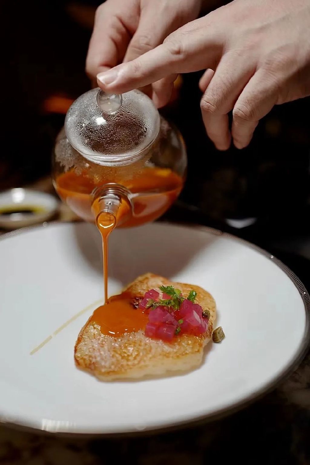 中餐西做要突破边界,最怕不野。Eric的勇敢尝试,让他对食材质感的参悟,比以往更进一大步!玫瑰红曲南乳汁牛排那种恰如其分的五分,已经不能代表他的水准了。