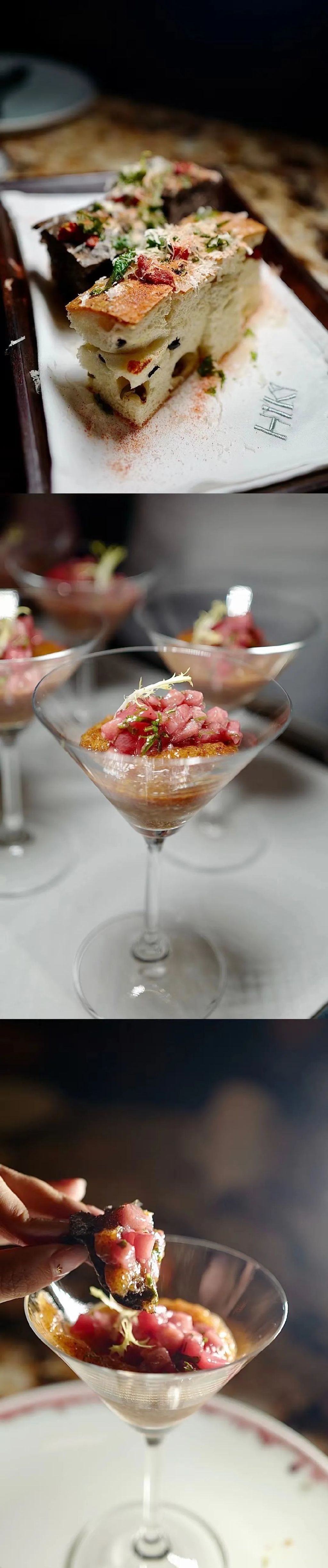 昨夜我终于吃上今秋第一口和歌山黑柿子,配的熟成蓝鳍金枪鱼塔塔,这拿来蘸蓬松又带脆皮的老面佛卡恰刚好,黑色的是墨鱼汁味。我喜欢里面自然风干的西红柿香,特别浓郁,意大利人吃到会嫉妒。